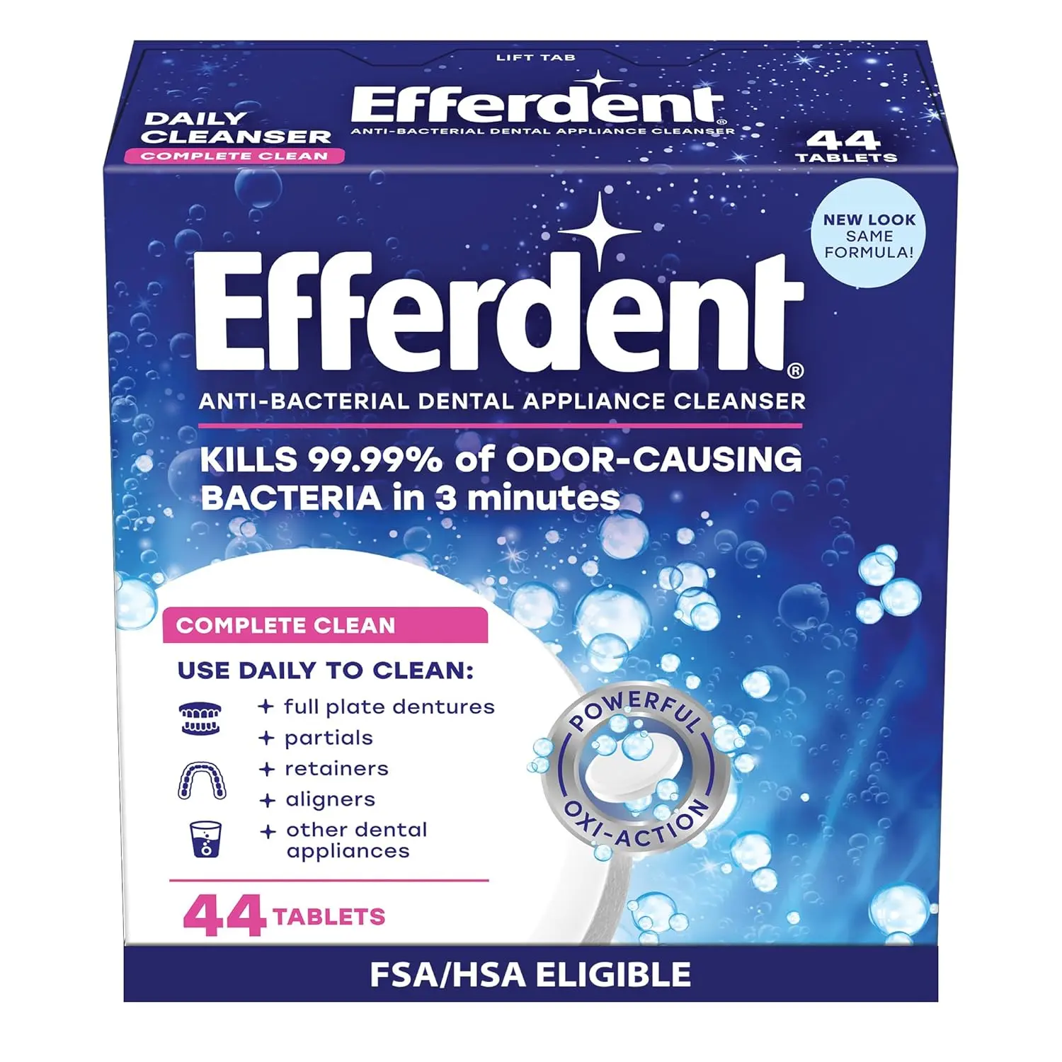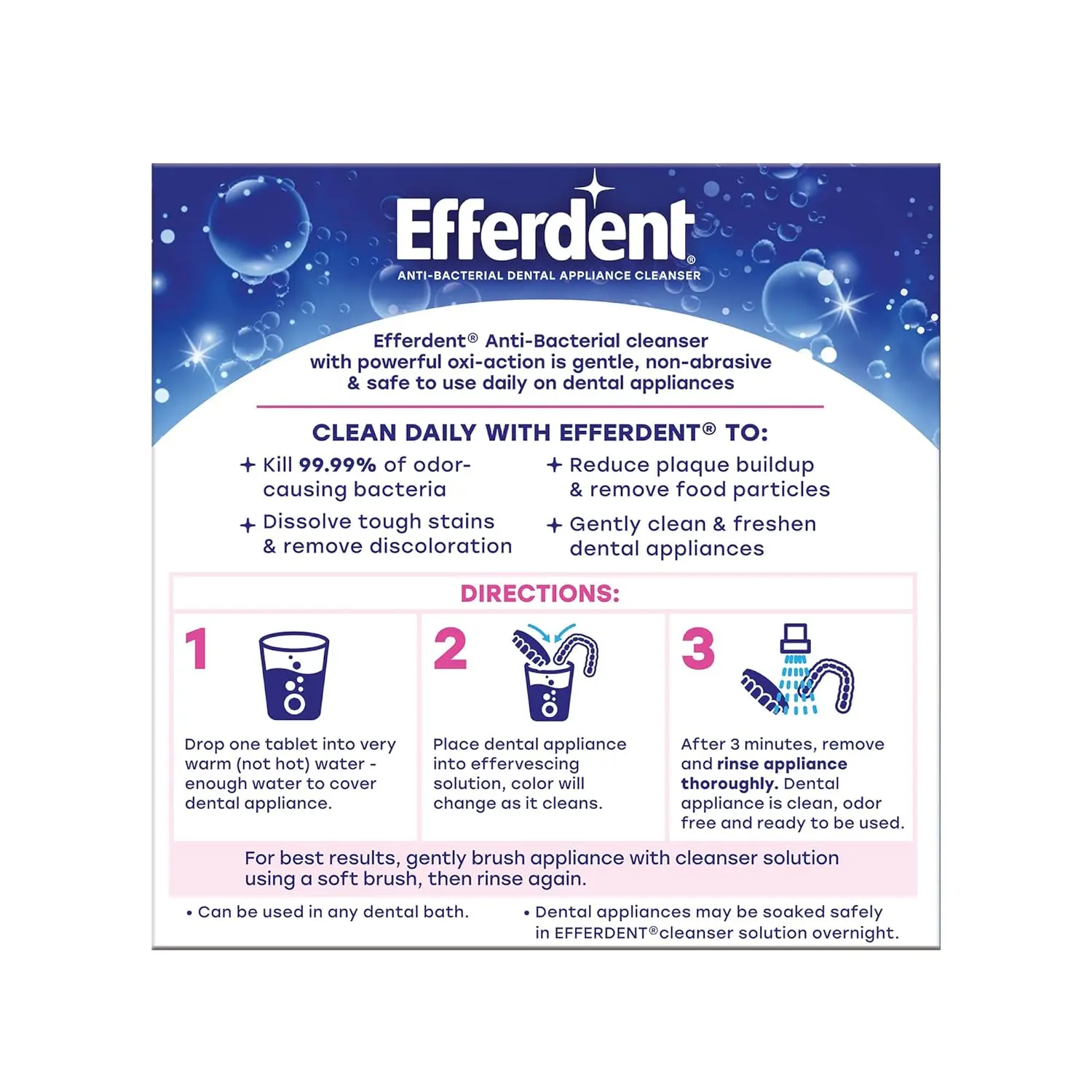 Maintain a sparkling clean and fresh oral appliance with Efferdent Denture Cleaner Tablets. This powerful 5-in-1 effervescent cleaning system actively cleans, whitens, and freshens your retainers, dentures, and other dental appliances. Say goodbye to stubborn stains and odor-causing bacteria. Our formula kills 99.9% of odor-causing bacteria, ensuring your appliance is hygienically clean. The powerful oxi-action effectively removes even the most stubborn stains in those hard-to-reach places, restoring your appliance to its original brilliance. Use daily to keep your retainers, full-plate dentures, partials, and other dental appliances in top condition. Efferdent reduces plaque buildup and removes food particles that can cause gum irritation, promoting better oral hygiene and a healthier mouth. Enjoy the confidence of a clean and fresh appliance with Efferdent. Its effervescent action delivers a deep clean, reaching areas that brushing alone can miss. Keep your smile bright and your appliance feeling like new with regular use of Efferdent Denture Cleaner Tablets. Don’t settle for anything less than the best when it comes to the cleanliness and maintenance of your dental appliances.