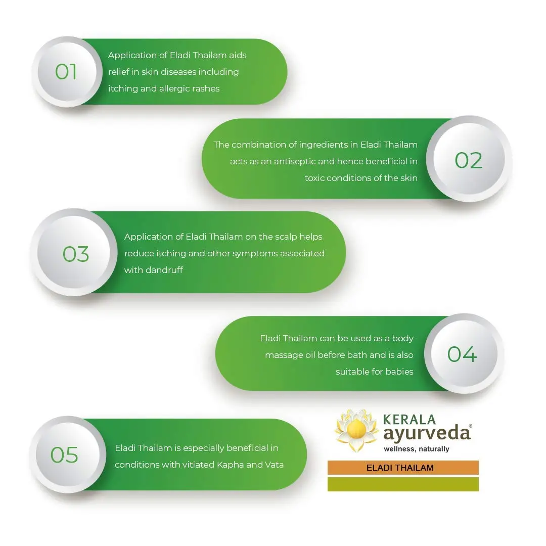Discover the ancient secret to radiant, clear skin with Kerala Ayurveda Eladi Thailam. This 300ml bottle of traditional Ayurvedic Thailam is expertly crafted with sesame oil as its base, infused with potent herbal ingredients to combat acne, skin ailments, and promote a healthy, glowing complexion. Eladi Thailam isn’t just a treatment; it’s a holistic approach to skincare, working to detoxify the skin by flushing out toxins and excess water. Experience the instant radiance and glow as this Thailam addresses skin pigmentation and stubborn acne breakouts. Regular use offers relief from skin irritations such as itching and allergic rashes, soothing and calming the skin. Its antiseptic properties are beneficial in managing toxic skin conditions. Beyond its therapeutic benefits, Eladi Thailam serves as an exceptional massage oil, deeply nourishing the skin, strengthening bones, and revitalizing muscles. Embrace the power of Ayurveda for naturally beautiful and healthy skin. This 100% herbal and natural formulation is free from added fragrances, colors, chemicals, parabens, mineral oil, and petroleum by-products, making it a safe and effective choice for all adults seeking a natural skincare solution. Follow the usage instructions as directed by your physician for optimal results.