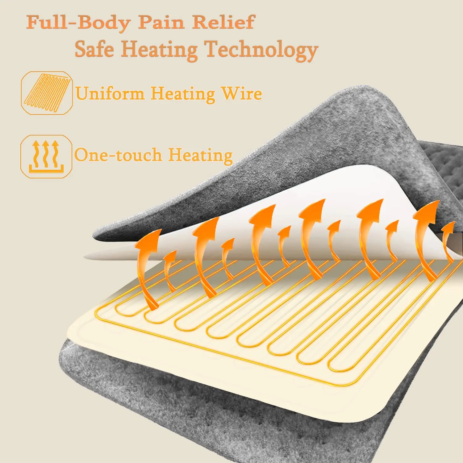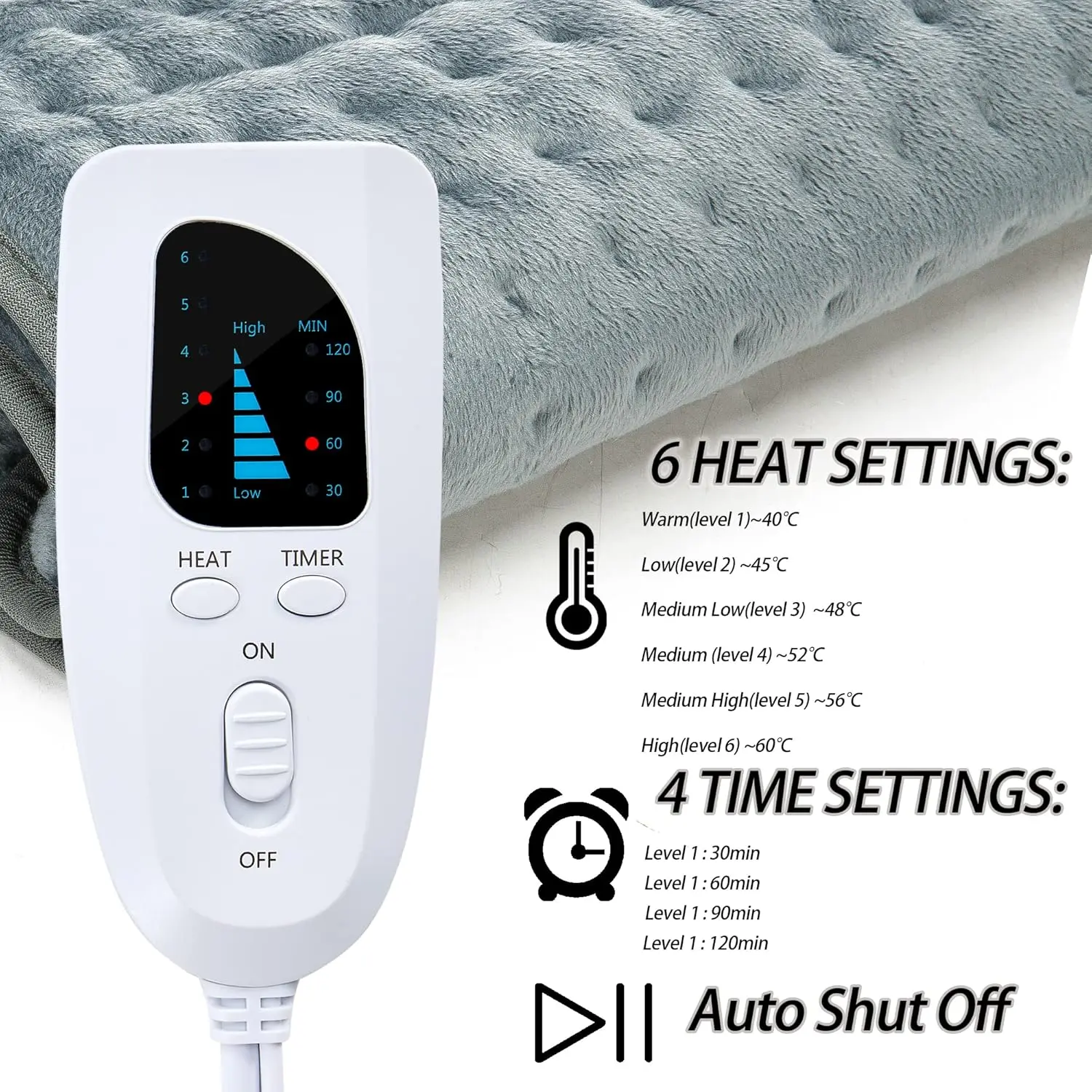 Safety is paramount. The auto shut-off function features four timer settings (30, 60, 90, and 120 minutes), automatically turning off the pad for worry-free use. An intuitive ON/OFF button switch and an IC controller with LED indicators make operation simple and straightforward.