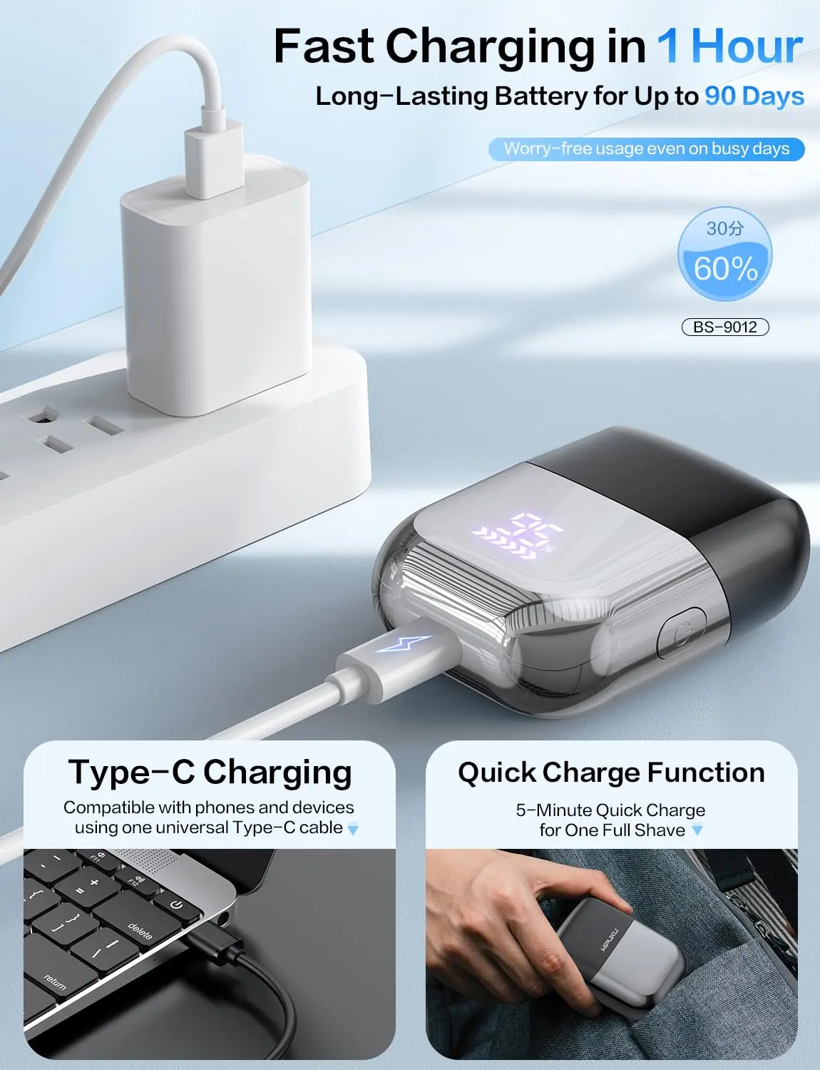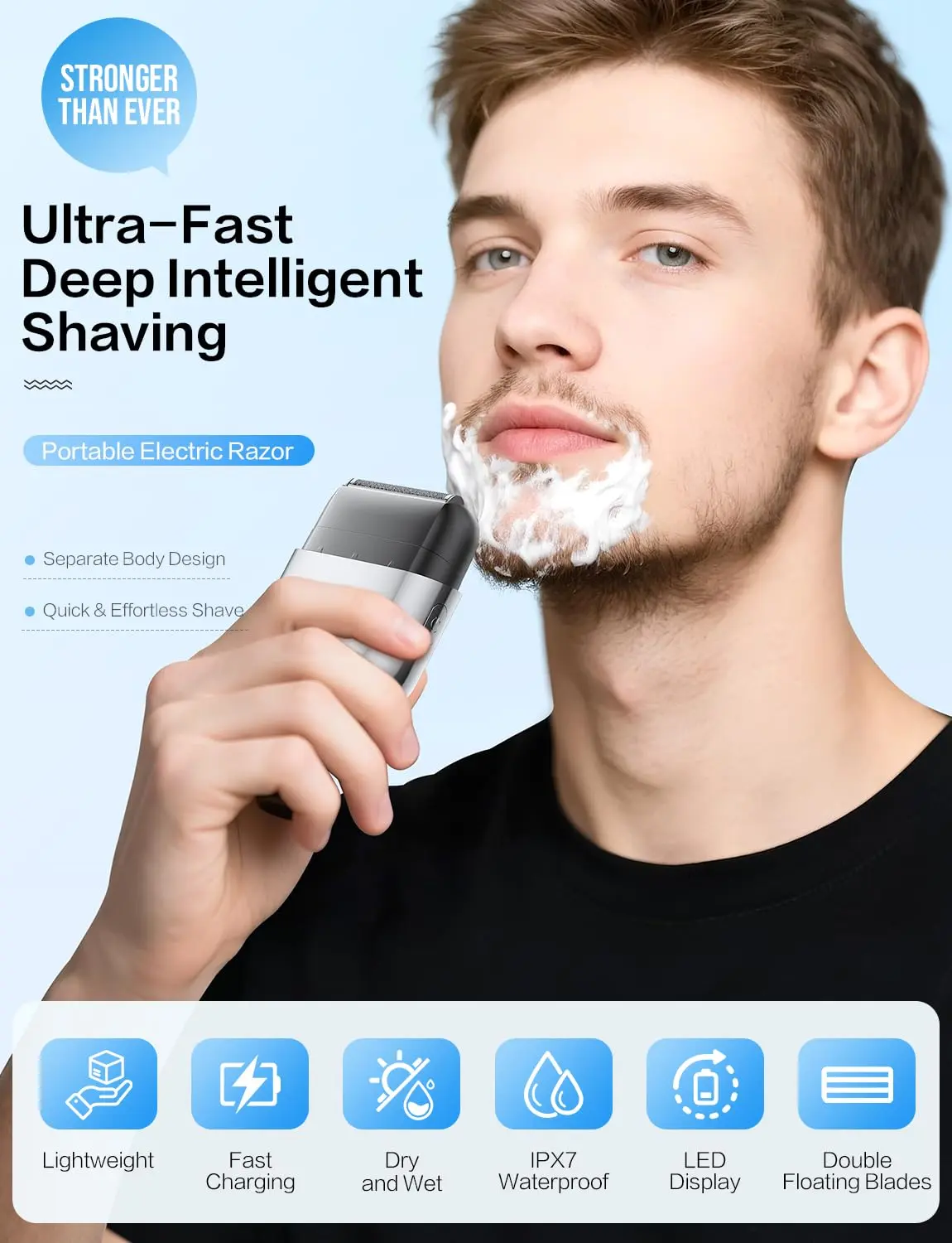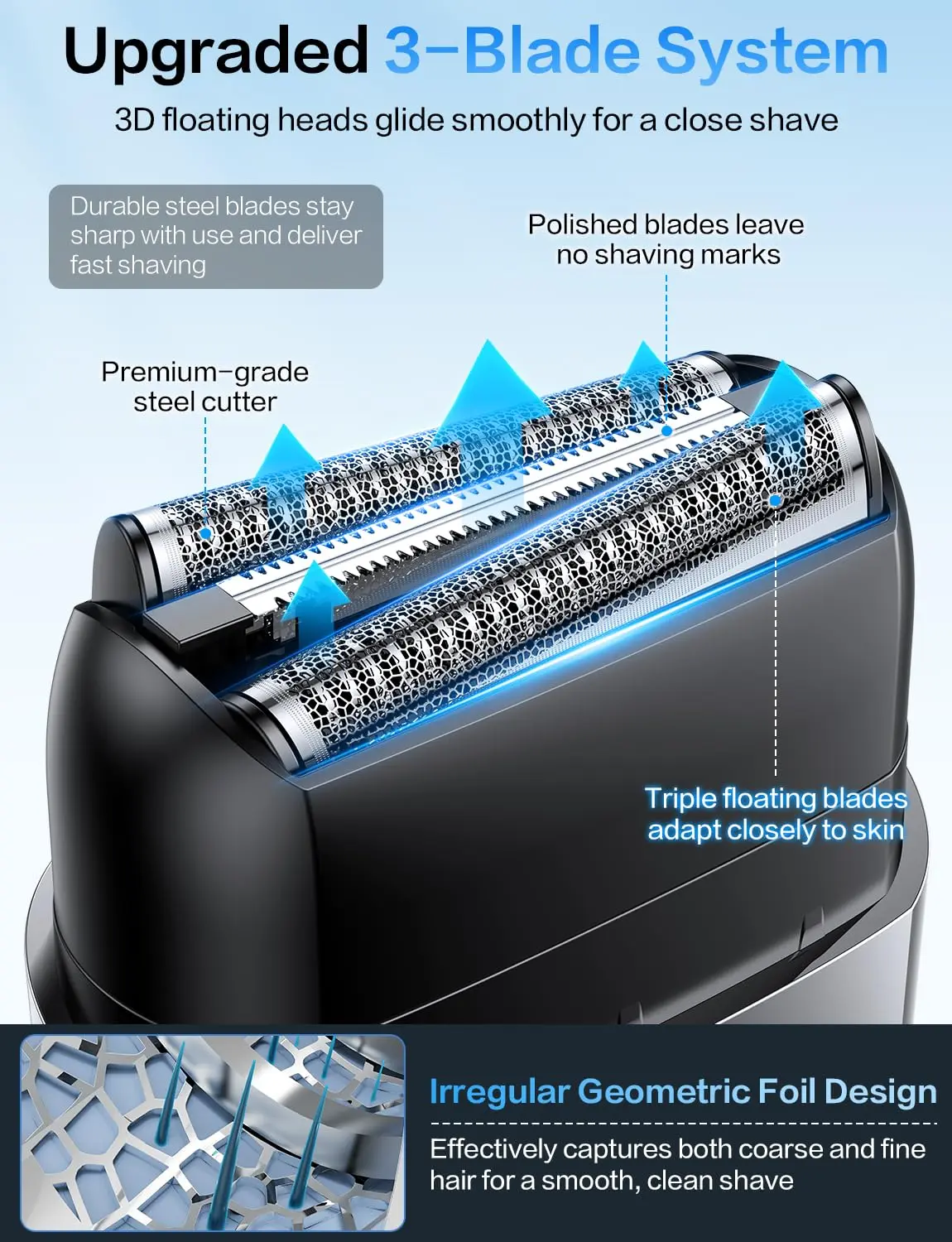 Experience a superior shave with our Electric Razor for Men, designed for ultimate comfort and precision. This foil shaver features skin-friendly curved steel blades and smart sensing technology that effortlessly adapts to your facial contours, delivering a smooth, irritation-free shave every time. The innovative floating head design prevents hair pulling, ensuring a comfortable shaving experience. Our optimized blade design, perfected through rigorous ergonomic testing, ensures an effective shave for both short beards and longer stubble. The combination of foil and long beard trimming heads guarantees precise and easy trimming for all beard types. Enjoy fast charging and long-lasting power with USB-C fast charging, fully charging in just 90 minutes and providing up to 100 minutes of continuous use. The upgraded LED battery display allows you to easily monitor the charge level, so you’re always ready for your next shave. The IPX7 waterproof rating makes this razor safe for use in the shower and compatible with shaving foam, offering versatile wet or dry shaving options. Cleaning is a breeze – simply rinse the razor head after each use to maintain peak performance. Its compact and travel-friendly design makes it the perfect grooming companion for on-the-go. A magnetic dustproof cap keeps the blades clean, and the travel lock function prevents accidental activation, ensuring hassle-free grooming wherever you are.