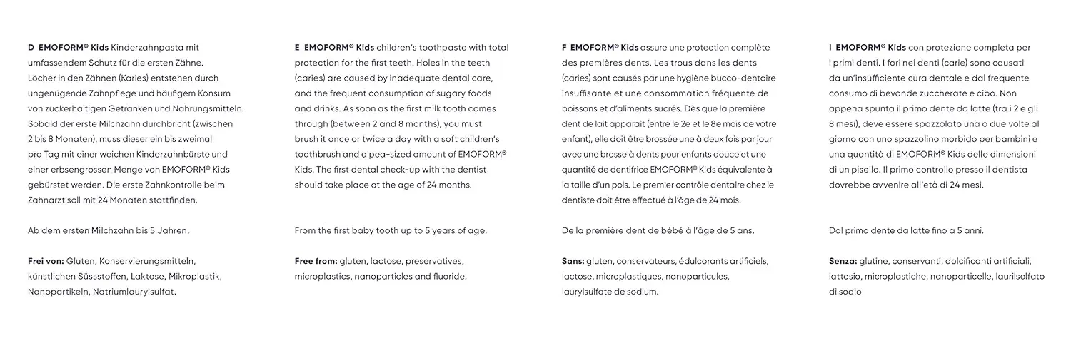 Protect your little one’s precious first teeth with Emoform Kids Toothpaste! Specifically formulated for children from the very first tooth eruption (typically between 2 and 8 months) up to 5 years old, Emoform Kids provides total protection against caries. Gentle yet effective, this toothpaste should be used once or twice daily with a soft children’s toothbrush. Simply apply a pea-sized amount to safeguard those developing milk teeth. Remember, a child’s first dental check-up should be scheduled around 24 months of age. Emoform Kids is thoughtfully crafted to be free from gluten, preservatives, lactose, microplastics, nanoparticles, sodium lauryl sulfate, and artificial sweeteners, ensuring a safe and worry-free oral care routine for your child. Start your child on the path to a lifetime of healthy smiles with Emoform Kids!