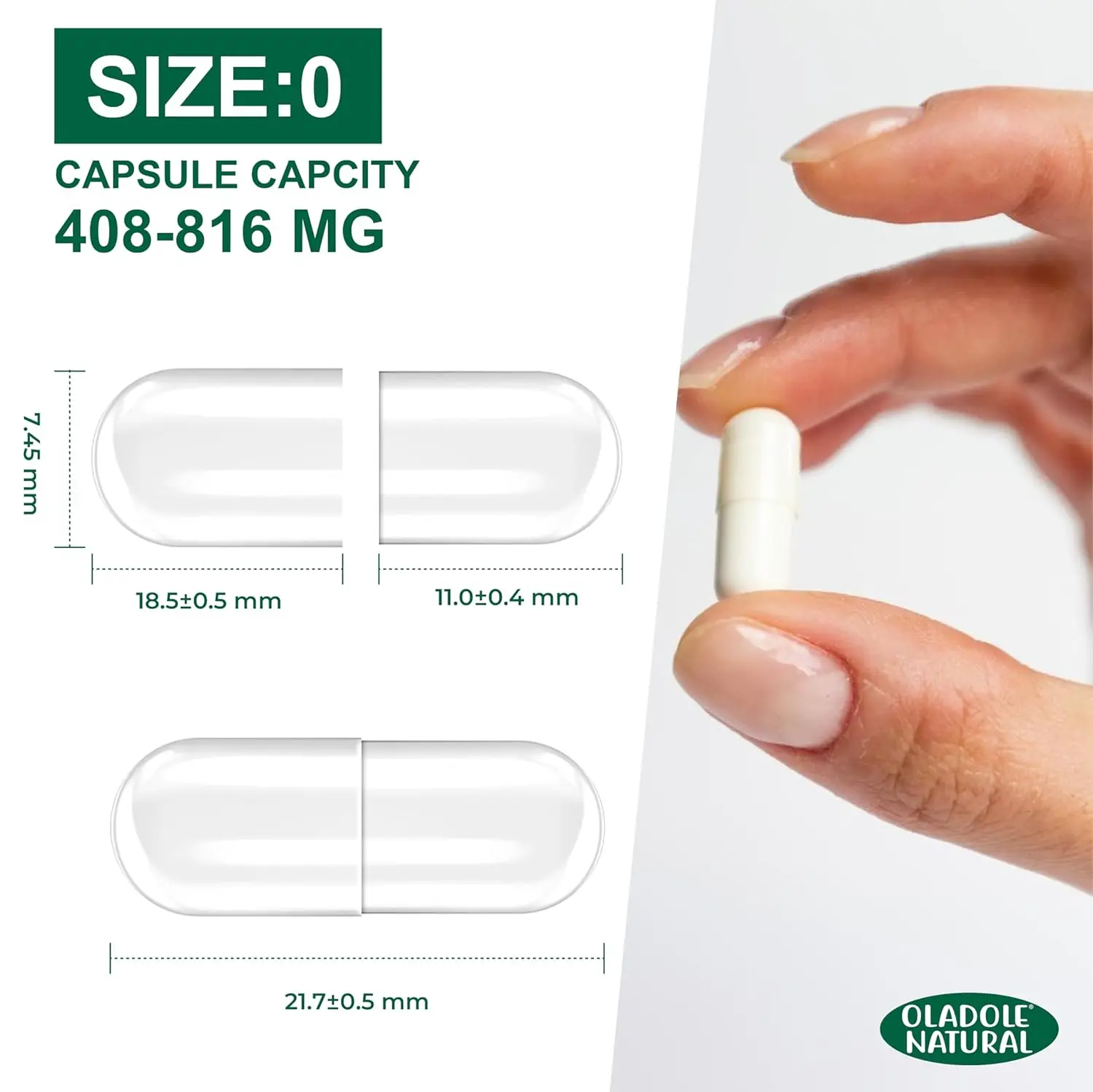 Oladole Naturals Empty Vegan Capsules Size 0 – Plant-based capsules for easy DIY supplements. Perfect for herbs, vitamins, and medications. Secure click-shut design.