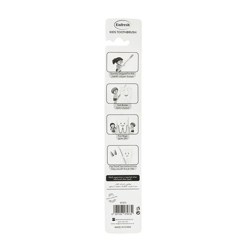 The Enfresh Kids Toothbrush is designed for children aged 2-12. It features a head of tightly clustered bristles for cleaning teeth, gums, and tongue including hard-to-reach areas.