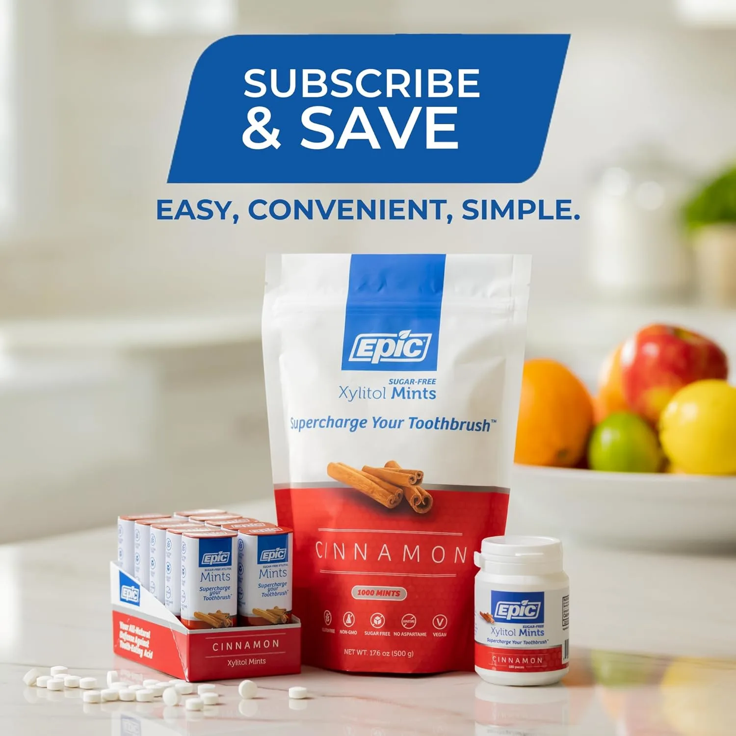 Indulge in the refreshing and guilt-free taste of Epic Dental Xylitol Mints Cinnamon! These delicious mints are not just a treat for your taste buds; they are also a fantastic way to support your oral health. Each mint is packed with xylitol, a natural sweetener that helps to reduce plaque buildup and prevent tooth decay. With 180 mints in each container, you’ll have a long-lasting supply to keep your breath fresh and your smile bright. The bold cinnamon flavor provides a warm and invigorating sensation, making these mints a perfect pick-me-up any time of day. Unlike sugar-filled candies, Epic Dental Xylitol Mints are a healthy and convenient way to freshen your breath after meals, between brushings, or whenever you need a burst of flavor. Make Epic Dental Xylitol Mints a part of your daily oral hygiene routine and experience the difference! Enjoy the confidence of a cleaner, healthier mouth with every mint.