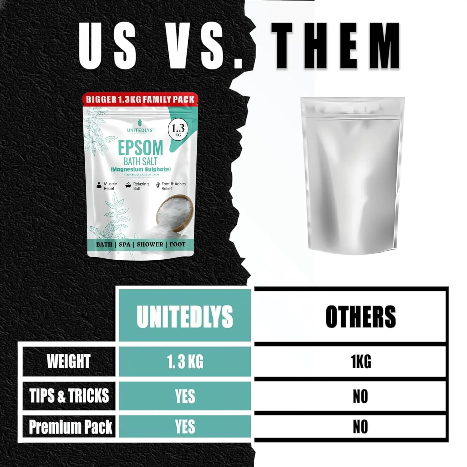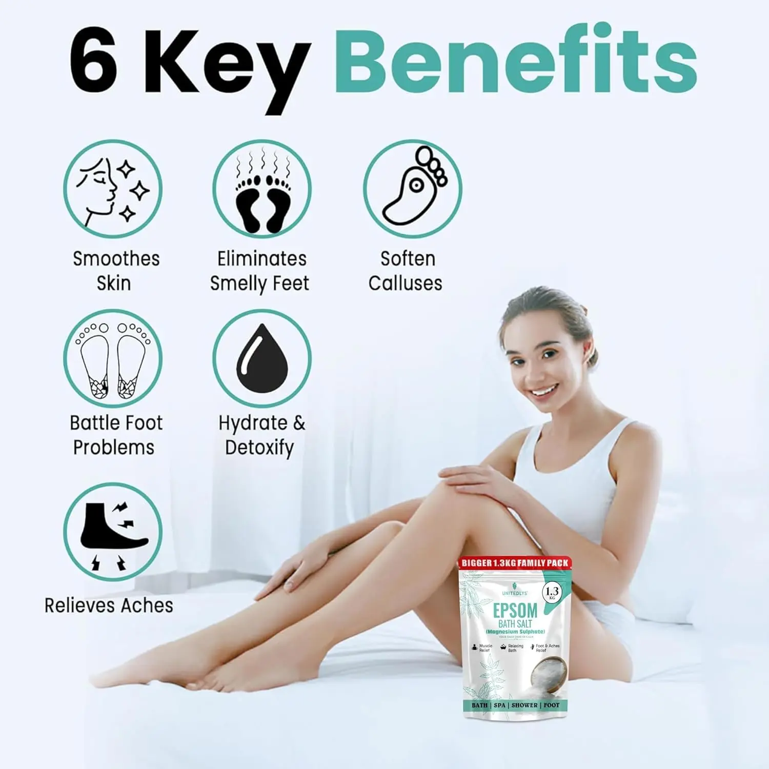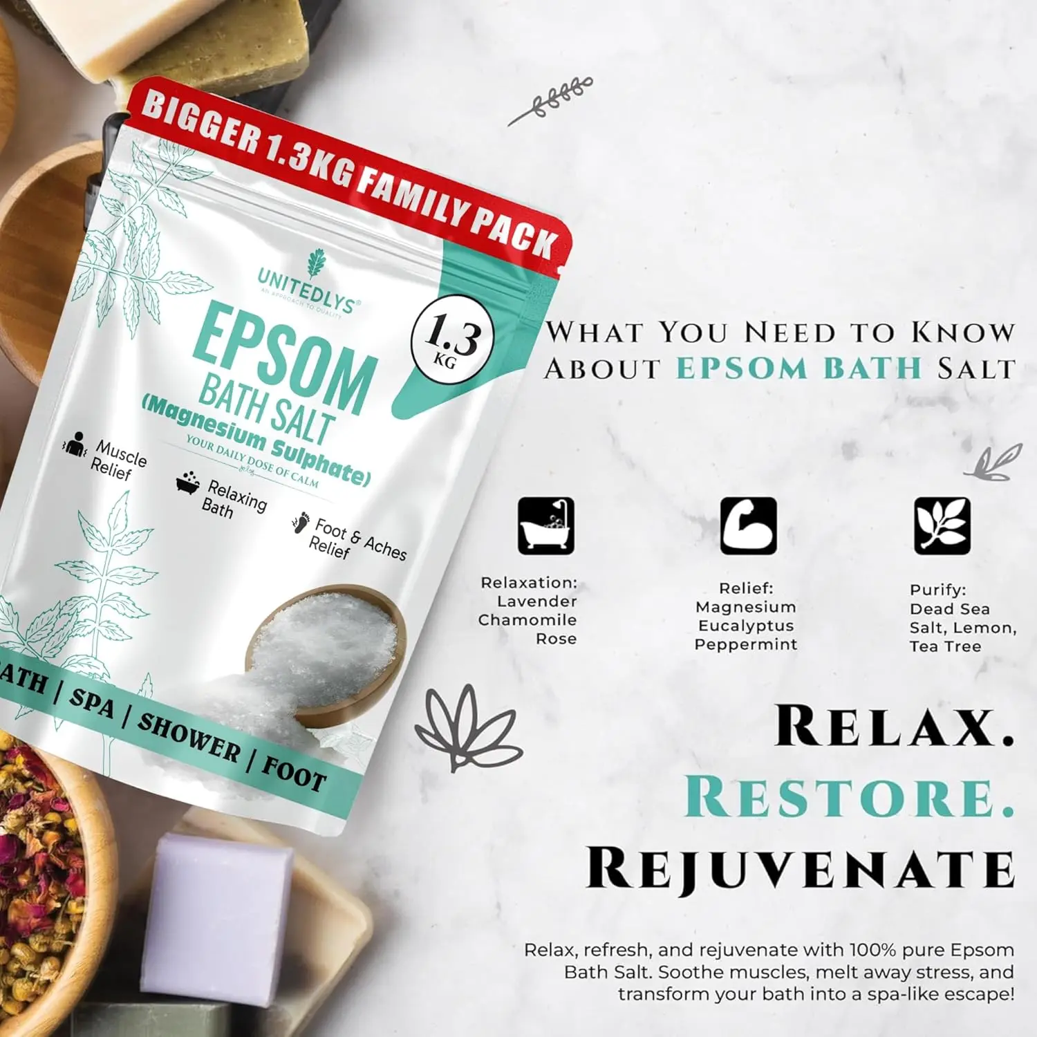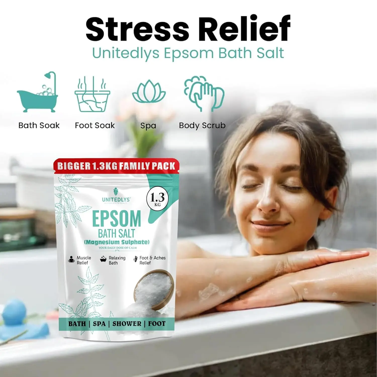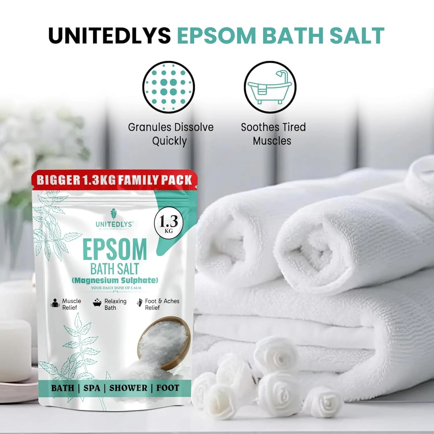 Indulge in the ultimate relaxation and pain relief with our 100% Pure Epsom Salt Bath Soak. Made from premium-grade magnesium sulphate, this versatile product is your go-to solution for soothing sore muscles, relieving tired feet, and promoting overall well-being. Free from additives and artificial fragrances, our fine granules dissolve quickly in water, making it perfect for baths, foot soaks, and post-workout recovery. Experience a spa-like experience in the comfort of your own home as you ease muscle soreness, stiffness, and inflammation. Magnesium sulphate absorbs through the skin, aiding in muscle recovery and joint pain relief. This bath salt is ideal for anyone experiencing body fatigue after a long day. For tired and aching feet, a soak in our Epsom salt helps relieve pain, reduce swelling, and combat odor-causing bacteria, leaving your feet feeling refreshed and rejuvenated. Beyond muscle and foot care, Epsom salt helps draw out toxins, exfoliate dead skin cells, and improve skin texture, promoting healthy and radiant skin. Regular use can soothe dry, irritated skin while restoring natural moisture. Before bedtime, a warm bath with our Epsom salt helps reduce stress, relax the nervous system, and support deep sleep. Its calming properties make it an excellent addition to your evening self-care routine. Whether you’re looking for full-body soaks, foot baths, exfoliating scrubs, or DIY bathing salt blends, our Epsom salt is a must-have for those who prioritize natural self-care, relaxation, and overall well-being. Experience the difference today!