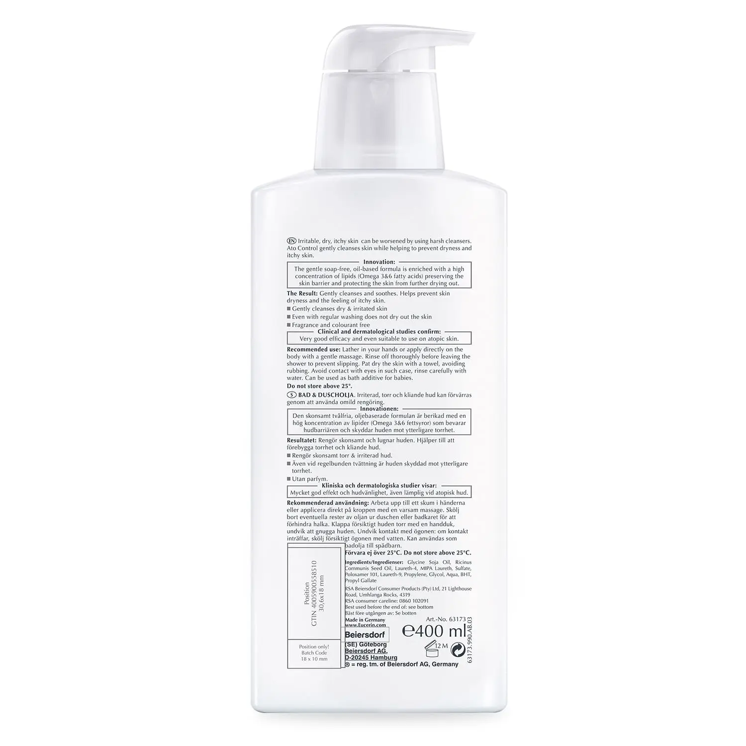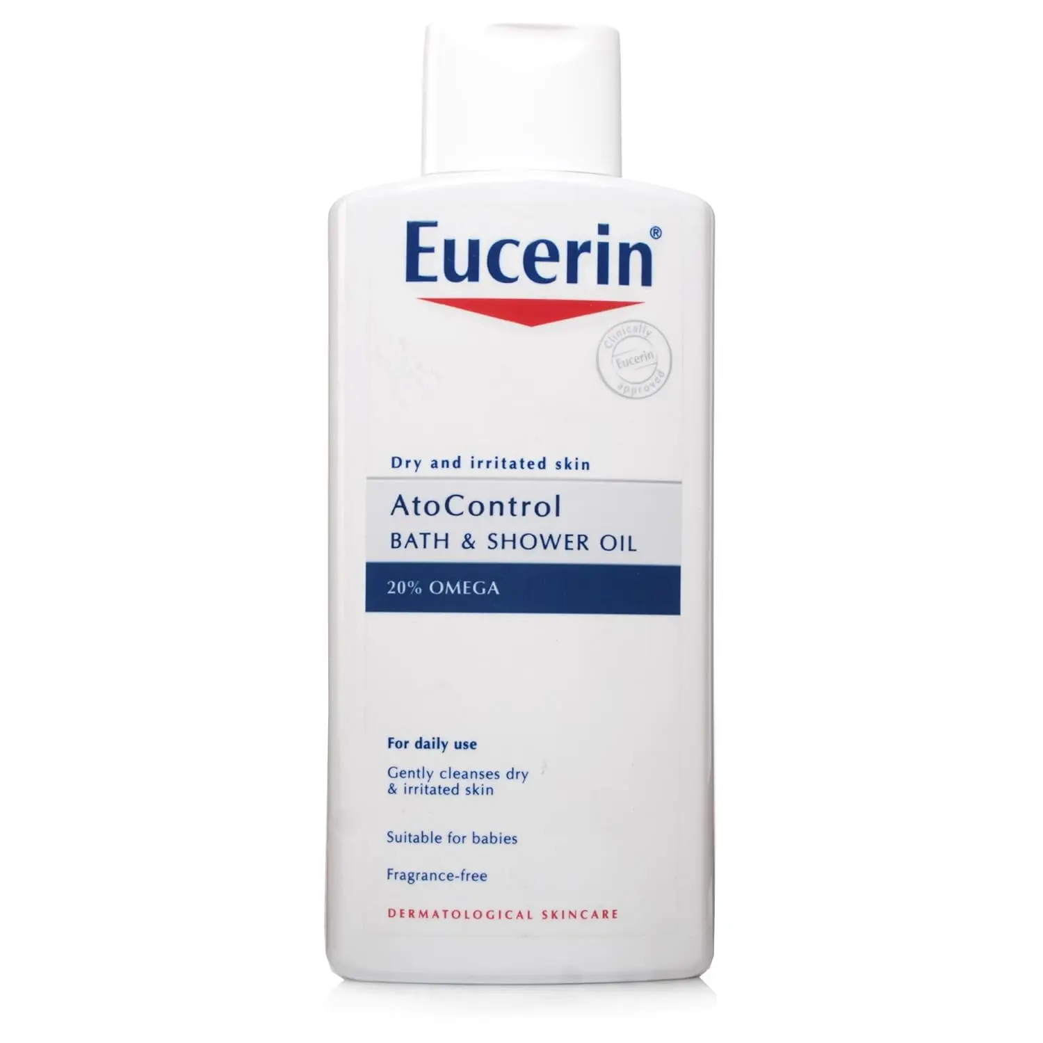 Eucerin AtoControl Bath & Shower Oil is a gentle and effective cleansing solution specifically formulated for atopic skin. This soap-free and fragrance-free formula delicately cleanses the skin while safeguarding its natural barrier, preventing further dryness and itching. Enriched with a high concentration of Omega-3 and Omega-6 oils, this shower oil provides essential nourishment and soothing relief to sensitive skin affected by Atopic Dermatitis. The Eucerin AtoControl range offers comprehensive care for atopic and sensitive skin, addressing the specific needs of dry, itchy, and irritated skin. This bath and shower oil not only cleanses but also leaves the skin feeling soft, moisturized, and free from the discomfort of itching associated with atopic conditions. Experience the difference of a cleanser that understands and caters to the unique requirements of atopic skin, providing gentle care and lasting comfort. The Eucerin shower body oil soothes and nourishes sensitive skin leaving dry, sensitive skin feeling soft, moisturised, and relieved of itching. The Eucerin AtoControl Bath & Shower Oil effectively cleanses while protecting the skin’s natural barrier. Eucerin AtoControl Bath & Shower Oil provides comprehensive care for atopic, sensitive skin.