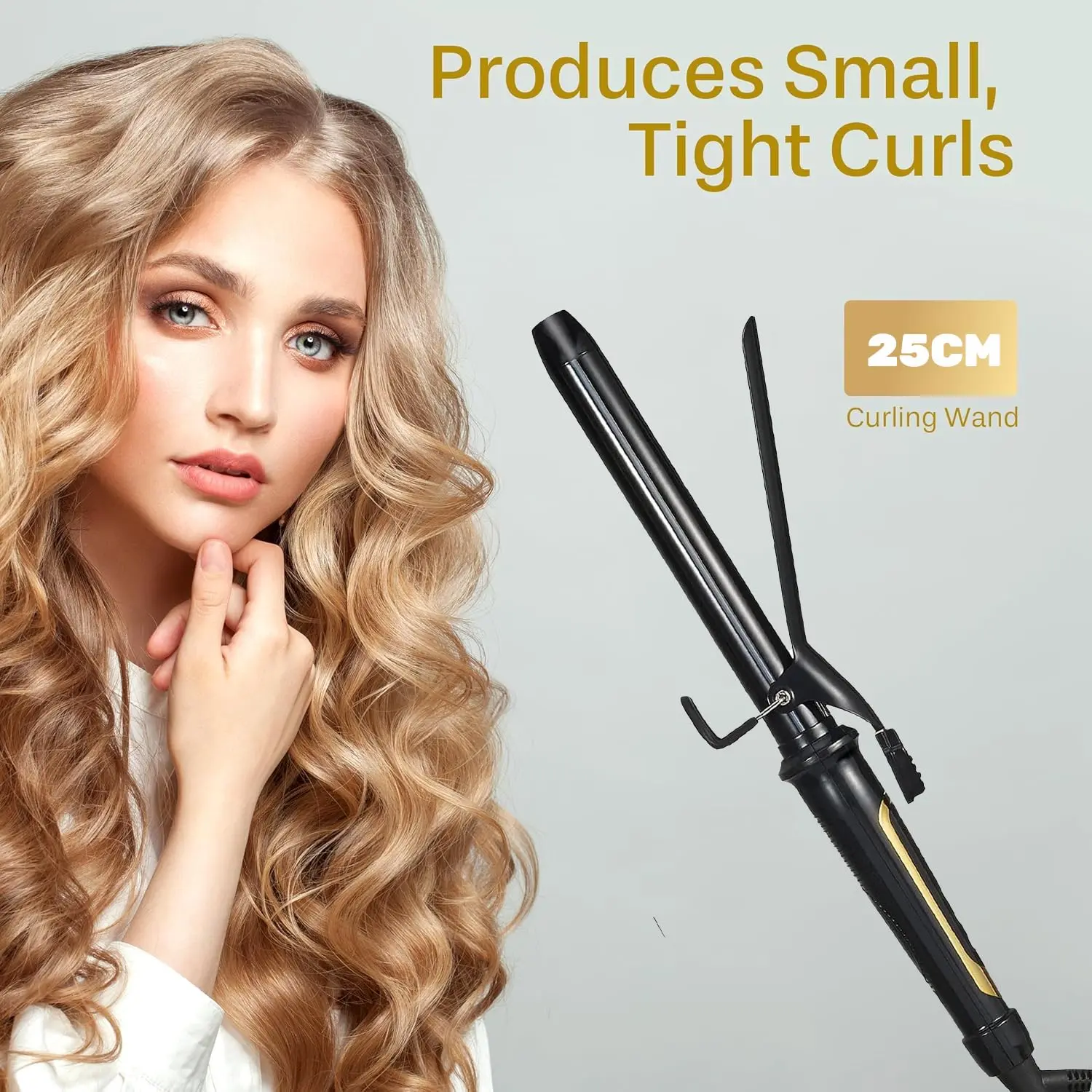 The Lanvier extra-long 1-inch curling iron features a tourmaline ceramic barrel, 5 heat settings, worldwide voltage, and auto shut-off for safe, beautiful curls on long and thick hair.