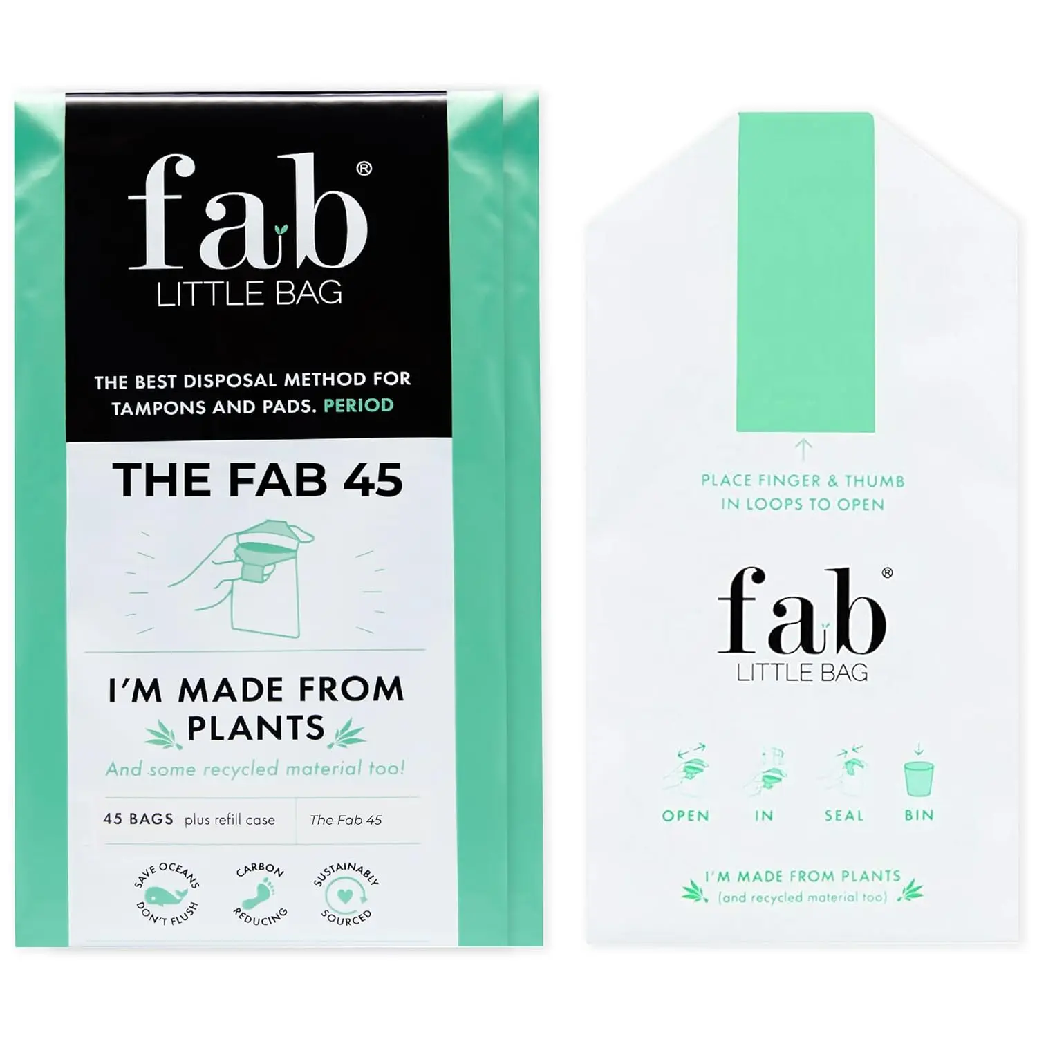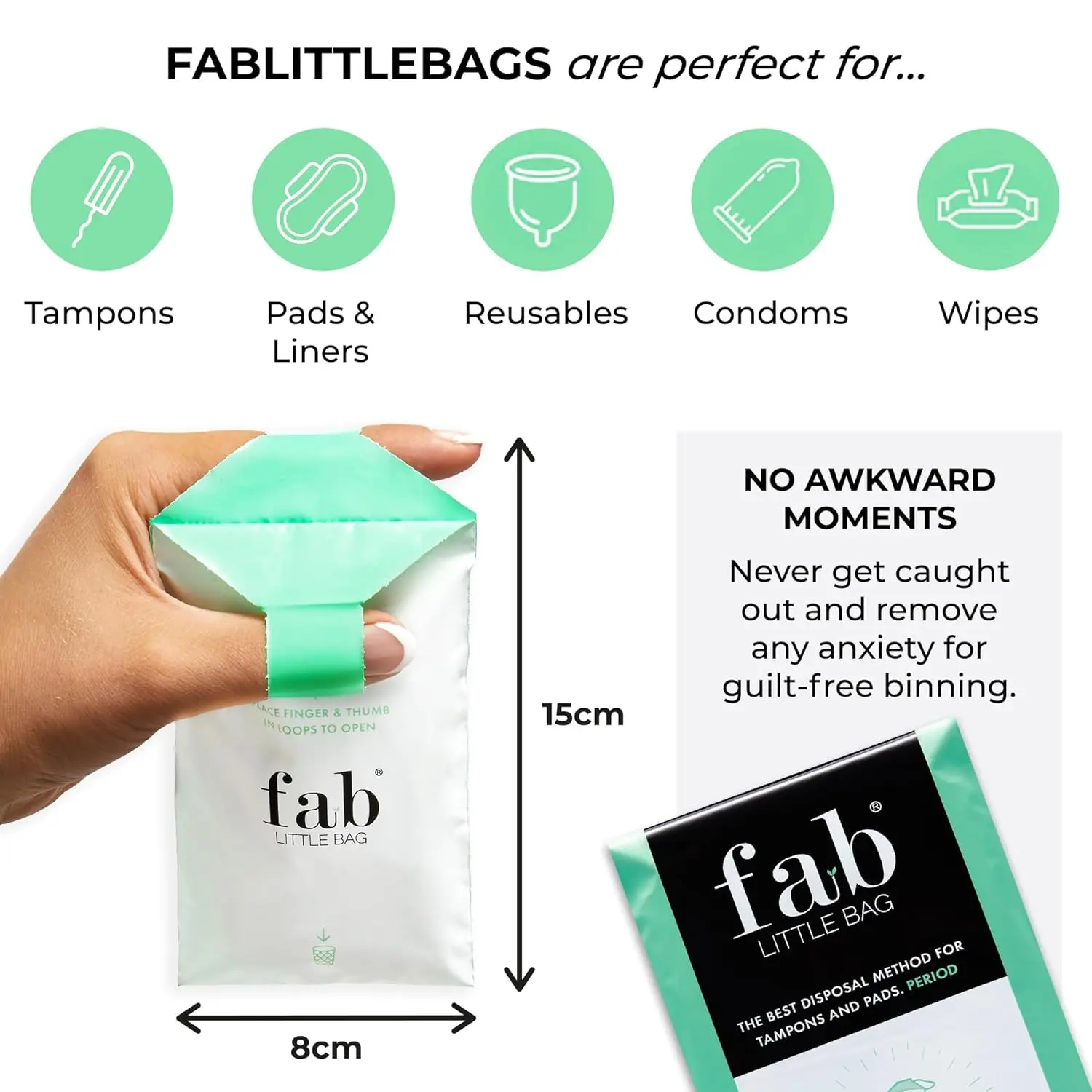 Dispose of feminine hygiene products discreetly and responsibly with Fab Little Bag Tampon Disposal Bags. This pack includes 45 eco-friendly sanitary disposal bags, perfect for tampons, sanitary towels, pads, panty liners, and feminine wipes. A FREE travel case is included for on-the-go convenience. Our small, sealable bags feature patented finger loops for easy, single-handed use, ensuring mess-free and hygienic bin disposal. Simply hold the bag open, drop in the used product, and seal it closed for odour-free disposal. The award-winning design is opaque, odour-trapping, and leak-proof, ideal for home, work, travel, or anywhere discretion is needed. Make a smart choice for your business’s sustainability goals by reducing tampon pollution in waterways. These eco sanitary disposal bags are made from sustainable sources: 60% sugarcane, 10% corn starch, and 30% recycled plastic, with a vegan glue seal. Choose Fab Little Bag for a discreet, hygienic, and eco-conscious disposal solution. Dispose of your feminine products in a better and more environmentally way, make sure your business has the right supplies to help the enviroment for a greater earth. Reduce the amount of feminine products that end up in our waters. Fab Little Bags are a great way to dispose of all kinds of feminine products.
