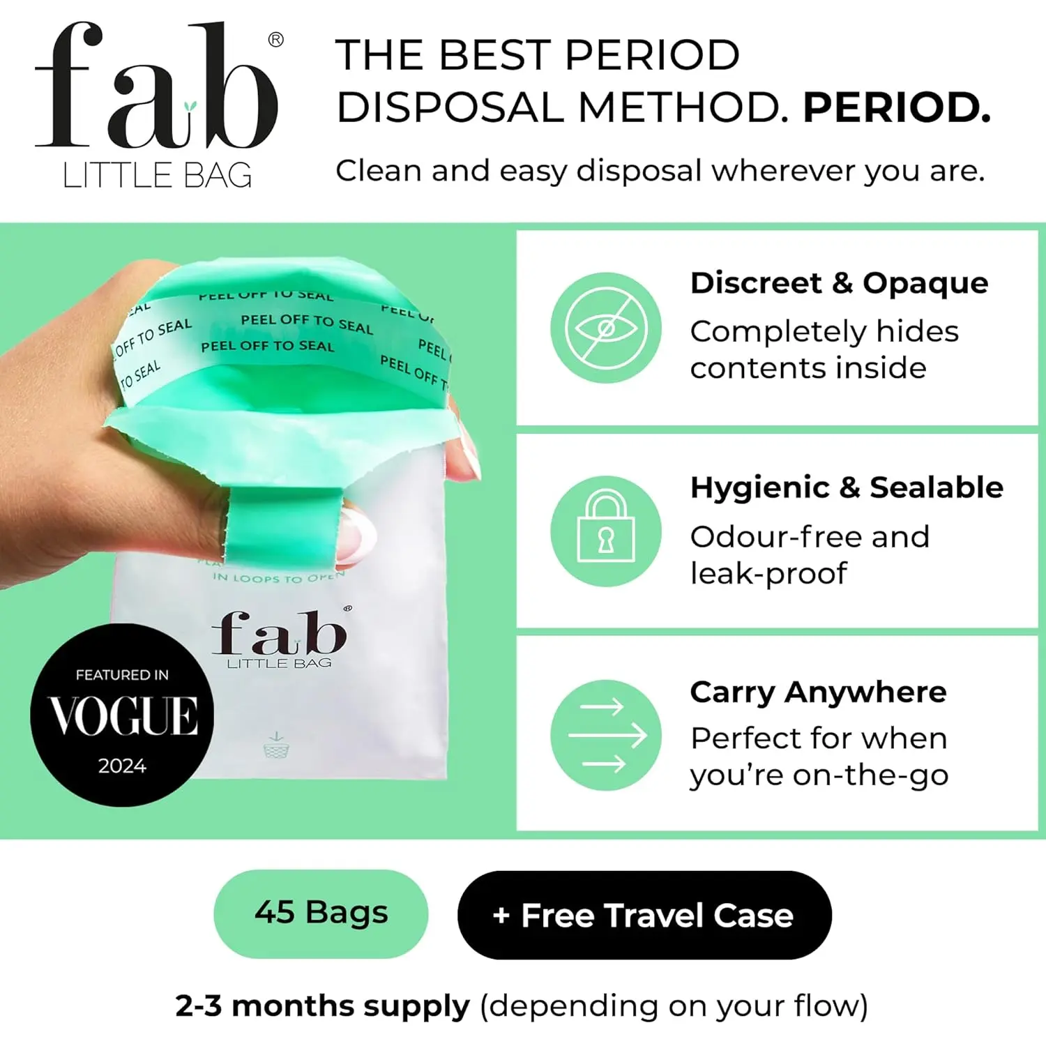 • Pack of 45 eco sanitary disposal bags + FREE travel case.