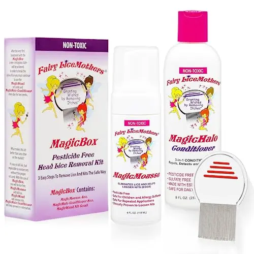 The Fairy LiceMothers Head Lice Treatment Kit is a complete solution for lice and nit removal. Includes Magic Mousse, Magic Halo Conditioner, & Magic Wand Metal Lice Comb.