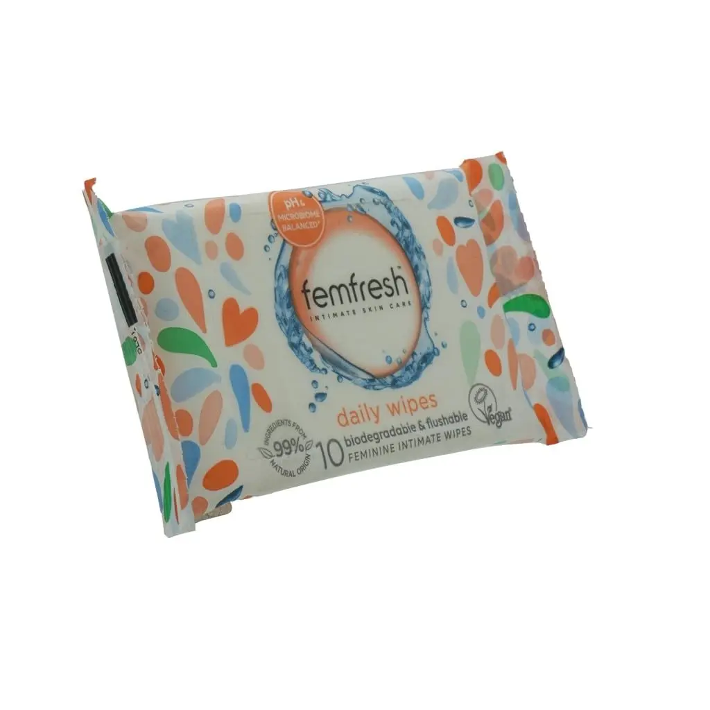 Experience instant freshness and gentle cleansing with Femfresh Freshening & Soothing Intimate Wipes. These wipes are specially formulated to provide a soothing and refreshing cleanse, leaving you feeling confident and comfortable throughout the day. Enriched with calming calendula and soothing mallow extracts, these pH-balanced wipes are designed to respect your delicate intimate area’s natural balance. The hypoallergenic formula is dermatologically and gynaecologically tested, ensuring they are gentle and safe for daily use. Each pack contains 10 individually wrapped wipes, making them perfect for on-the-go freshness. Keep a pack in your purse, gym bag, or travel kit for a quick and convenient way to freshen up anytime, anywhere. These wipes are ideal for use during menstruation, after exercise, or any time you need a little extra cleansing and soothing. They are also perfect for sensitive skin. Femfresh wipes will help you maintain a feeling of freshness and cleanliness, and are also biodegradable and flushable, making them good for the environment. The calming calendula extract helps soothe irritation, while the mallow extract provides moisturizing benefits. Perfect for use at home or on the go, these wipes offer a simple and effective way to maintain your intimate hygiene. Use daily for all round freshness and cleanliness.