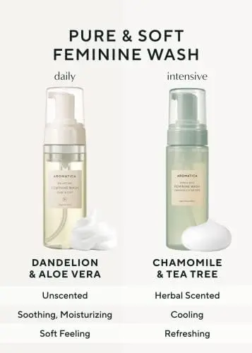 Gentle, pH-balanced feminine wash with natural ingredients. Soothes with almond oil, organic aloe vera, and dandelion. Mild foam, safe for daily use. Maintain optimal pH!
