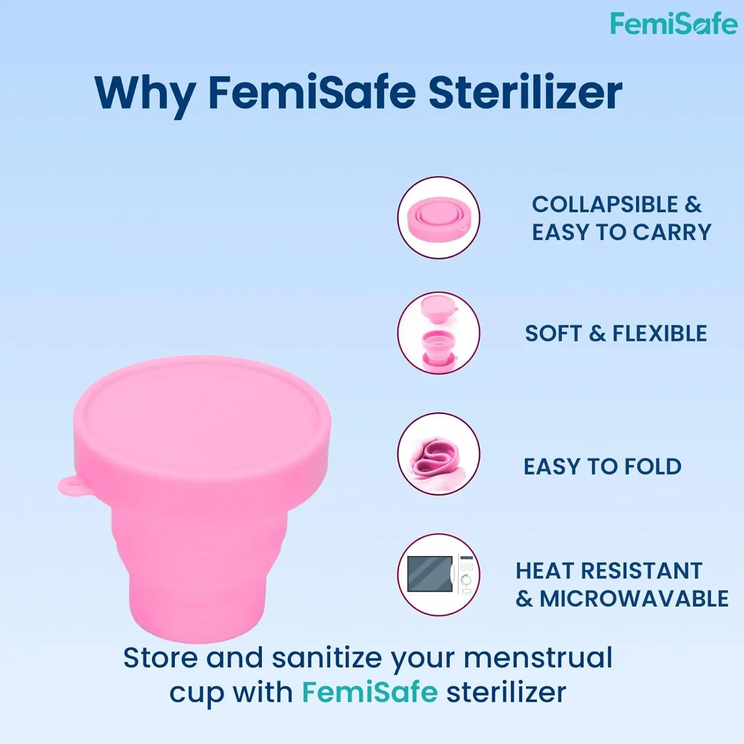 The FemiSafe Sterilizer offers safe, quick menstrual cup sterilization. Made of food-grade silicone, it’s microwave-safe, foldable for travel, and eliminates 99.9% of germs!
