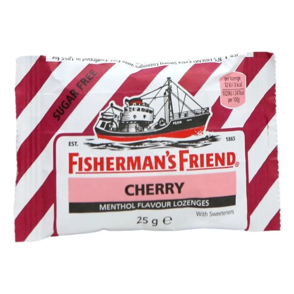 Fisherman’s Friend Cherry Lozenges offer extra strong menthol relief for sore throats, coughs, and nasal congestion with a refreshing cherry flavor and a completely sugar-free formula.