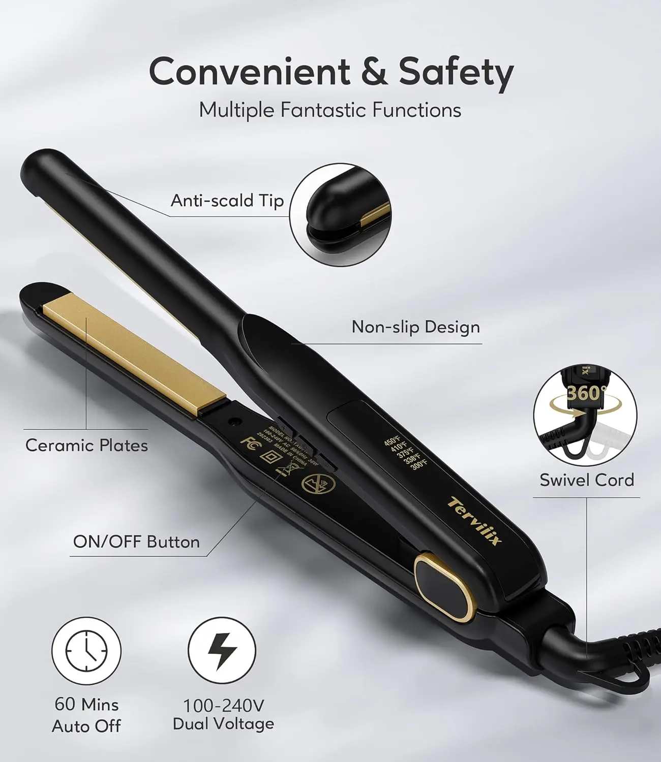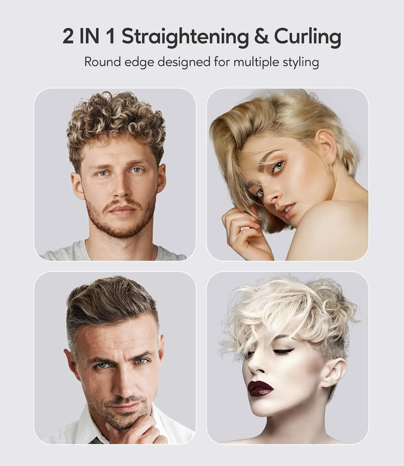 Achieve salon-worthy styles on the go with our Flat Iron for Short Hair & Pixie Cuts! This compact and versatile styling tool is specifically designed for short hairstyles, pixie cuts, and bangs, delivering sleek, straight looks, bouncy curls, or textured waves with ease. The 1/2-inch ceramic plates are infused with Argan Oil, Keratin, and Tourmaline, ensuring gentle, snag-free styling while protecting your hair from heat damage. Whether you have fine, delicate strands or thick, coarse hair, the adjustable temperature settings ranging from 300°F to 450°F provide customizable heat for optimal results without compromising your hair’s health. Its 2-in-1 design allows you to straighten, curl, or add texture effortlessly, making it the perfect all-in-one styling solution. The rounded edges ensure smooth transitions, preventing creases and lines. The compact and lightweight design, coupled with dual voltage compatibility (100-240V), makes this flat iron the ultimate travel companion, fitting easily into your bag for styling anytime, anywhere. Prioritizing safety and convenience, it features a 60-minute auto shut-off function and a 360° tangle-free swivel cord for easy maneuverability. Experience healthy, silky smooth hair with added shine, thanks to the infused Argan Oil, Keratin, and Tourmaline, which lock in moisture and reduce frizz. This flat iron is a must-have for both men and women seeking effortless and damage-free styling for short hair.