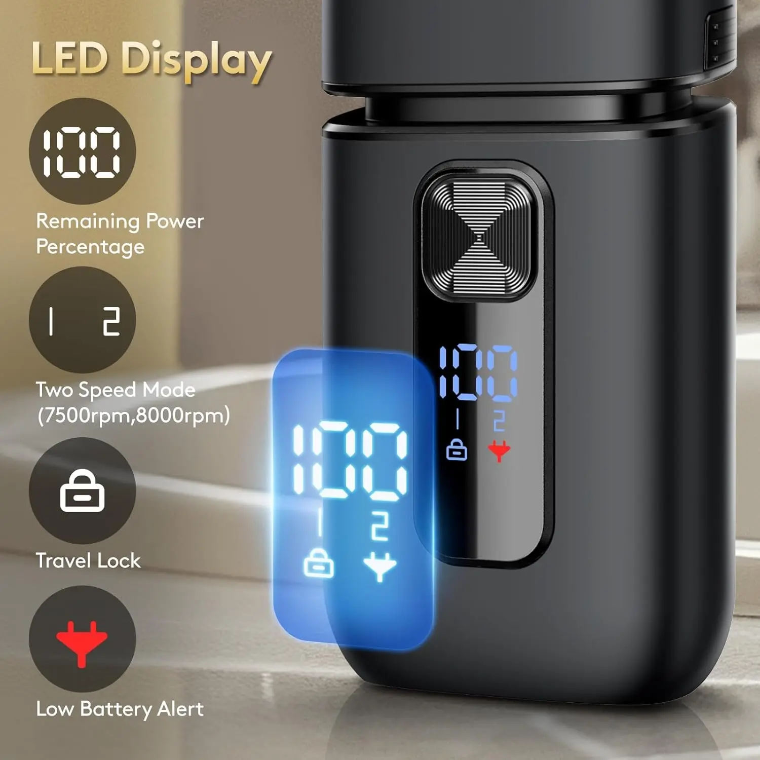 Cleaning is a breeze – the detachable and washable foil blades can be rinsed under the faucet. The IPX6 waterproof rating allows for both wet and dry shaving, ensuring the shaver remains hygienic for every use. Perfect for on-the-go grooming, the travel lock feature, washability, and long battery life make it ideal for trips. Activate or deactivate travel mode with a simple 3-second press of the power button. The powerful motor offers two-speed settings (7500RPM-8000RPM), allowing you to customize the speed to your preferences.