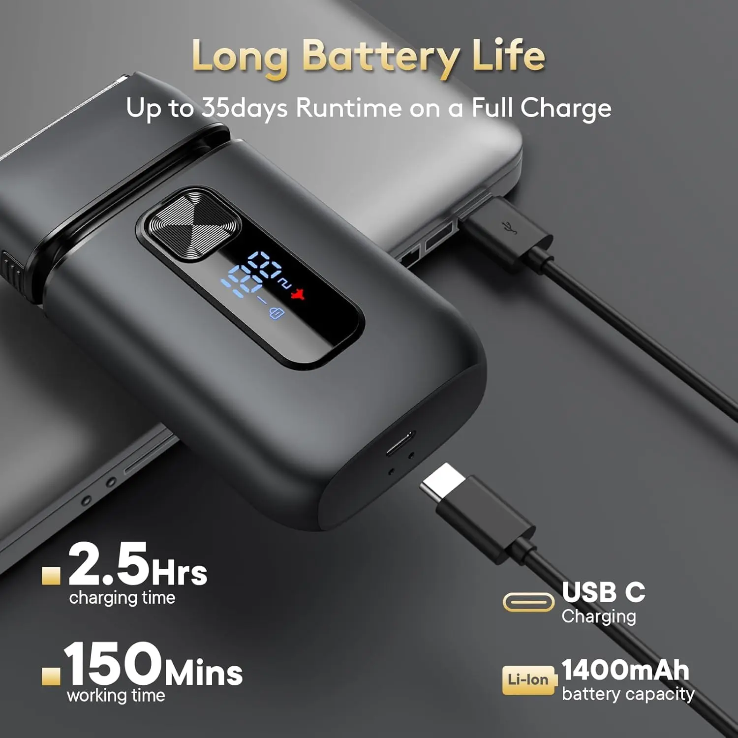 Enjoy up to 150 minutes of runtime on a single 1.5-hour charge, thanks to the long-lasting 18650 lithium-ion battery. The smart digital display accurately shows the remaining power level, so you’ll never be caught off guard mid-shave. The USB C fast charging ensures you’re always ready to go.