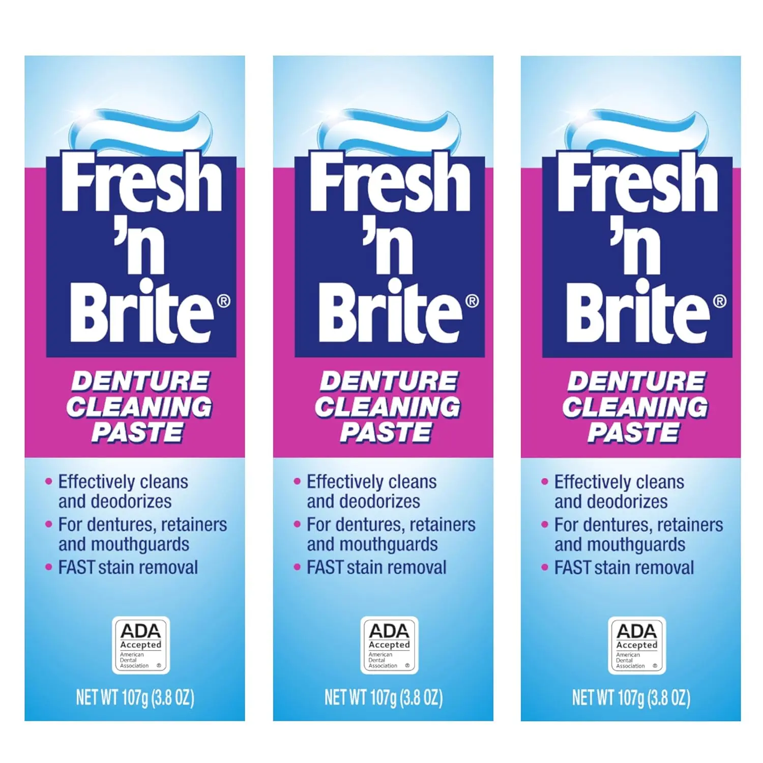Keep your dentures sparkling clean and fresh with Fresh ‘n Brite Denture Paste! This 3-pack ensures you always have a supply of this effective cleaning agent on hand. Fresh ‘n Brite is specially formulated to remove stubborn stains, plaque, and food particles from your dentures, leaving them feeling smooth and looking their best. Regular cleaning with Fresh ‘n Brite helps prevent the buildup of bacteria that can cause odor and irritation, promoting better oral hygiene and fresher breath.