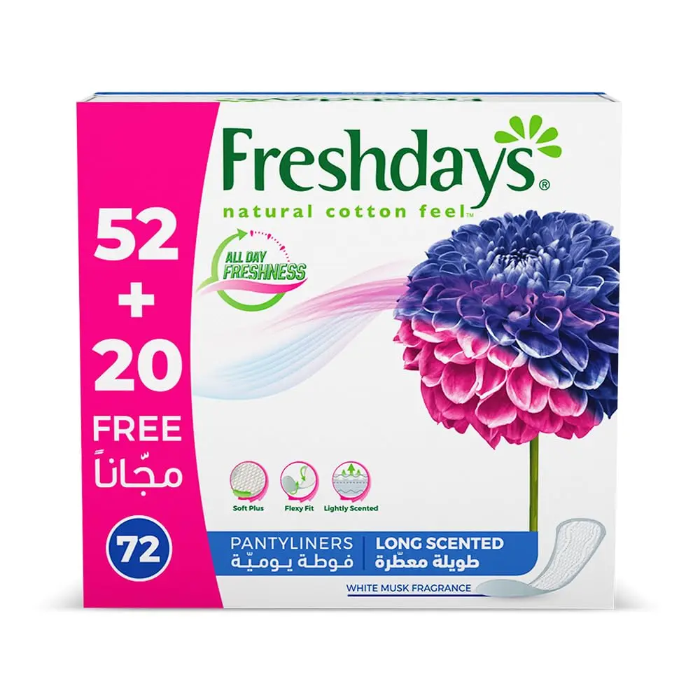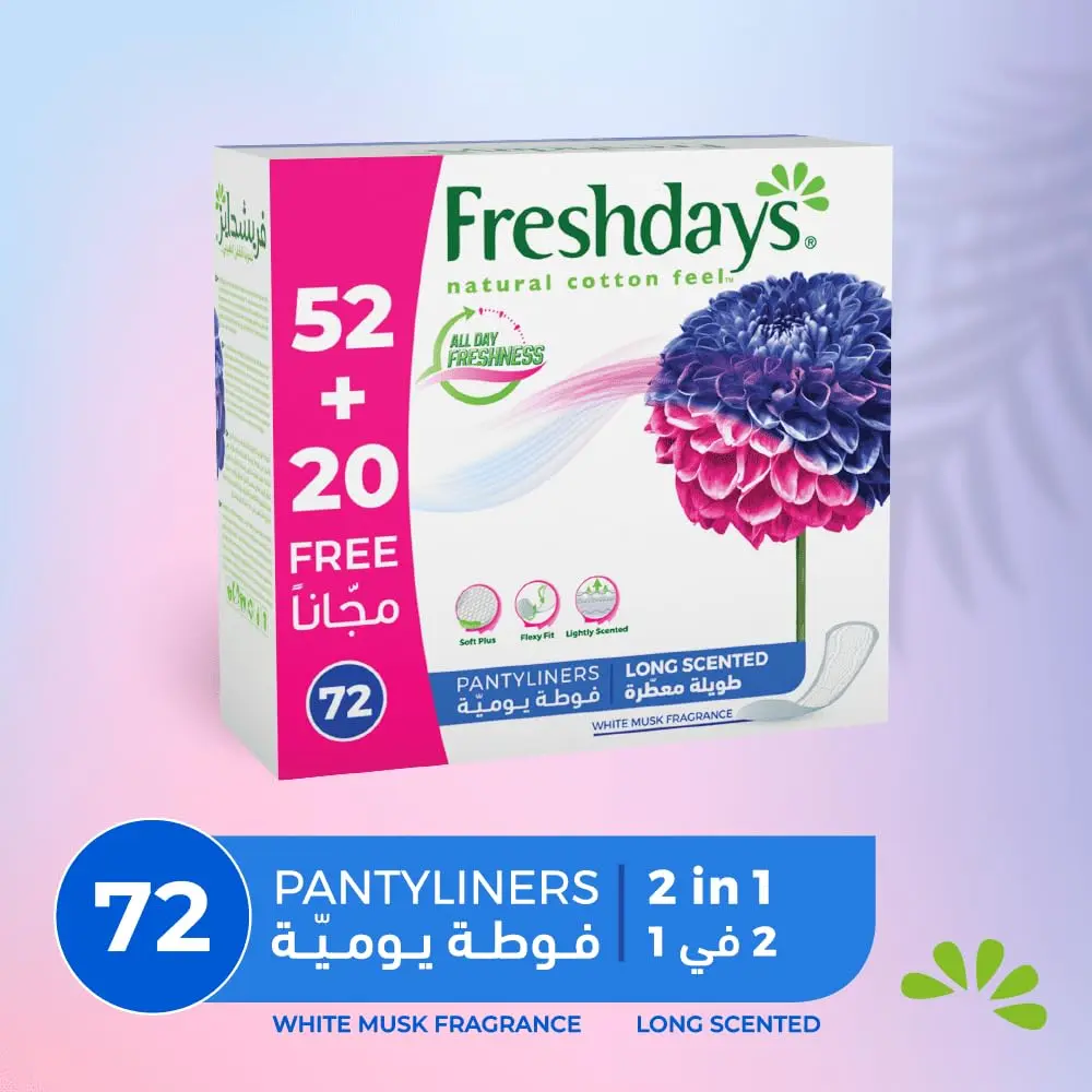 Experience unparalleled comfort and freshness with Freshdays Liners Long Scented. These liners are designed with your ultimate comfort in mind, featuring a natural cotton feel that is so flexible and soft, you’ll barely feel them. Stay fresh and confident all day long with our odorless technology, keeping unwanted smells at bay. The breathable pad ensures optimal airflow, preventing moisture buildup and promoting a comfortable, dry feeling. Perfect for everyday use, light days, or as backup protection, Freshdays Liners Long Scented provide reliable protection without compromising on comfort. The long design offers extra coverage, giving you added security and peace of mind. With 72 liners in each pack, you’ll have a long-lasting supply to keep you feeling fresh and confident. Choose Freshdays for a discreet and reliable solution to your feminine hygiene needs.