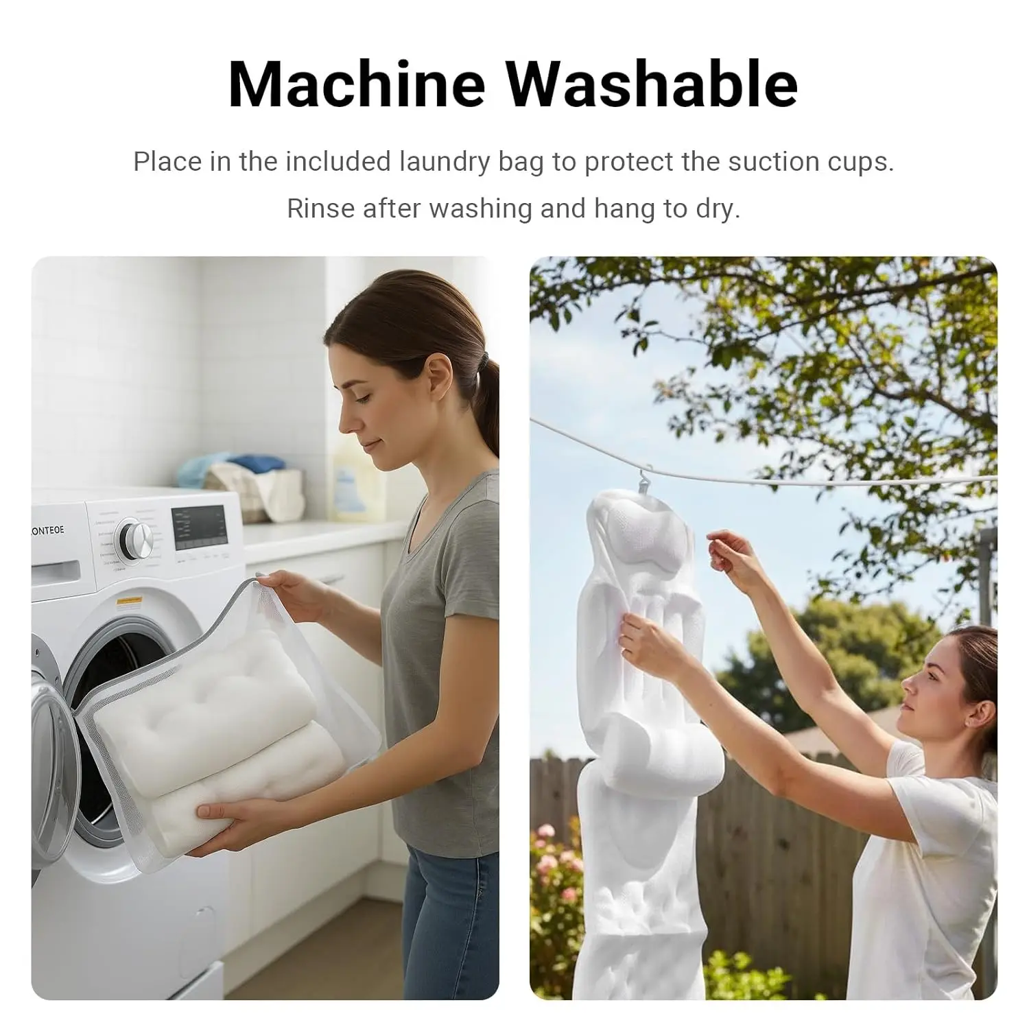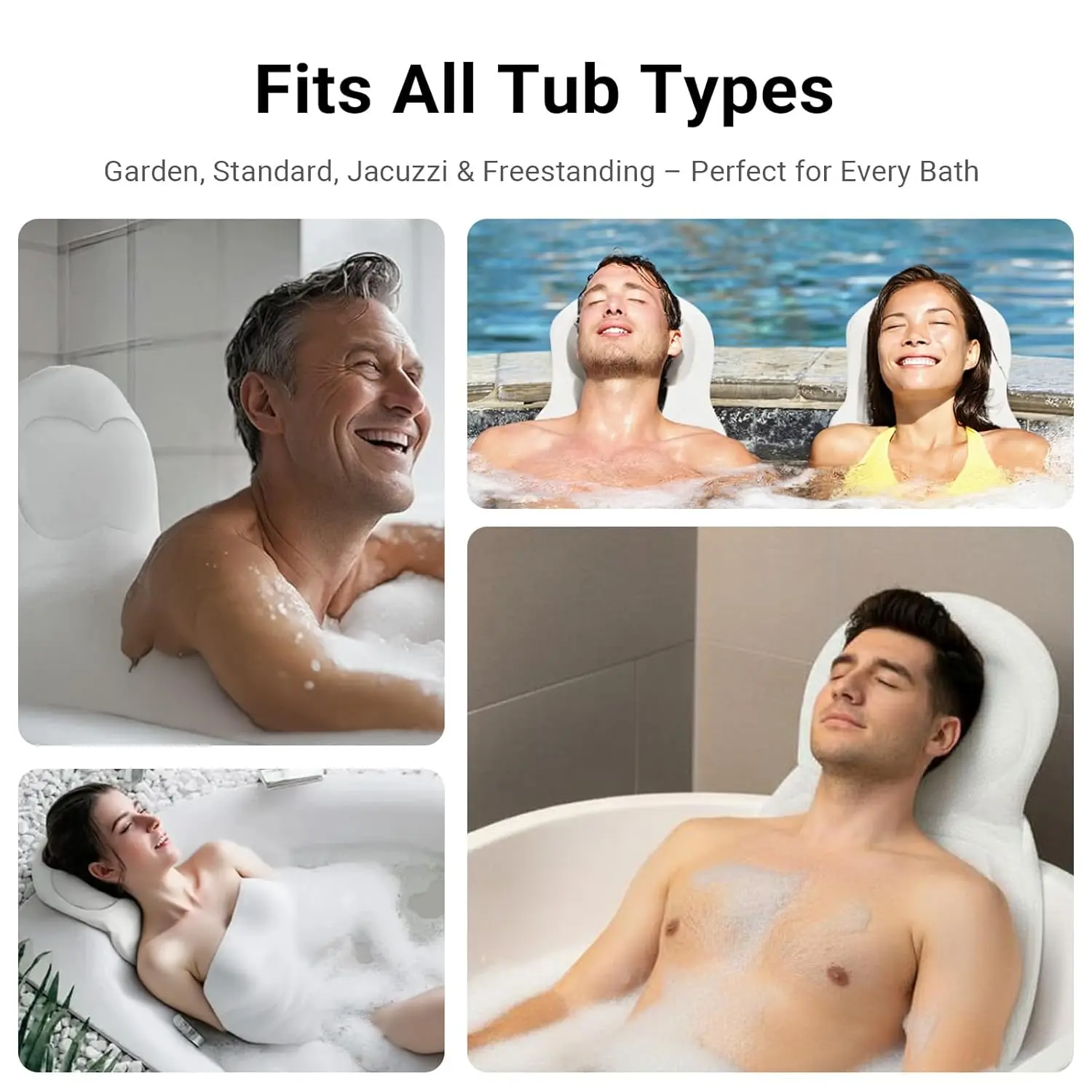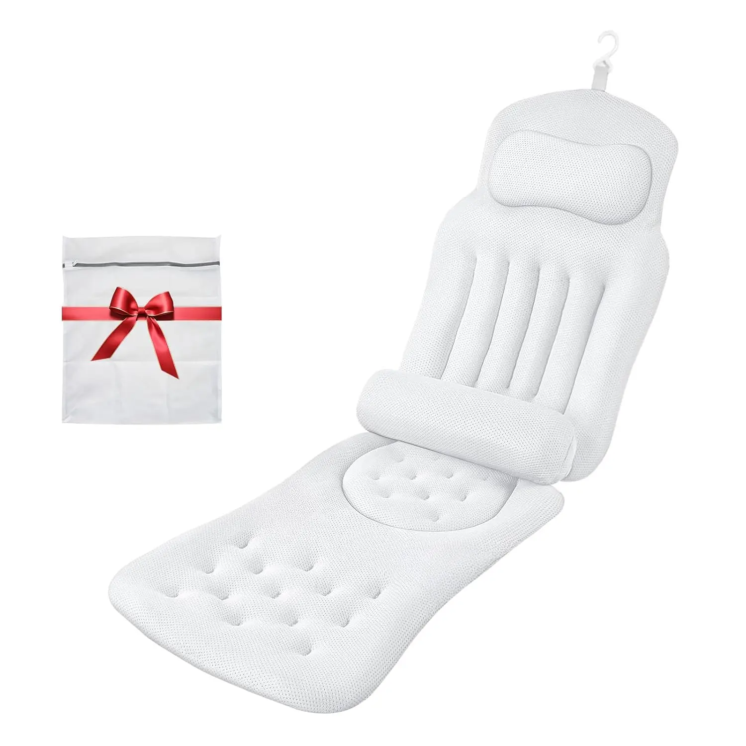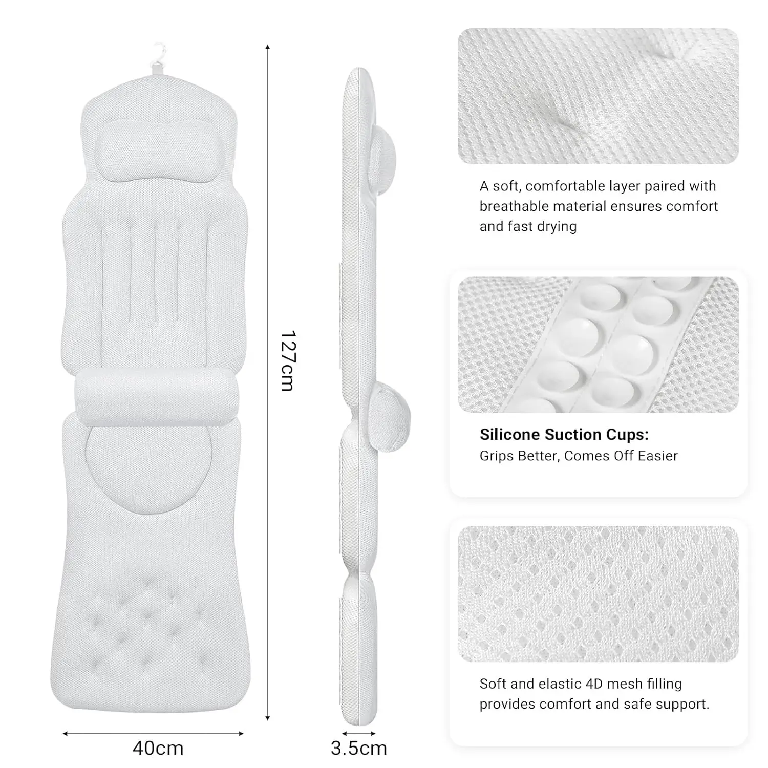 Transform your ordinary bath into a luxurious spa experience with our Full Body Bath Pillow. Designed for ultimate comfort and relaxation, this extra-long (130cm) bath pillow provides ergonomic support from head to toe. Featuring a built-in lumbar cushion, it perfectly adapts to your body’s natural curves, offering enhanced support for your head, neck, back, waist, and tailbone. Say goodbye to discomfort and hello to soothing relief during long, relaxing baths. Our bath pillow is crafted from quick-drying 4D mesh material, ensuring optimal hygiene and breathability. The advanced air mesh fabric allows water and air to flow freely, preventing the build-up of mold, mildew, and unpleasant odors. Keep your bath pillow fresh and clean after every use, ensuring a comfortable and safe bathing experience. Equipped with strong, anti-slip suction cups, this bathtub pillow stays firmly in place on smooth tub surfaces, preventing sliding or floating. Enjoy your bath without interruptions or worries. Please note that this pillow is not suitable for textured tubs but is perfect for standard smooth surfaces. Cleaning and maintaining this pillow is a breeze. It’s machine washable and comes with a convenient mesh laundry bag to protect the suction cups during washing. Built-in hooks allow for quick and easy drying after each use. Whether you’re looking for a thoughtful gift for a loved one or a self-care treat, this full-body spa pillow is an ideal choice. Perfect for birthdays, holidays, or any occasion, it’s a luxurious way to turn any bath into a relaxing at-home retreat.