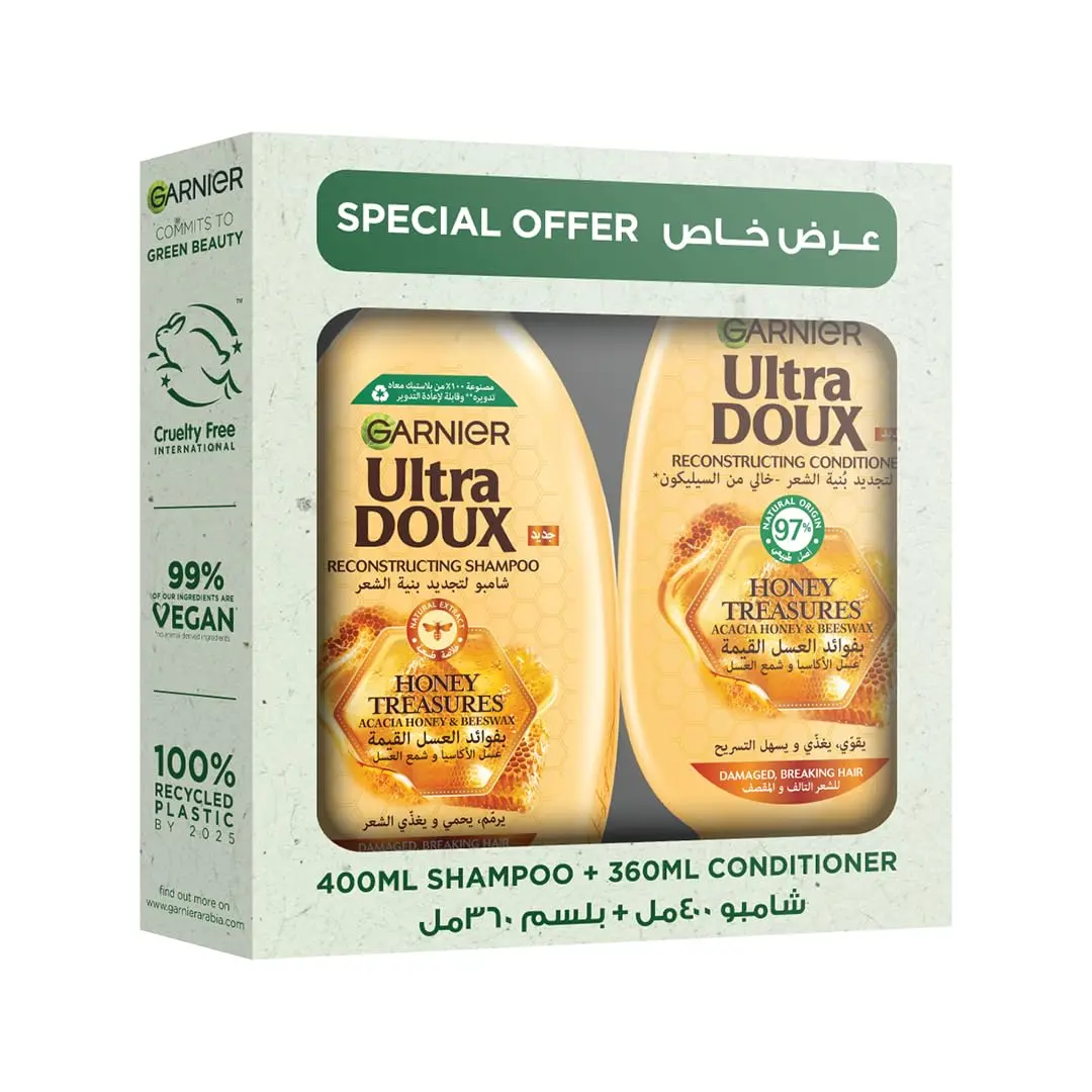 Discover the restorative power of nature with Garnier Honey Treasures Shampoo & Conditioner. This exceptional hair care duo is specifically designed to breathe life back into fragile and damaged hair. Our unique formula is enriched with a powerful blend of Royal Jelly, known for its reparative properties, Protective Propolis, a natural shield against damage, and Nourishing Honey, a time-tested moisturizer.