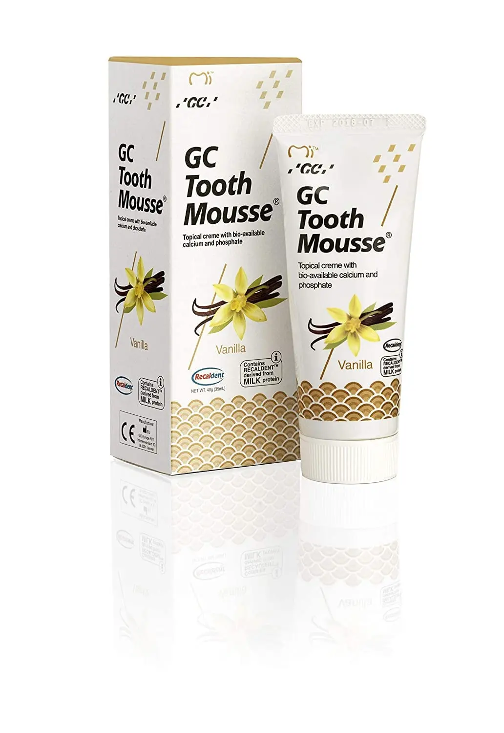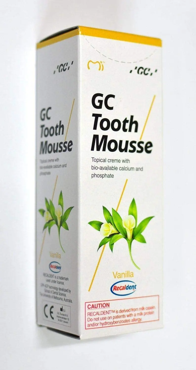 Experience the delightful taste of vanilla while protecting your teeth with GC Tooth Mousse in Vanilla Flavor. This specially formulated toothpaste offers a unique approach to oral health, providing essential minerals directly to the tooth surface. GC Tooth Mousse contains Recaldent™ (CPP-ACP), a milk-derived protein that binds calcium and phosphate to the tooth enamel, strengthening and remineralizing it. This helps to protect against acid attacks from sugary foods and drinks, reducing the risk of cavities and sensitivity. The hygienic packaging ensures the product remains clean and uncontaminated, maintaining its effectiveness. Enjoy the sweet and creamy vanilla flavor that makes brushing a pleasure while promoting healthier, stronger teeth. Regular use of GC Tooth Mousse can help improve enamel hardness, reduce white spot lesions, and buffer plaque acid. Give your teeth the extra care they deserve with this innovative and delicious toothpaste. This is the perfect addition to your daily oral hygiene routine.