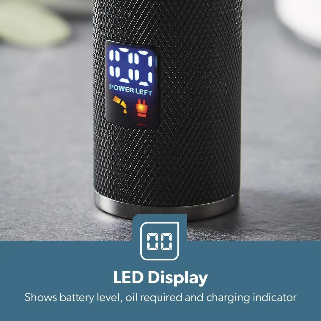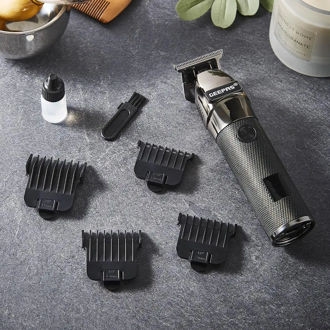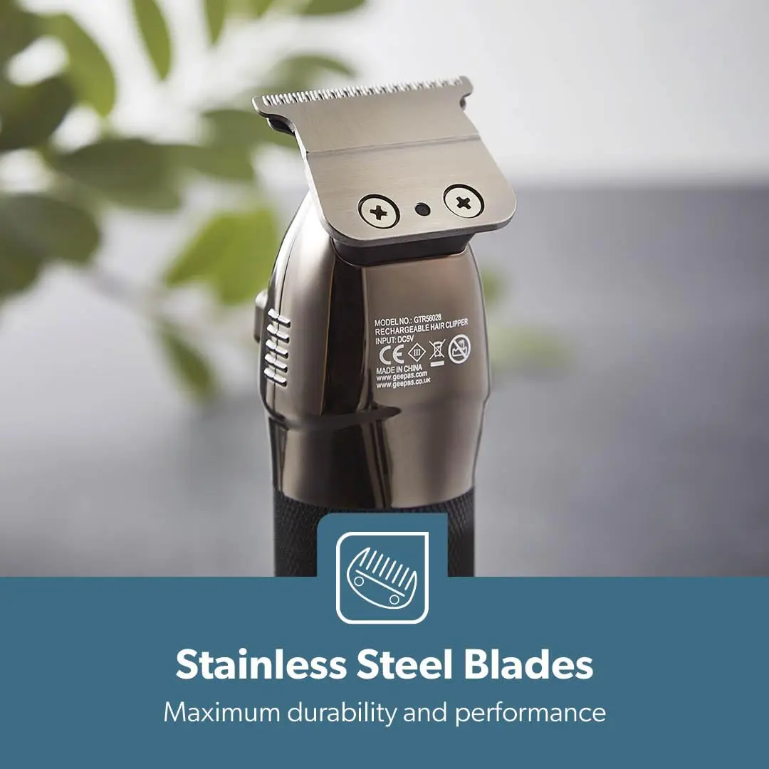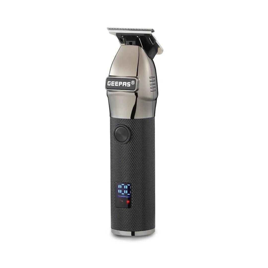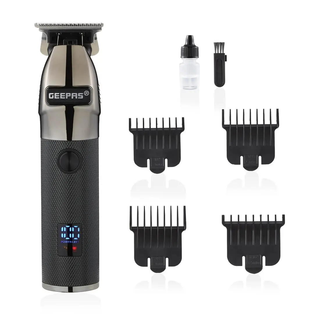 The Geepas Hair Clipper features an LED display, sharp stainless steel blades, and a rechargeable battery for cordless use. Includes 4 guide combs for varied cutting lengths.