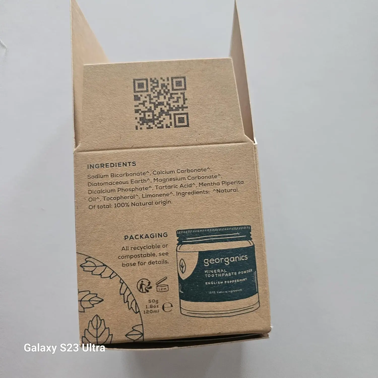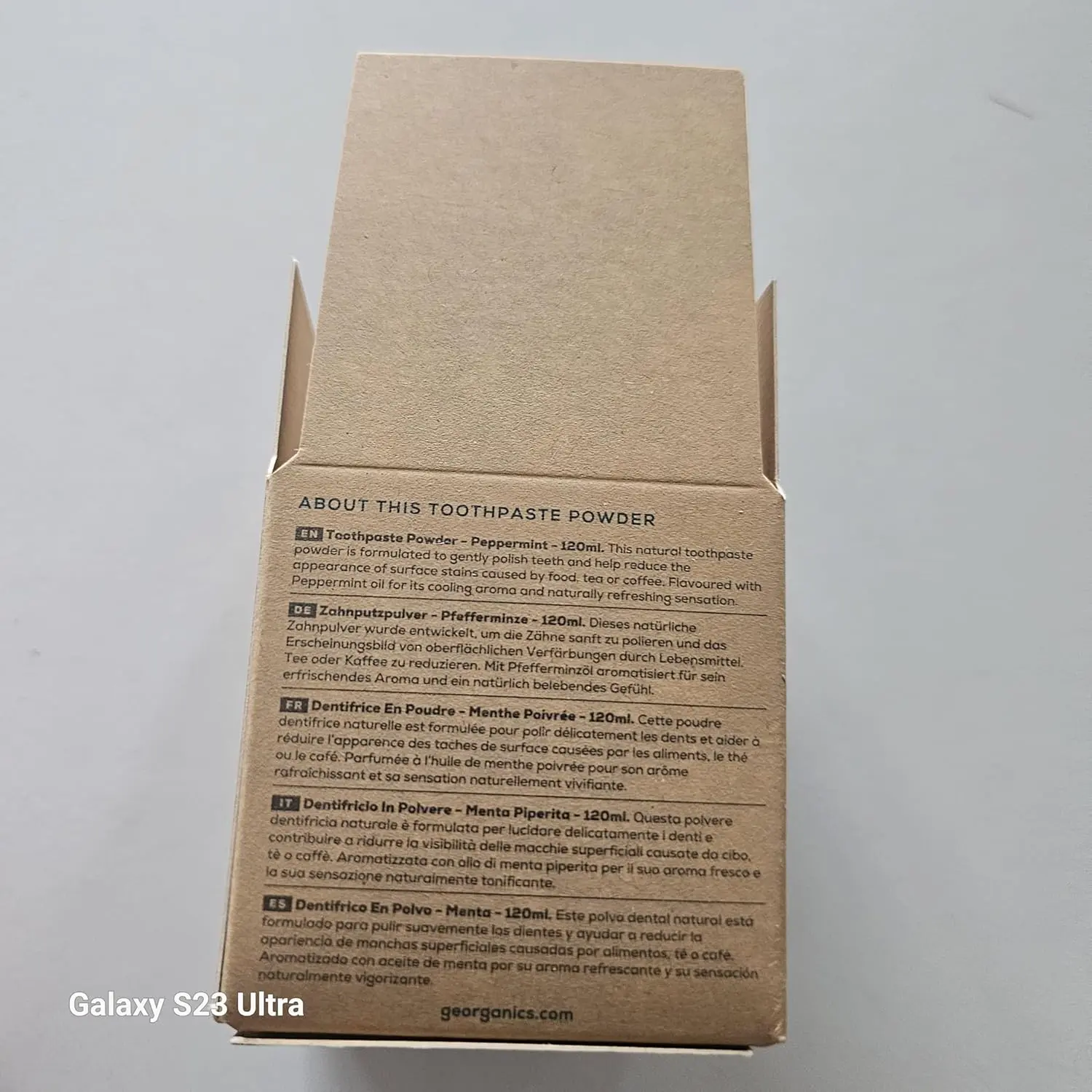 Achieve a brighter, healthier smile with Georganics Natural Toothpowder in Peppermint. This 100% natural and organic toothpowder gently yet effectively polishes away stains and plaque buildup, revealing a whiter, more radiant smile. Formulated without fluoride, glycerin, or SLS, it’s a safe and eco-friendly alternative to conventional toothpaste. The stain-removing formula is specially designed to combat discoloration caused by coffee, tea, and wine, while the refreshing peppermint oil leaves your mouth feeling clean and your breath fresh. We believe in providing a better experience for you and the planet, this toothpowder is vegan and cruelty-free, crafted with food-grade certified ingredients, and packaged in a zero-waste glass jar with a compostable box. Made in West Sussex, England, with locally sourced ingredients, supporting UK businesses. Experience the difference of natural oral care and enjoy a naturally whiter, healthier smile with Georganics. It’s a gentle, natural and refreshing experience with a delicious peppermint flavour.