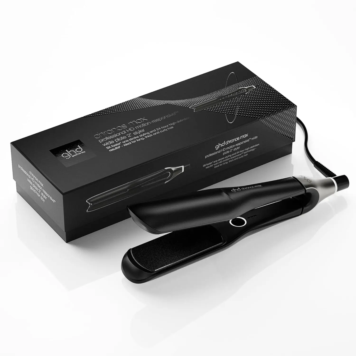 Experience the ultimate in hair styling with the ghd Chronos Max Wide Plate Styler. Designed for those with long, thick, or curly hair, the Chronos Max features 85% larger plates compared to the standard ghd Gold, making styling significantly faster and more efficient. Achieve high-definition results in just one stroke, boasting up to 90% more shine and 2.5 times less frizz. Trusted by stylists since 2001, ghd delivers salon-quality results in the comfort of your own home, ensuring good hair days, every day. The Chronos Max empowers you to create styles that last all day long – 82% of users agree that styles hold for up to 24 hours. Enjoy added peace of mind with the smart sleep mode, which automatically shuts off the styler after 10 minutes of inactivity. The wider plates, coupled with close edge design, allow for maximum root control, enabling you to style from root to tip with precision. More than just a straightener, the Chronos Max effortlessly transforms your look, allowing you to straighten, curl, or create waves. Its HD motion-responsive technology continuously adapts to your styling movements, providing unmatched heat monitoring accuracy for consistently flawless results. Invest in the ghd Chronos Max and unlock a world of styling possibilities for your hair.
