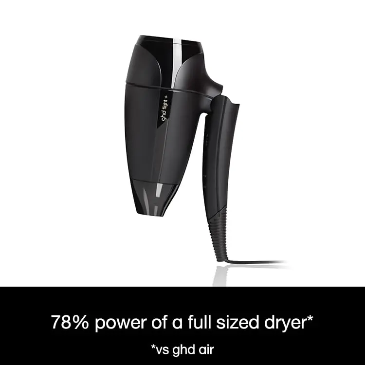 Experience salon-quality hair on the go with the ghd Flight+ Travel Hair Dryer. This powerful and compact dryer delivers 78% of the power of a full-size dryer*, all within a travel-friendly design. Say goodbye to bulky hair tools and hello to quick, efficient drying wherever you are. Weighing 49% lighter* and 25% smaller* than standard dryers, the Flight+ is designed for ultimate portability. Its folding handle makes it easy to pack and saves valuable space in your luggage.