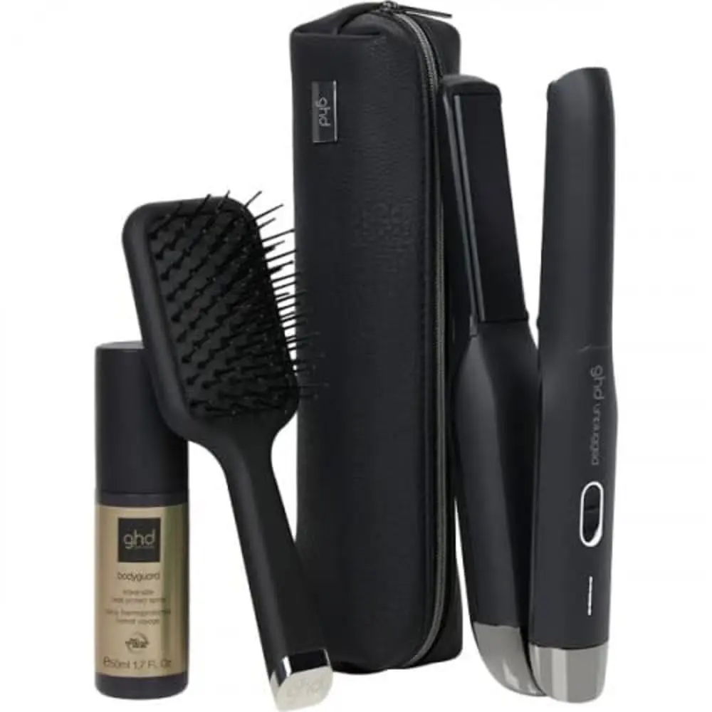 Experience ultimate styling freedom with the ghd Unplugged Gift Set. This comprehensive set includes everything you need to achieve sleek, straight hair wherever you go. The star of the set is the ghd Unplugged Styler, a cordless hair straightener designed for on-the-go styling. Enjoy up to 20 minutes of cordless use, perfect for quick touch-ups or complete styling sessions. The Unplugged Styler features a USB-C charging cable with an EU plug for convenient charging. It incorporates hybrid co-lithium technology, combining dual-zone technology for consistent heat distribution and an advanced lithium-ion battery for long-lasting power. The styler heats up in just 45 seconds, allowing for rapid styling. A 5-level battery indicator keeps you informed about the remaining power. Its hand luggage-friendly design makes it ideal for travel. The automatic sleep mode activates after 3 minutes of inactivity, ensuring safety and energy conservation. This gift set also includes a mini ghd Bodyguard Heat Protect Spray, formulated with an advanced heat protection system to shield your hair from heat damage. Complete the set with the GHD Paddle Brush, ideal for uncomplicated styling of medium to long hair without static charging. This gift set provides all the tools you need for flawlessly styled hair, whether you’re at home or on the go. The included heat-resistant travel case allows you to safely transport your styler and accessories. Enjoy the convenience and performance of ghd technology in a portable, stylish package.