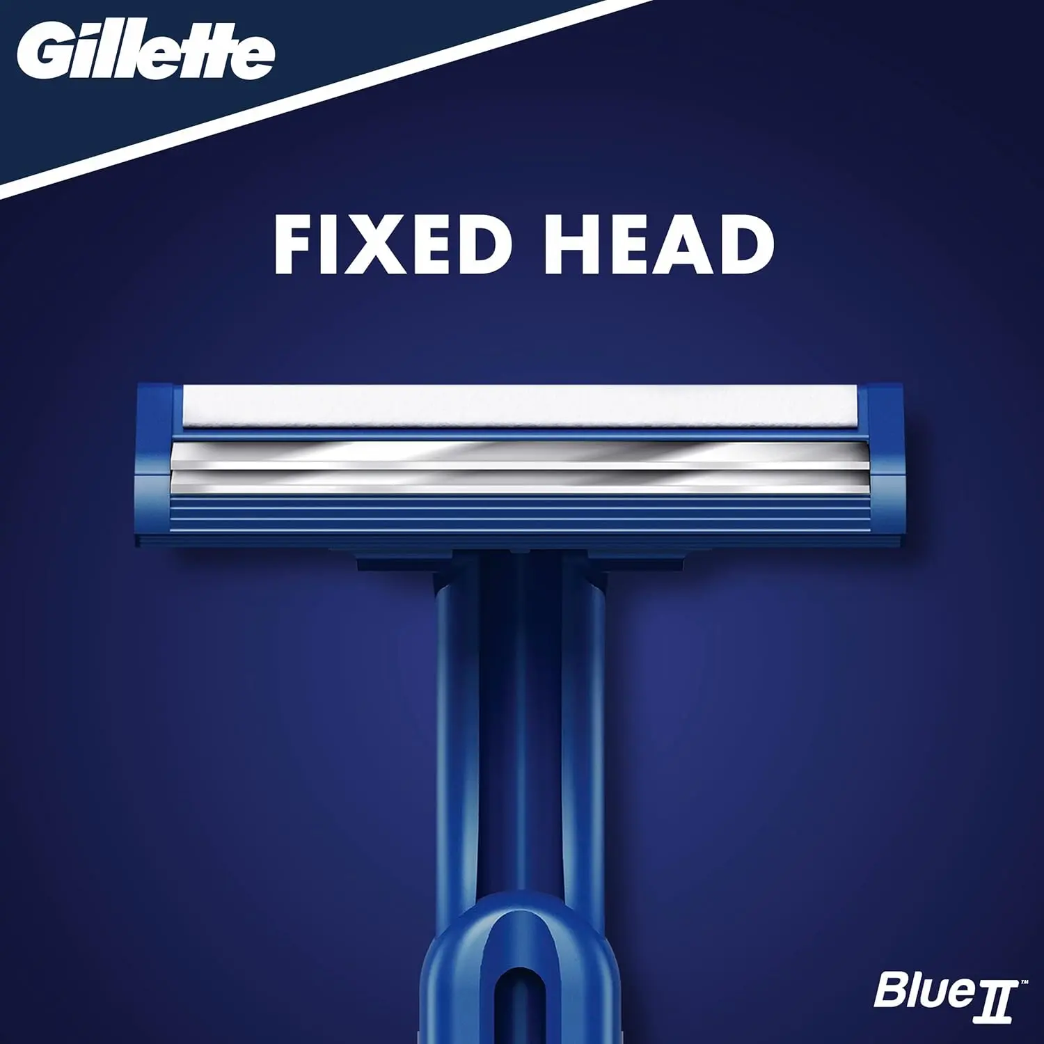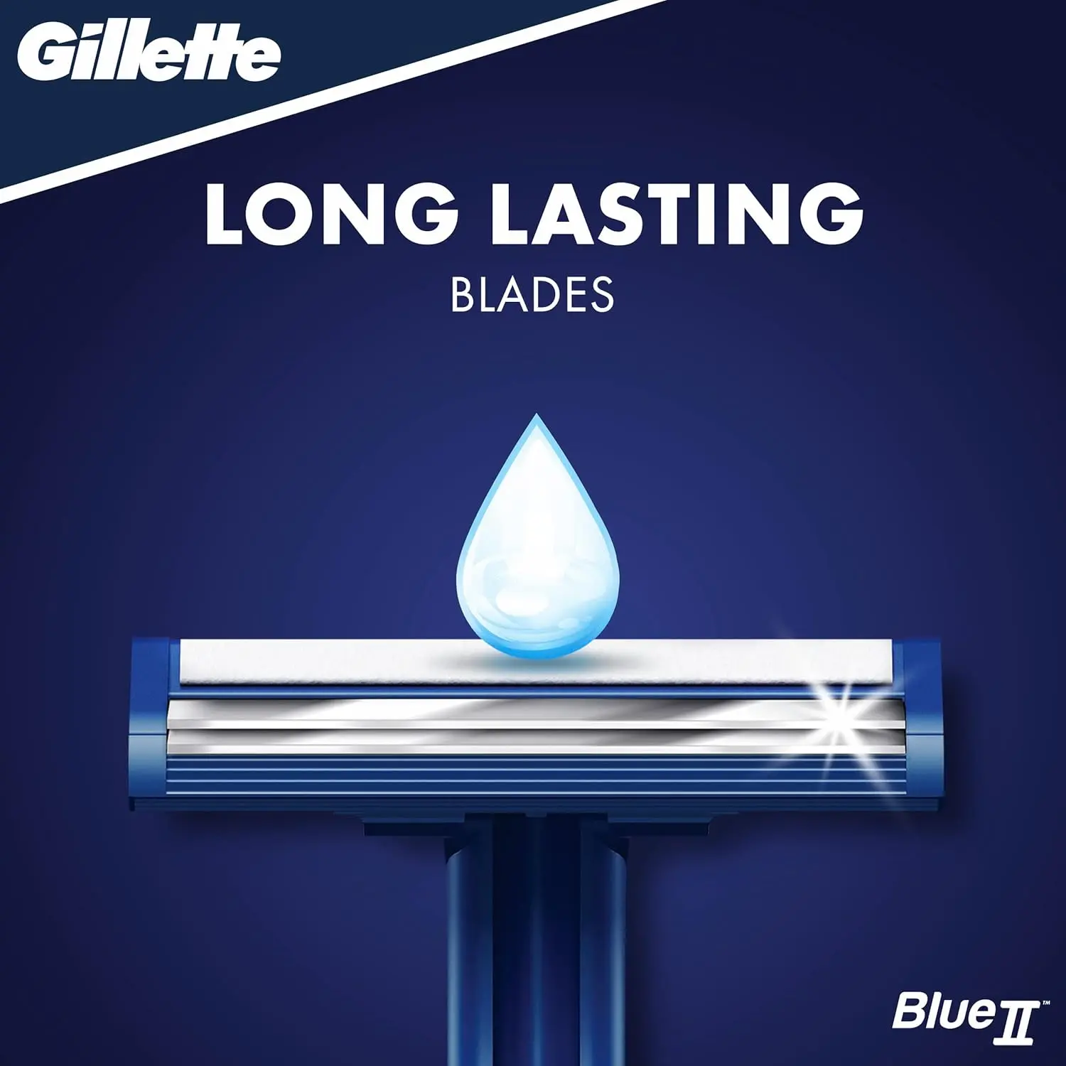 Experience a smooth shave with Gillette Blue II disposable razors. Featuring chromium-coated blades, a pivoting head, and a soft Ultragrip handle for optimal control and comfort.