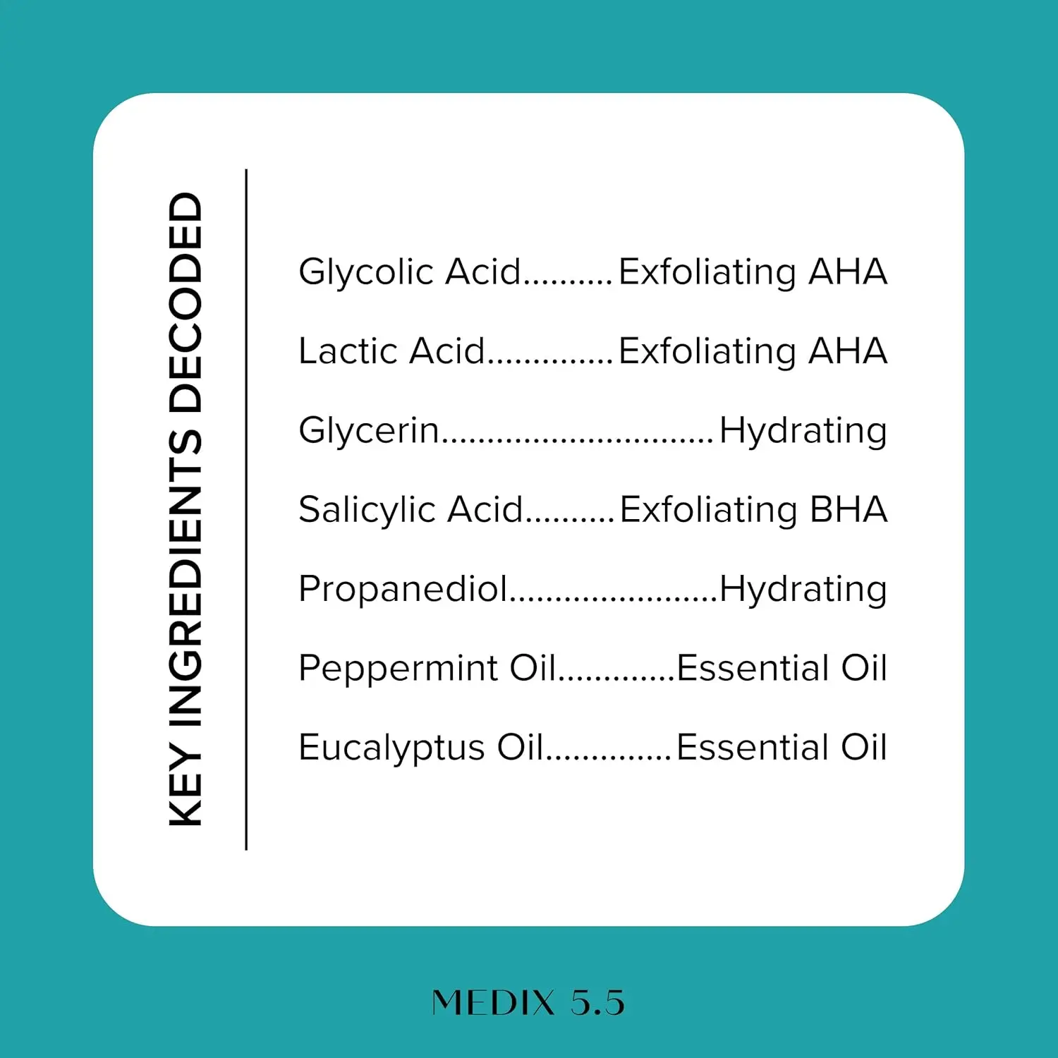 • Contains Glycolic Acid (AHA), Lactic Acid, and Salicylic Acid (BHA).