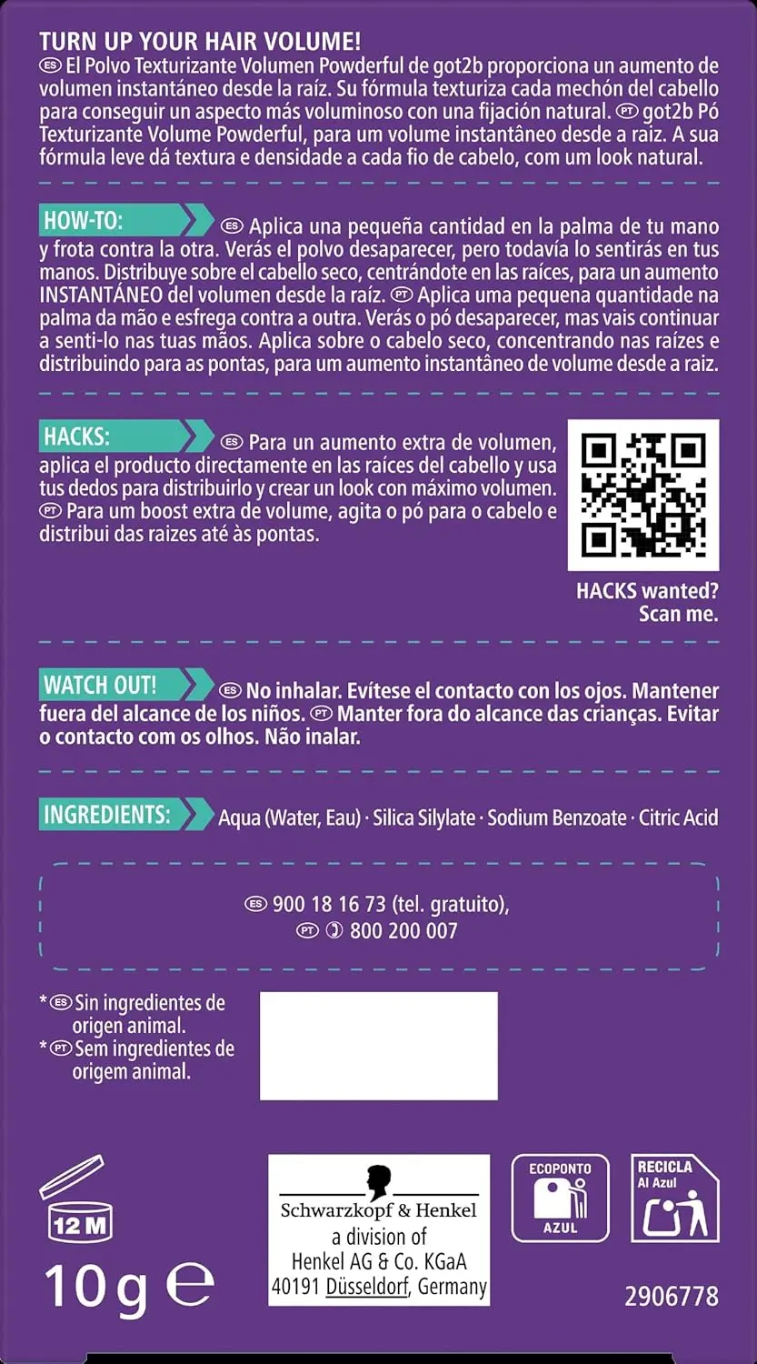 Turn up the volume with got2b POWDERful Volumizing Styling Powder! This innovative hair styling powder delivers instant volume and a natural hold, allowing you to create any voluminous style you desire. The weightless formula texturizes each hair strand, providing a fuller, thicker look without weighing your hair down. Get ready to rock gravity-defying styles with ease! The vegan formula is free from animal-derived ingredients, so you can feel good about what you’re putting in your hair. Plus, the bottle body is made from 50% recycled plastic, making it a more sustainable choice. For an extra boost of volume, simply shake the powder onto your hair and distribute from root to tips. Unlock your hair’s full potential with got2b POWDERful! This volumizing styling powder provides the perfect root boost for any hair type, from fine to thick. Create lasting styles that turn heads with this revolutionary hair product. Get ready to experience the power of powder and transform your hair from flat to fabulous! Say goodbye to limp, lifeless hair and hello to instant volume and texture. The got2b POWDERful Volumizing Styling Powder is your secret weapon for achieving salon-worthy styles at home. Experiment with different looks and discover the endless possibilities of volumized hair!