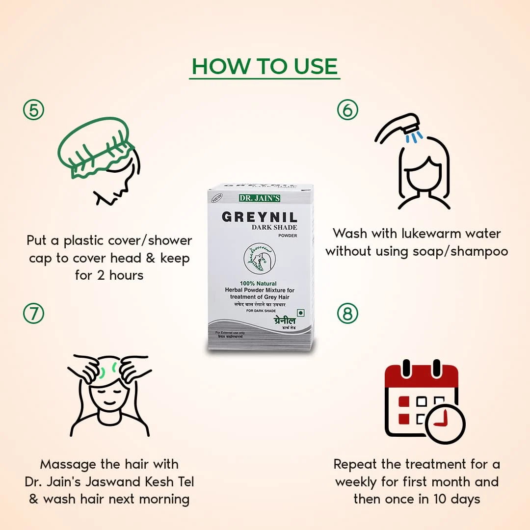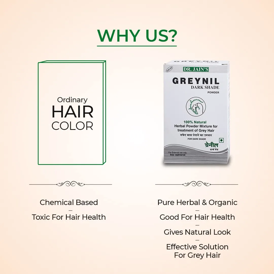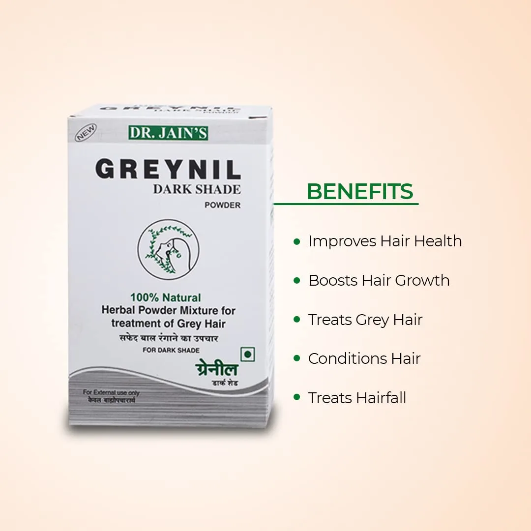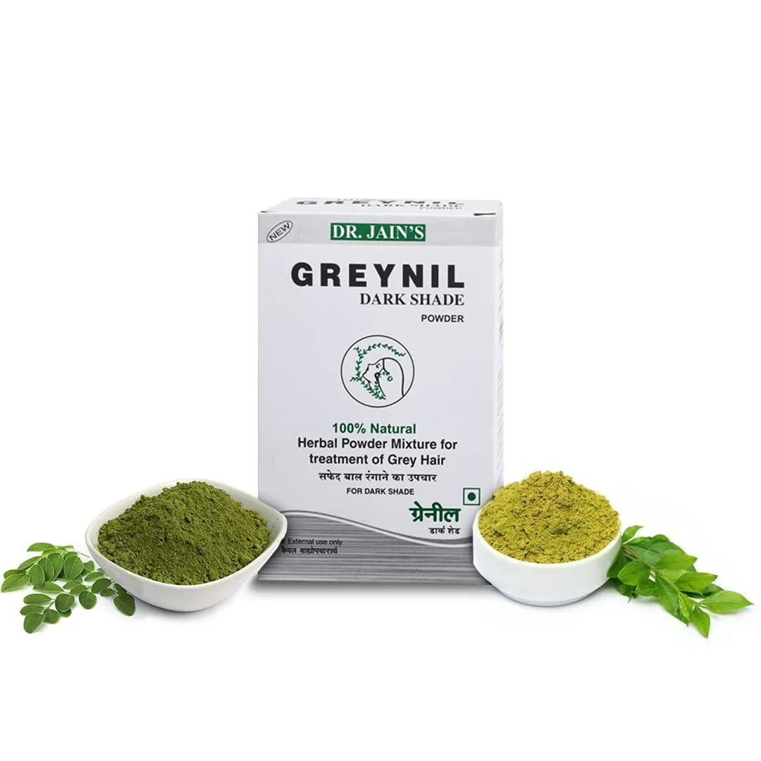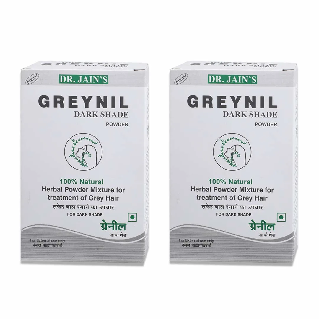Greynil Dark Shade Herbal Hair Powder: 100% natural solution for grey hair. Each pack contains two 100-gram pouches. Gentle, effective, and promotes healthy hair.