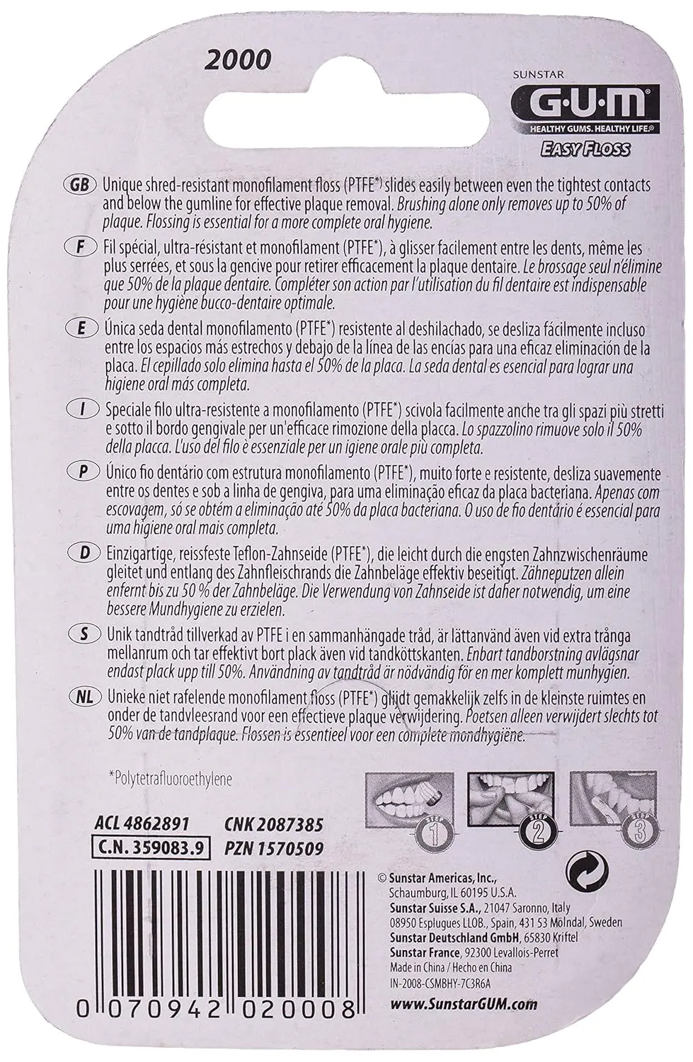 GUM EASY FLOSS revolutionizes your flossing experience, making it simpler and more effective than ever before. Crafted from a specialized PTFE material, this floss effortlessly glides between even the tightest teeth and reaches below the gumline for superior plaque removal. Traditional toothbrushes often miss critical areas where plaque builds up, such as between teeth and beneath the gumline, making flossing an indispensable part of a comprehensive oral hygiene routine. GUM EASY FLOSS is designed with a unique, shred-resistant construction, ensuring a smooth and uninterrupted flossing experience. The mono-filament floss is exceptionally strong, minimizing fraying and breakage, allowing you to focus on thoroughly cleaning your teeth and gums. The floss’s satin-like finish is incredibly soft and gentle on gums, making it ideal for individuals with sensitive gums. Experience the difference with GUM EASY FLOSS and achieve a cleaner, healthier mouth. Incorporate this floss into your daily oral care routine to remove food particles and plaque buildup that contribute to cavities, gum disease, and bad breath. Its ease of use and gentle texture make it a perfect choice for everyone, from those new to flossing to experienced flossers looking for a superior product. Invest in your oral health with GUM EASY FLOSS and enjoy a fresh, clean feeling every day.
