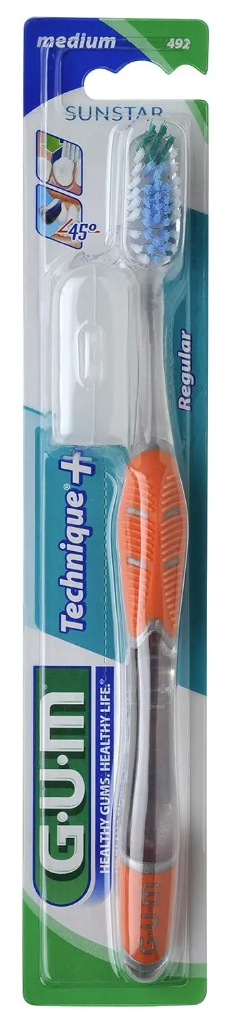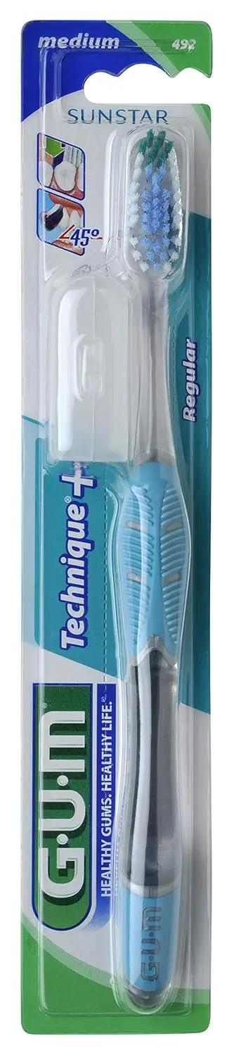 Experience a superior clean with the GUM Technique PRO toothbrush. Scientifically engineered to outperform ordinary toothbrushes, it delivers exceptional plaque removal, particularly in those hard-to-reach areas that often get overlooked. This toothbrush is your ally in maintaining healthy teeth and gums, ensuring a brighter, healthier smile. The unique bi-level bristles are designed for multi-level cleaning. They efficiently target exposed tooth surfaces for a thorough and effective clean. The angled bristles are specifically crafted to reach deep between the teeth, dislodging plaque and food particles. Tapered bristles are the secret weapon for cleaning below and along the gumline, as well as between the teeth, where bacteria often accumulate. The GUM Technique PRO toothbrush features a non-slip, Quad-Grip handle. This handle design provides four strategically placed thumb-pads, guiding you to hold the toothbrush at the optimal 45-degree angle, recommended by dental professionals. Angled bristles gently massage the teeth in various directions, enhancing cleaning effectiveness and promoting gum health. Choose the GUM Technique PRO toothbrush for a professional-level clean at home and experience the difference in your oral hygiene.