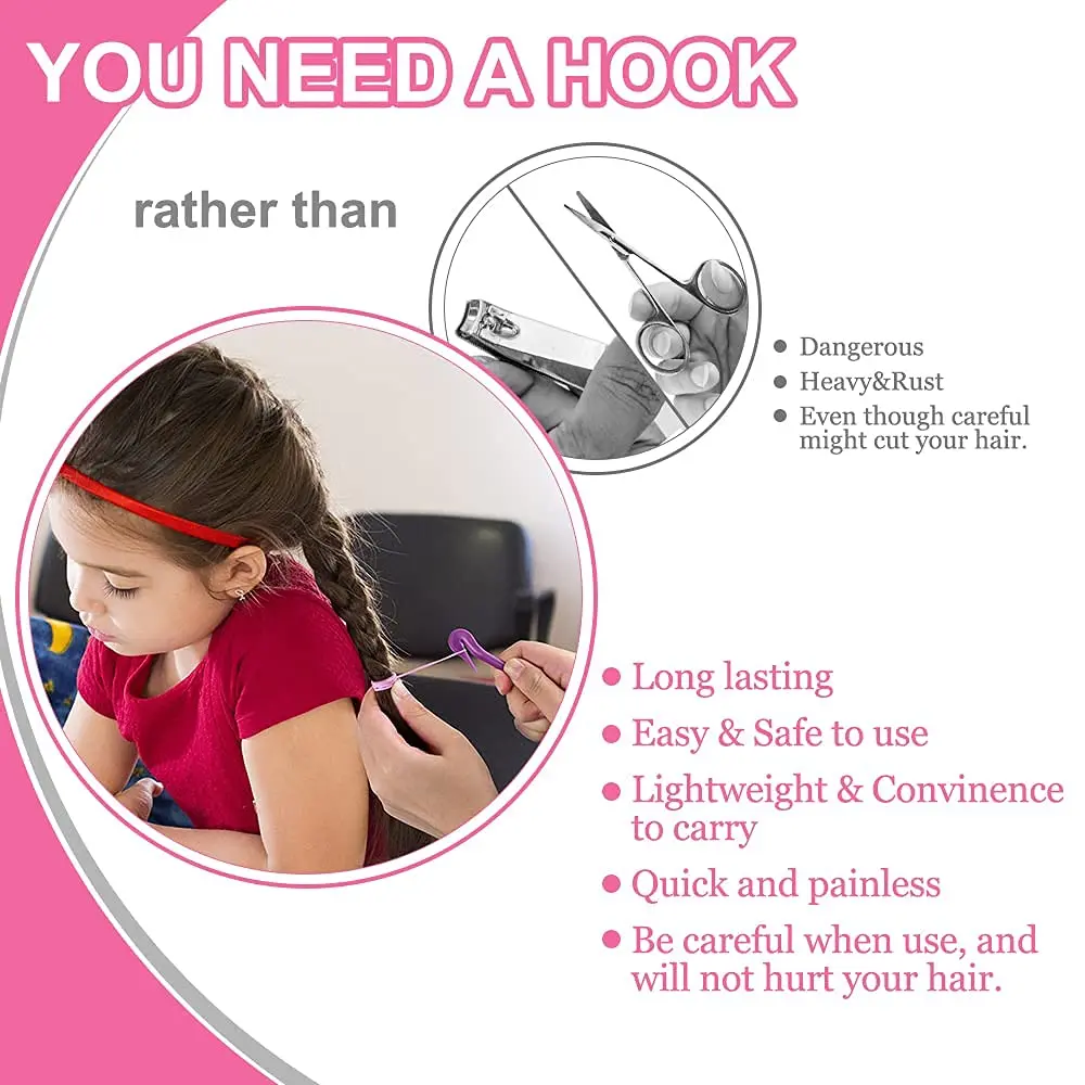 Say goodbye to painful hair elastic removal with our Hair Band Remover Tool! This 4-pack of painless ponytail cutters is a must-have for anyone who regularly uses elastic hair bands. Designed for all hair types, our remover eliminates the risk of damage, tearing, and ripping hair. Children and adults can safely and easily use it. The plastic hair bands remover features a hidden blade for safe use, and the handle is ergonomically designed for a comfortable and secure grip. Using the hook tips, simply pick up the outer elastic (a single band), gently slide it to the hook blade, and cut the band out. Enjoy a painless and tear-free hair untying process. Mothers will especially appreciate this tool, as it eliminates the discomfort associated with removing rubber bands from their daughters’ hair. Each set includes four durable plastic hair band remover cutters in blue, red, purple, and yellow, built to last for years. This tool is a gentle and effective solution for detangling hair elastics without causing pain or breakage. Perfect for daily use, these cutters are a game-changer in hair care routines.