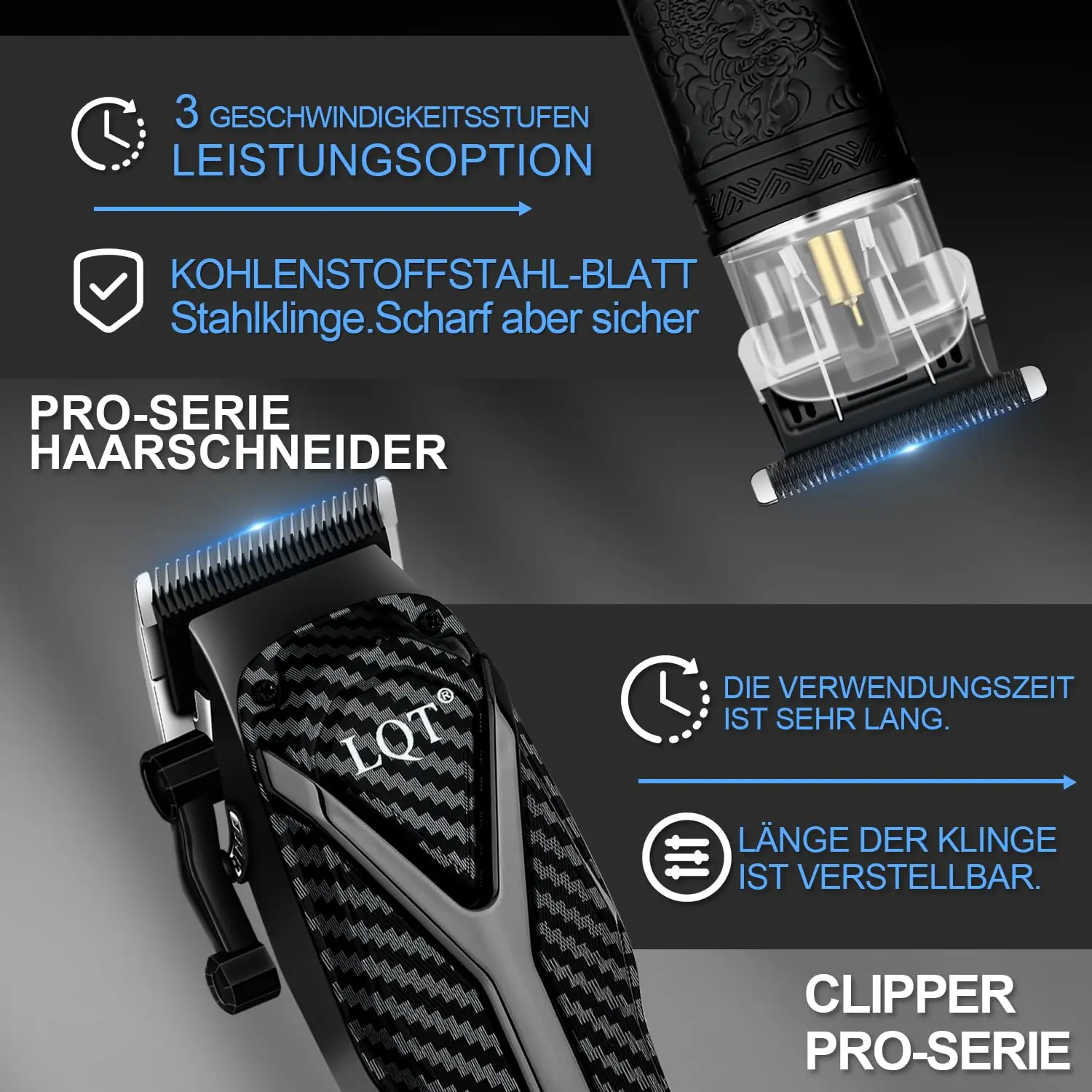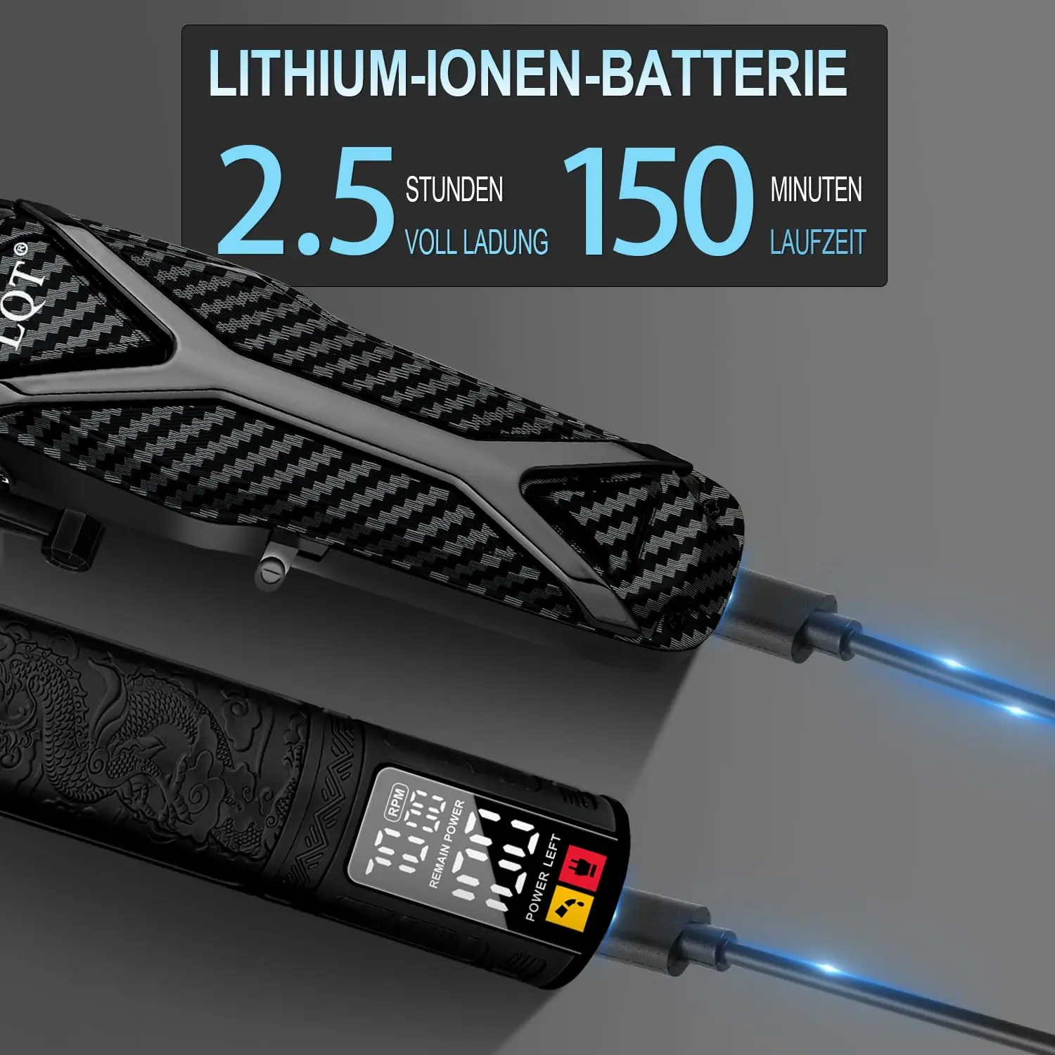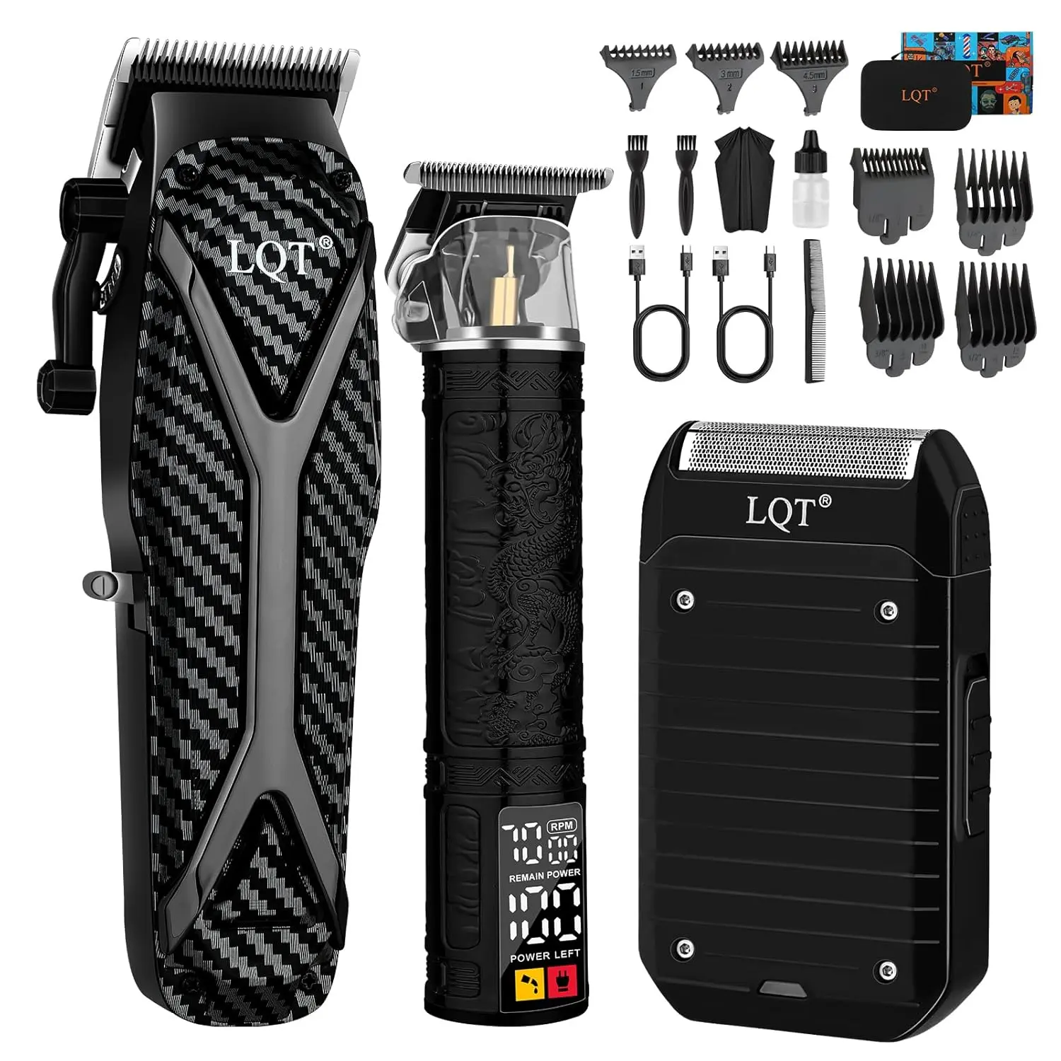 The LQT Hair Clippers are equipped with a long-lasting lithium-ion battery, providing ample power for extended use. The LED smart display clearly indicates the battery level and refill oil status, so you’ll always know when it’s time to recharge or replenish the oil. The unique dragon pattern on the trimmer and sleek black razor add a touch of style to your grooming routine.