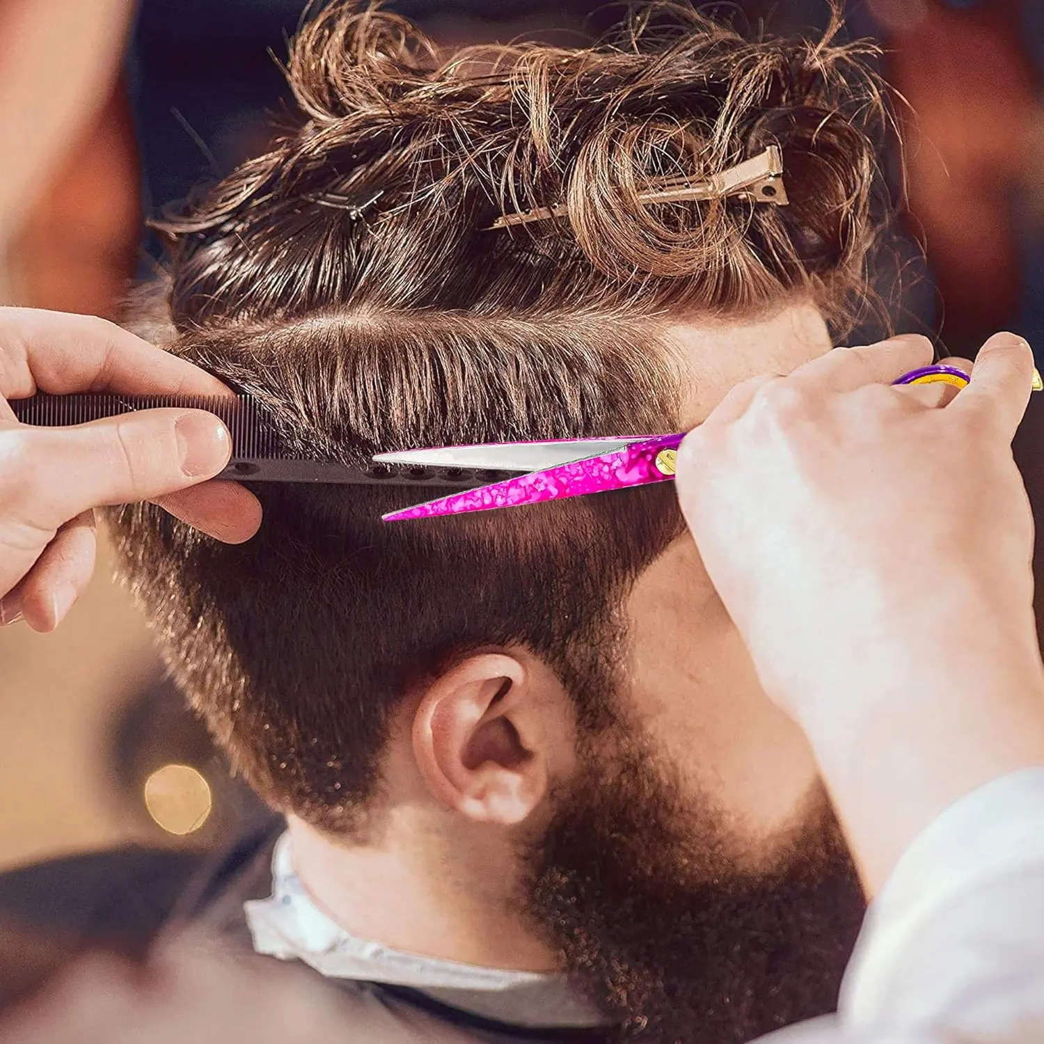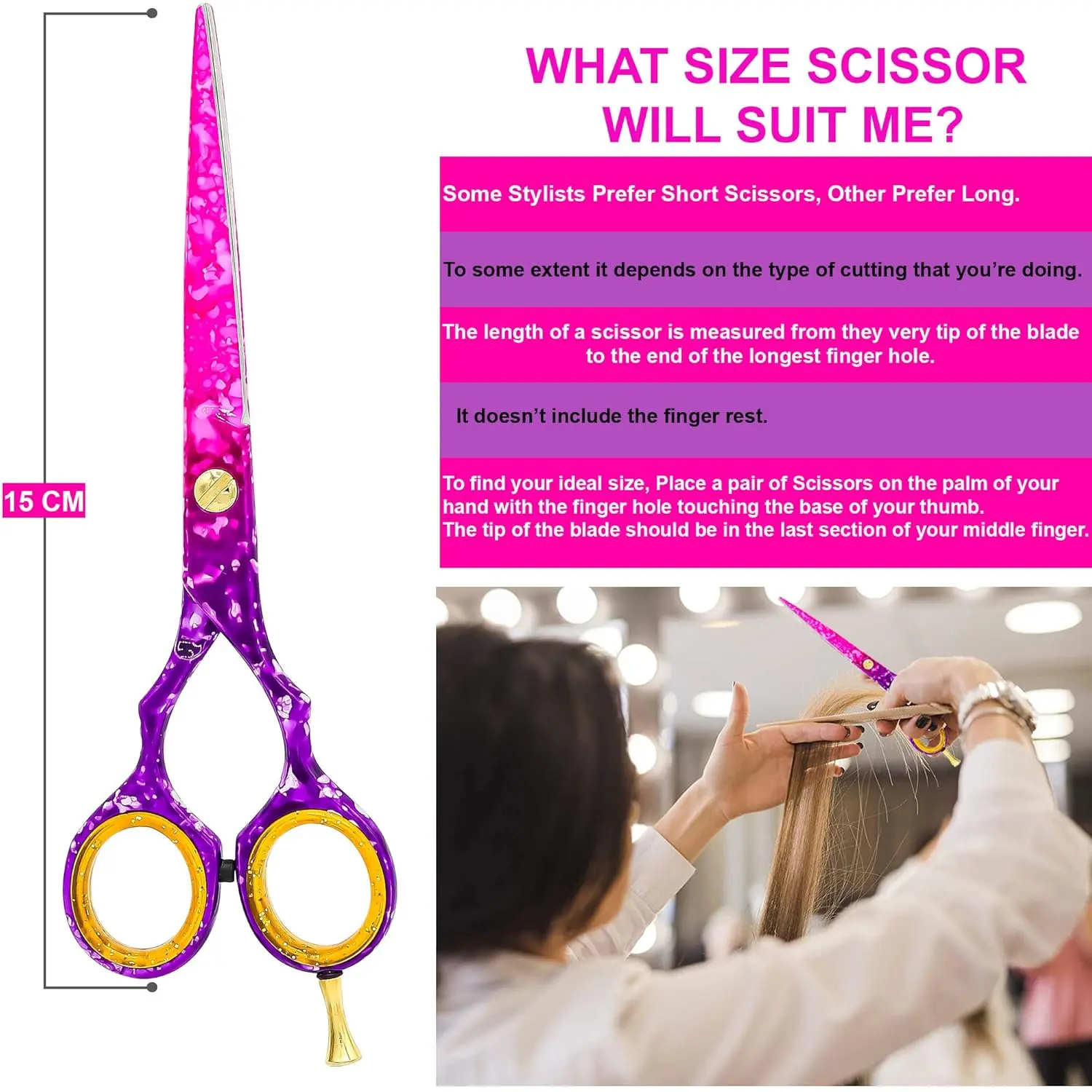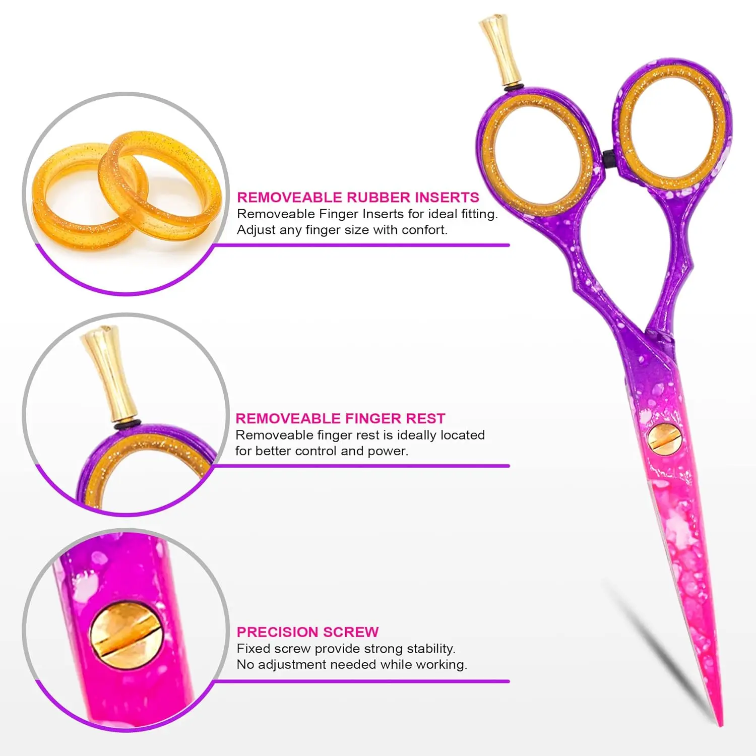 The multi-functional hairdressing scissor measures 5.5 inches in length, offering excellent control and maneuverability. The integrated finger rest enhances comfort during extended use. These professional barber hair cutting scissors are safe and easy to use on men, women, adults, and children. The fixed screw and removable finger rest further contribute to the scissors’ ease of handling. Anyone can confidently use these hair cutting shears.