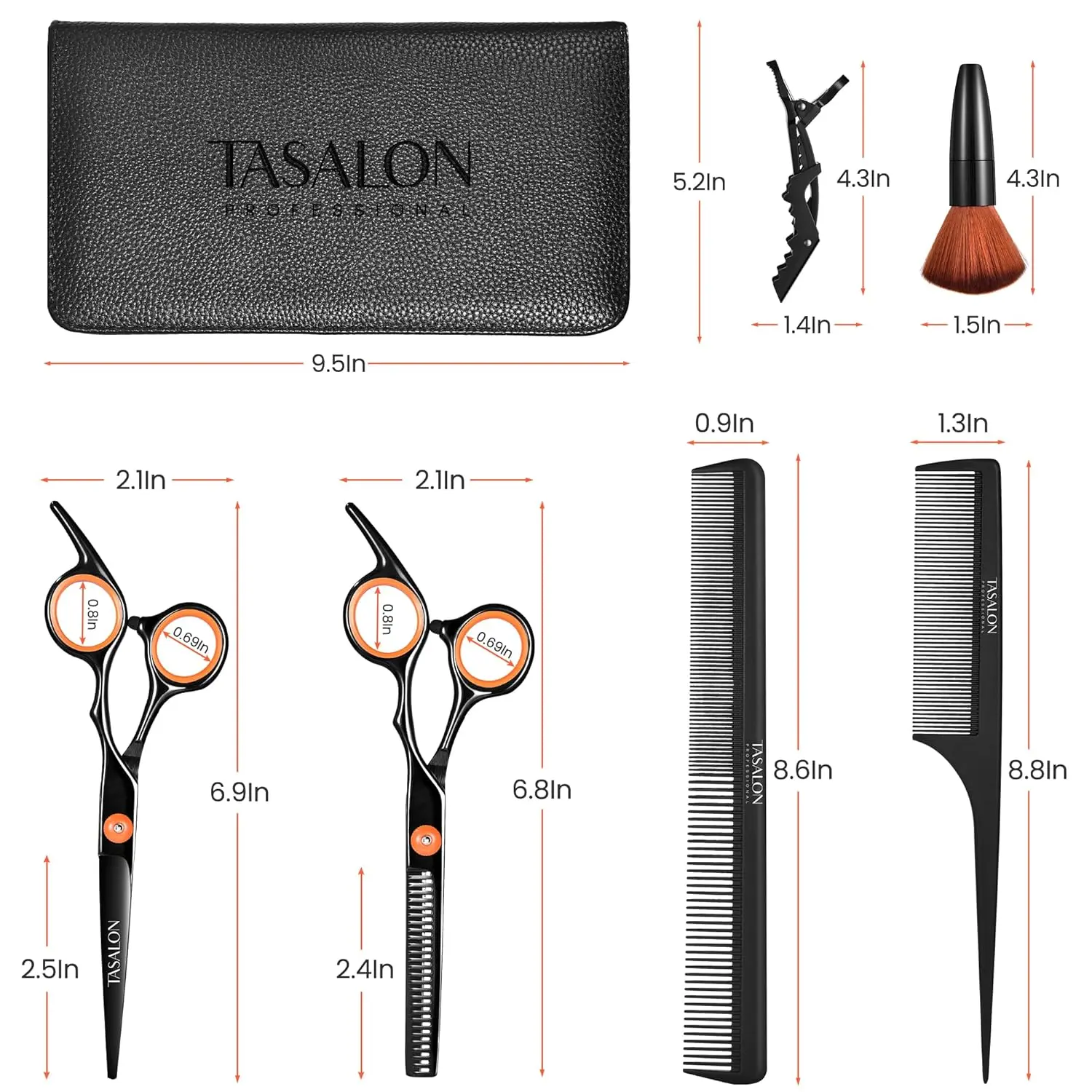 Upgrade your hair cutting experience with the TASALON Hair Cutting Scissors Kit! This comprehensive barber set provides everything you need for professional-quality haircuts at home or in the salon. Our mega-value kit includes a pair of sharp hair scissors, thinning shears to expertly texturize, a thinning comb for blending, a standard hair comb, two hairpins to section and secure hair, a convenient neck duster to remove loose hairs, and a stylish leather bag for easy storage and portability.