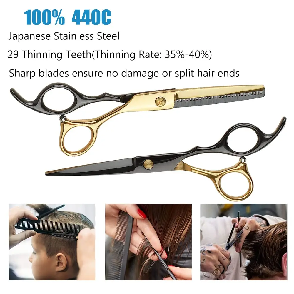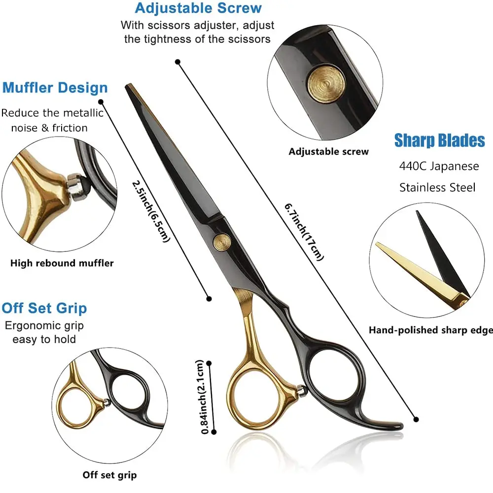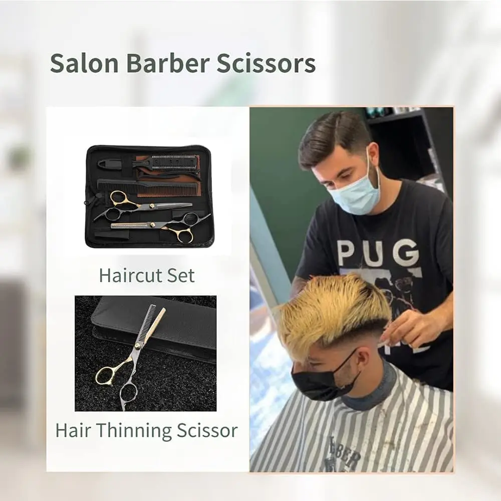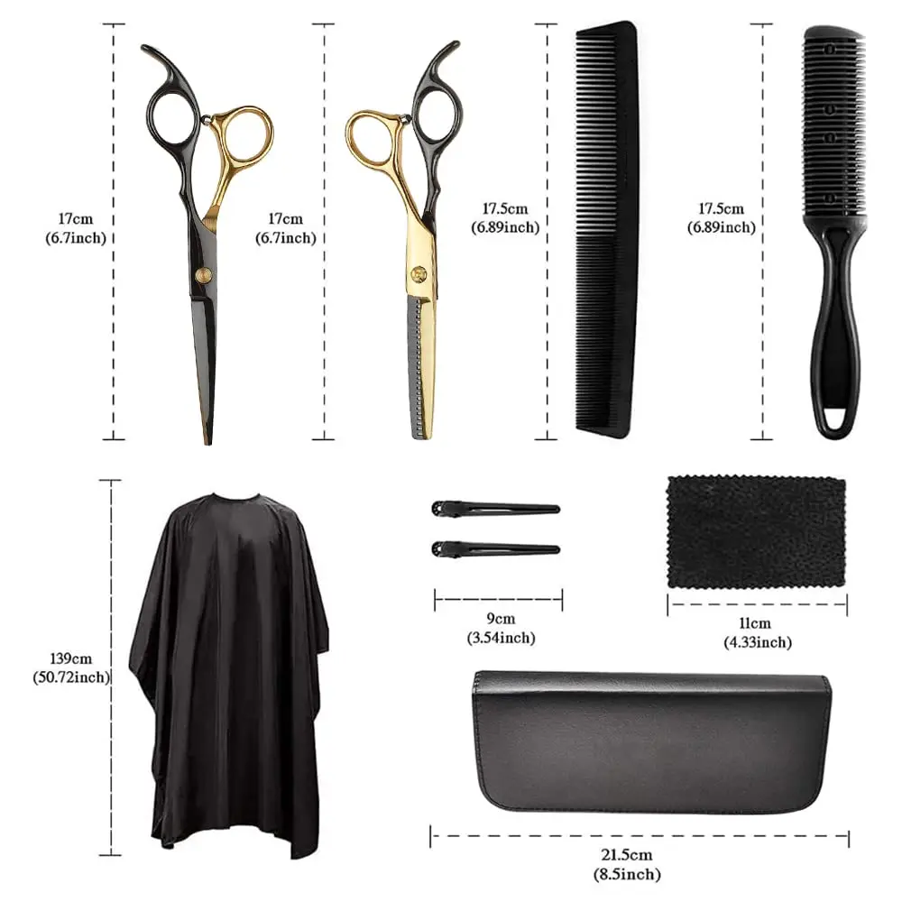 Achieve professional-quality haircuts at home with this comprehensive Hair Cutting Scissors Set. Crafted with precision and designed for both professional stylists and home users, this kit equips you with everything you need for a flawless haircutting experience. The sharp, durable blades made of high-quality Japanese (440) stainless steel ensure clean, even cuts without damaging or splitting hair ends. Their convex edges provide a smooth, effortless cutting action, making them ideal for slicing through both wet and dry hair. The professional coating on the scissors not only enhances their aesthetic appeal but also protects the steel from rust, ensuring long-lasting performance. The latest design incorporates removable finger inserts for a customized and comfortable grip, reducing hand fatigue during extended use. A thoughtfully designed shock absorber at the end of the handle effectively minimizes wear and noise caused by handle collisions, providing a quieter and more pleasant haircutting experience. The adjustable screw system allows for precise tuning, further reducing noise and ensuring optimal blade alignment. This set is not just about functionality; it’s also about value. It includes a pair of precision micro serrated scissors for detailed work and texturizing, a pair of conventional scissors for general cutting, two hair clips for sectioning, a comb for styling, a salon cape to protect clothing, a cleaning cloth to maintain the scissors, a thinning comb for creating volume and texture, a collection bag for convenient storage, and a regulator to adjust the tension of the scissors. This complete kit makes a perfect gift for aspiring stylists, barbers, or anyone who wants to maintain their hairstyle at home. With this set, you can create stylish haircuts with ease and precision, saving time and money on salon visits.
