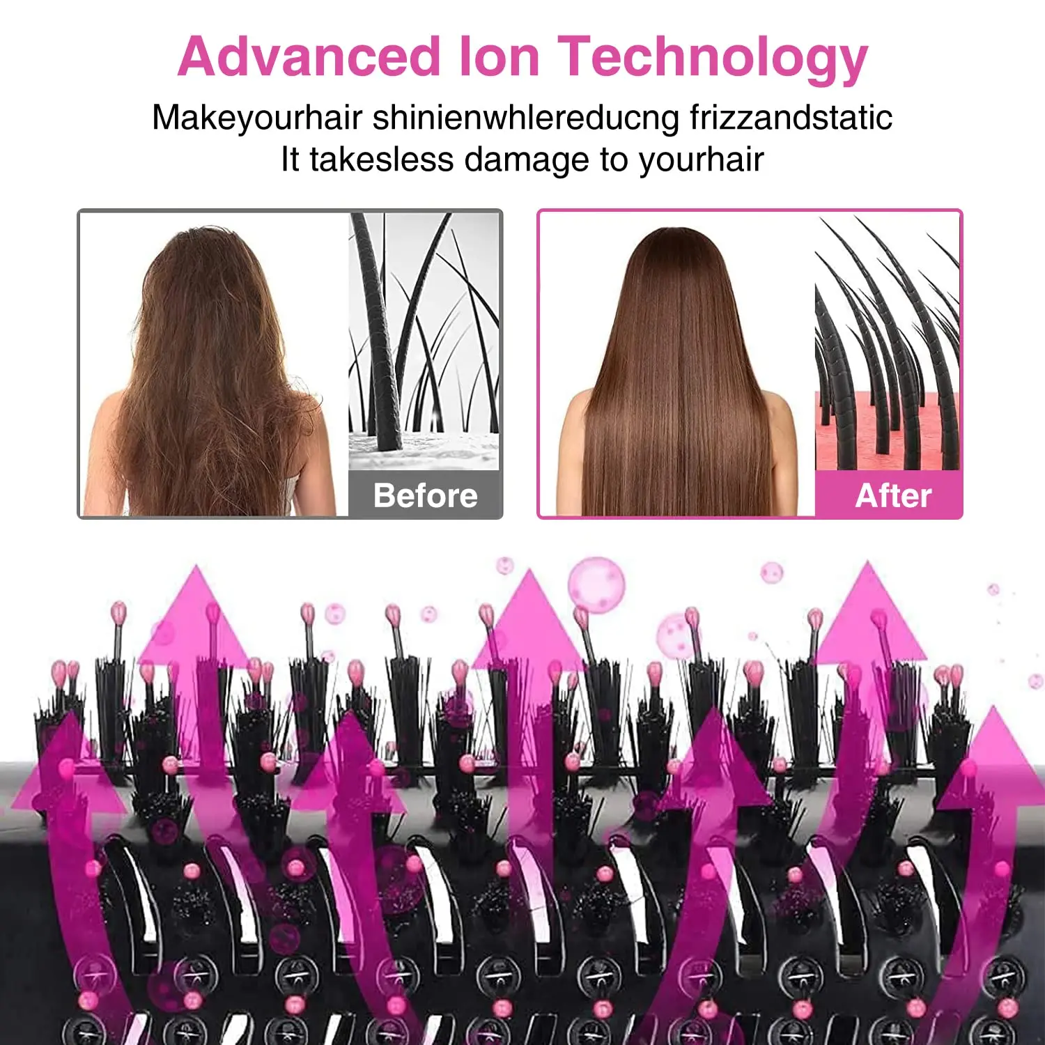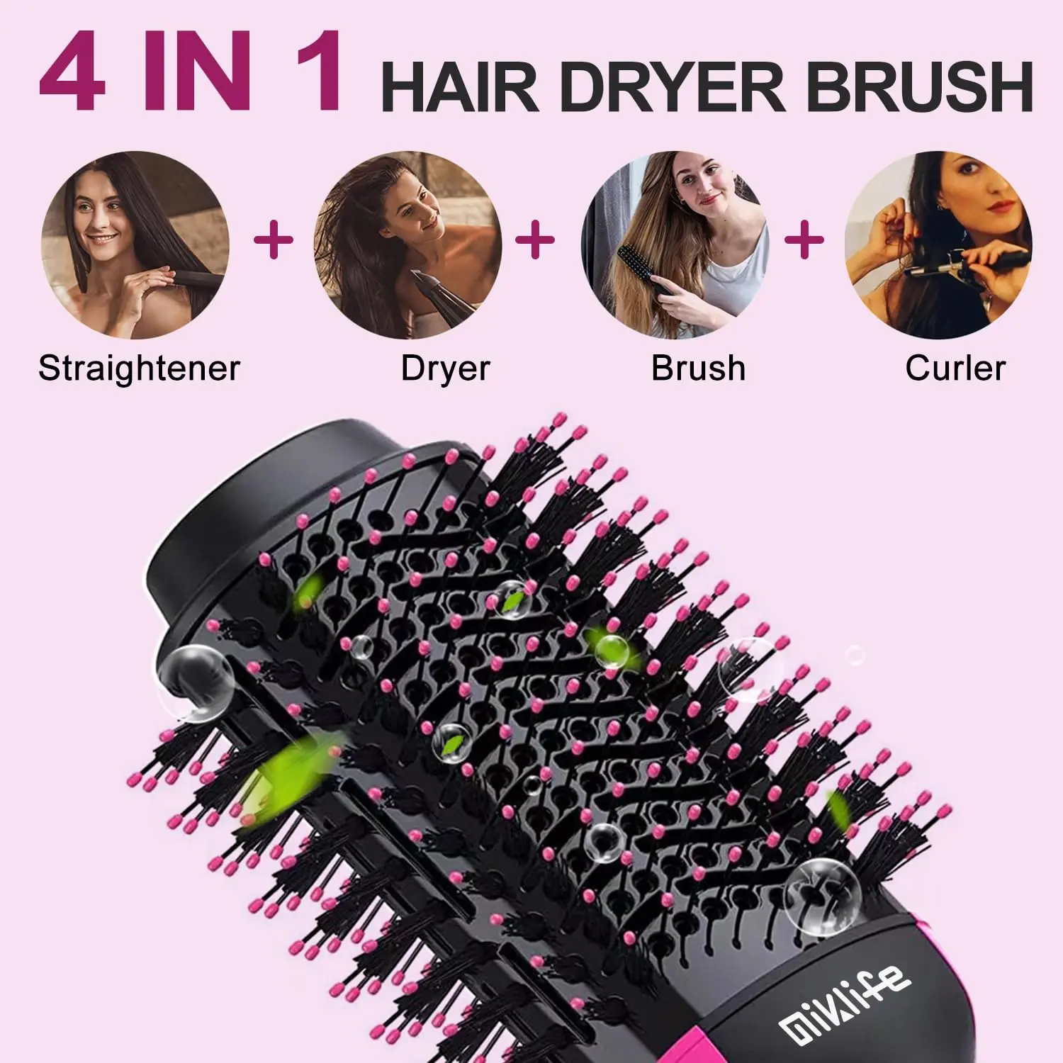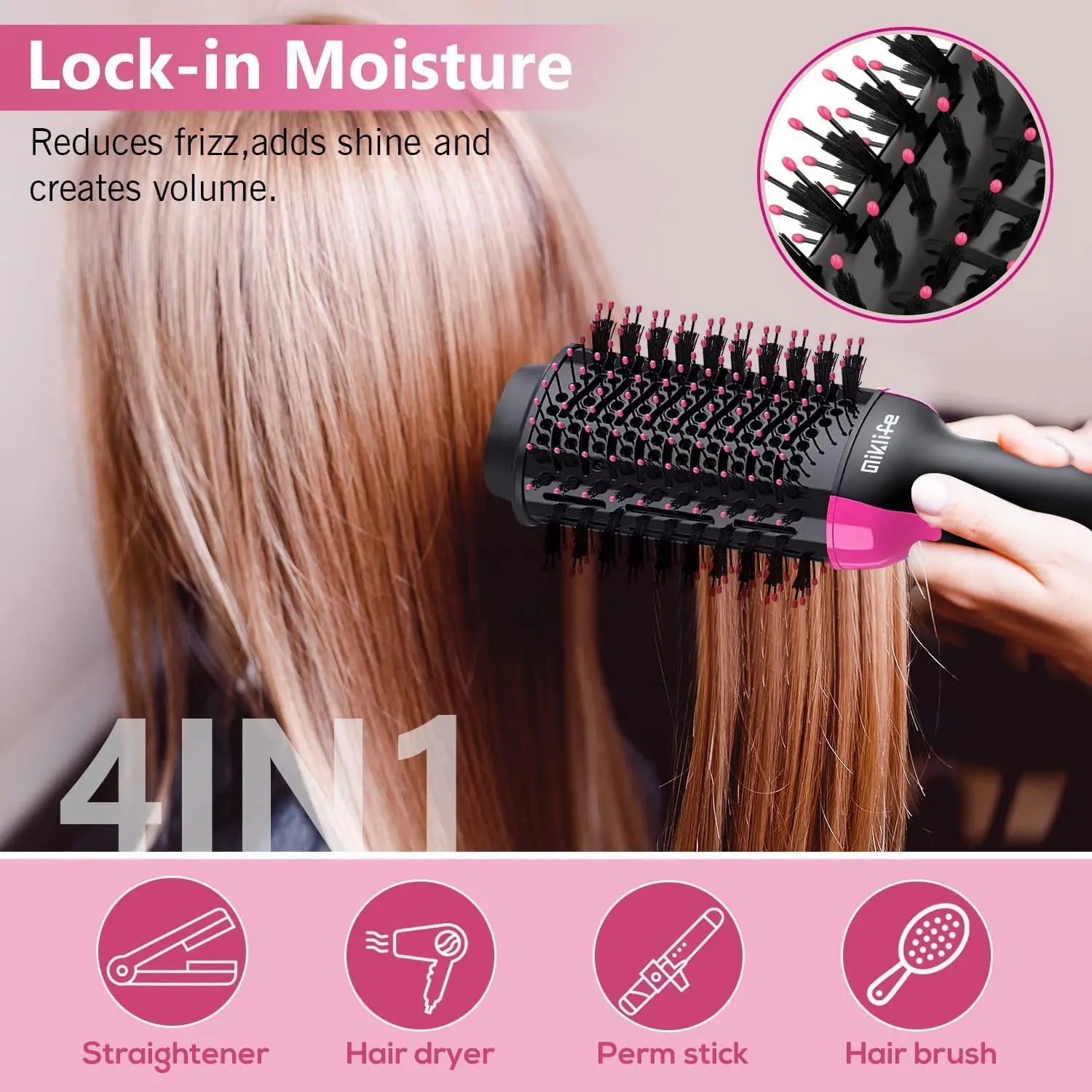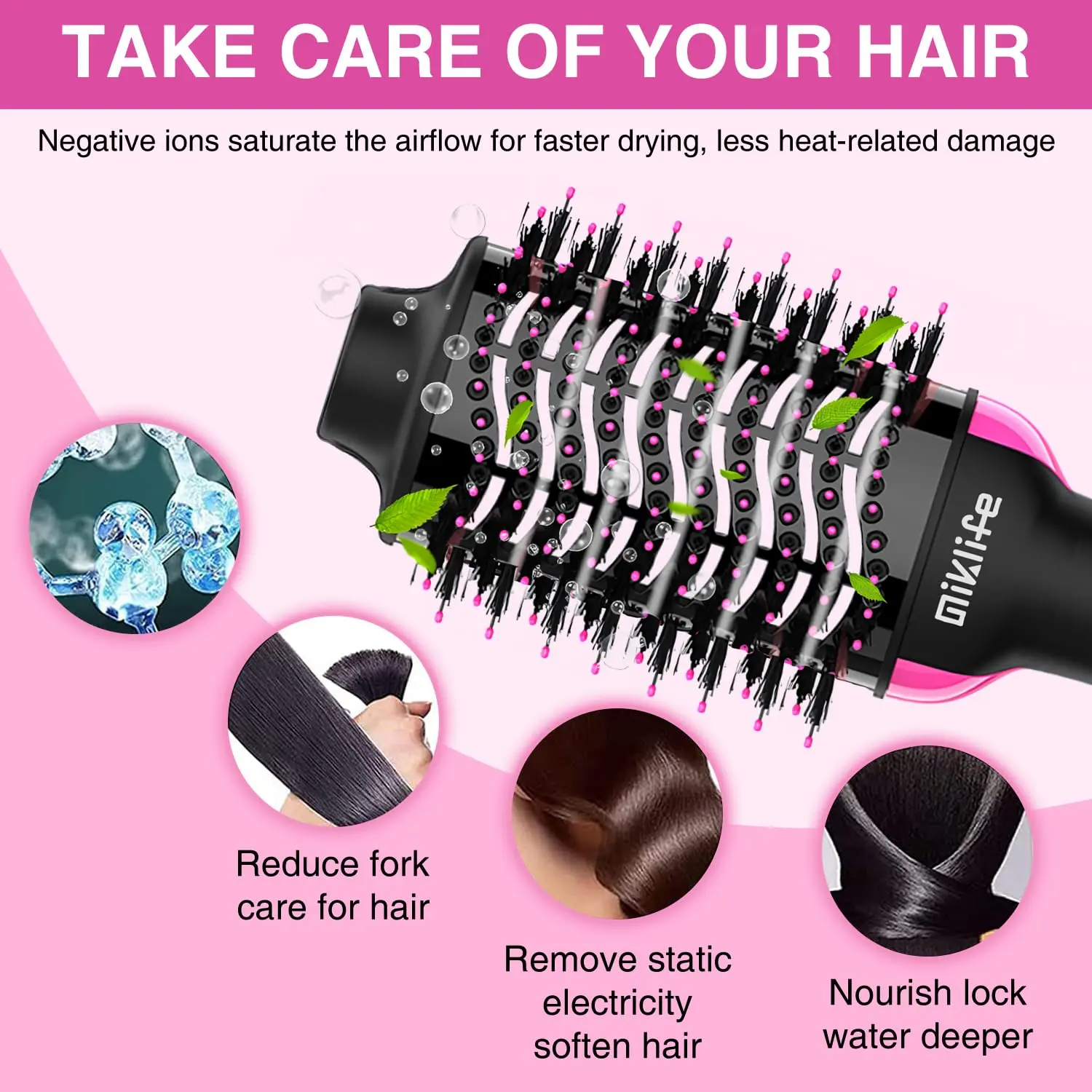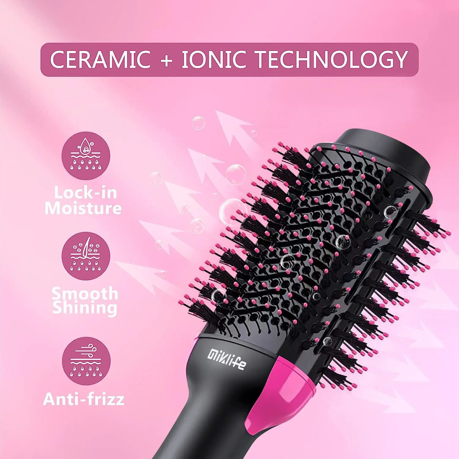 Achieve salon-worthy hair at home with the Miklife Hair Dryer Brush! This innovative one-step volumizer combines the power of a hair dryer with the styling capabilities of a round brush, allowing you to dry, straighten, curl, and volumize your hair in a single step. The ceramic titanium barrel ensures even heat distribution, minimizing heat damage and promoting healthy, shiny locks. Negative ion technology further enhances your hair’s health by locking in moisture, reducing frizz and static, and leaving you with smooth, lustrous results. With three heat/speed settings and a cool option, you can customize the drying and styling process to suit your specific hair type and desired look. The unique oval-shaped barrel features 360° airflow and titanium plates for smoothing, while the round edges create incredible volume and shape. The combination of nylon pin and tufted bristles gently detangles hair, improves volume, and adds shine. Say goodbye to bad hair days and hello to effortless, gorgeous hair with the Miklife Hair Dryer Brush! This versatile tool delivers professional results in a fraction of the time, making it a must-have for anyone looking to simplify their hair care routine and achieve stunning, salon-quality styles at home. The 1000W motor provides powerful drying performance, while the 220V voltage ensures compatibility. Experience the convenience and effectiveness of the Miklife Hair Dryer Brush and unlock your hair’s full potential!