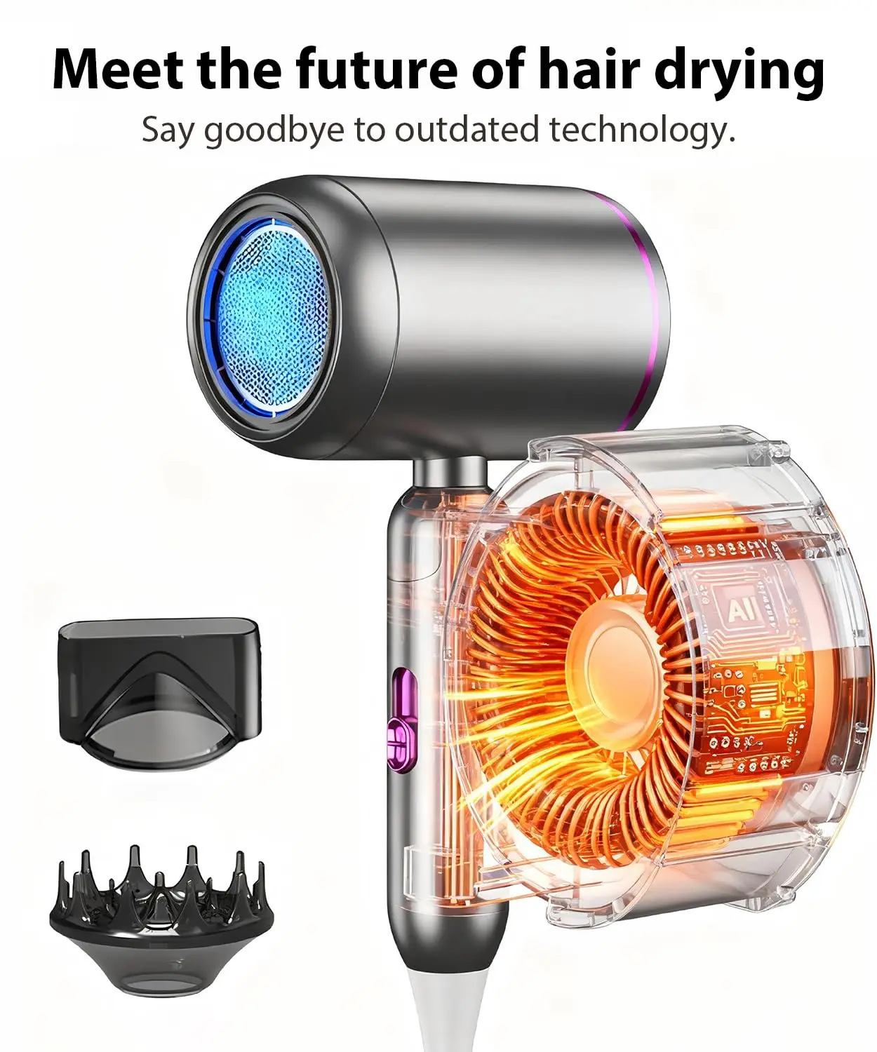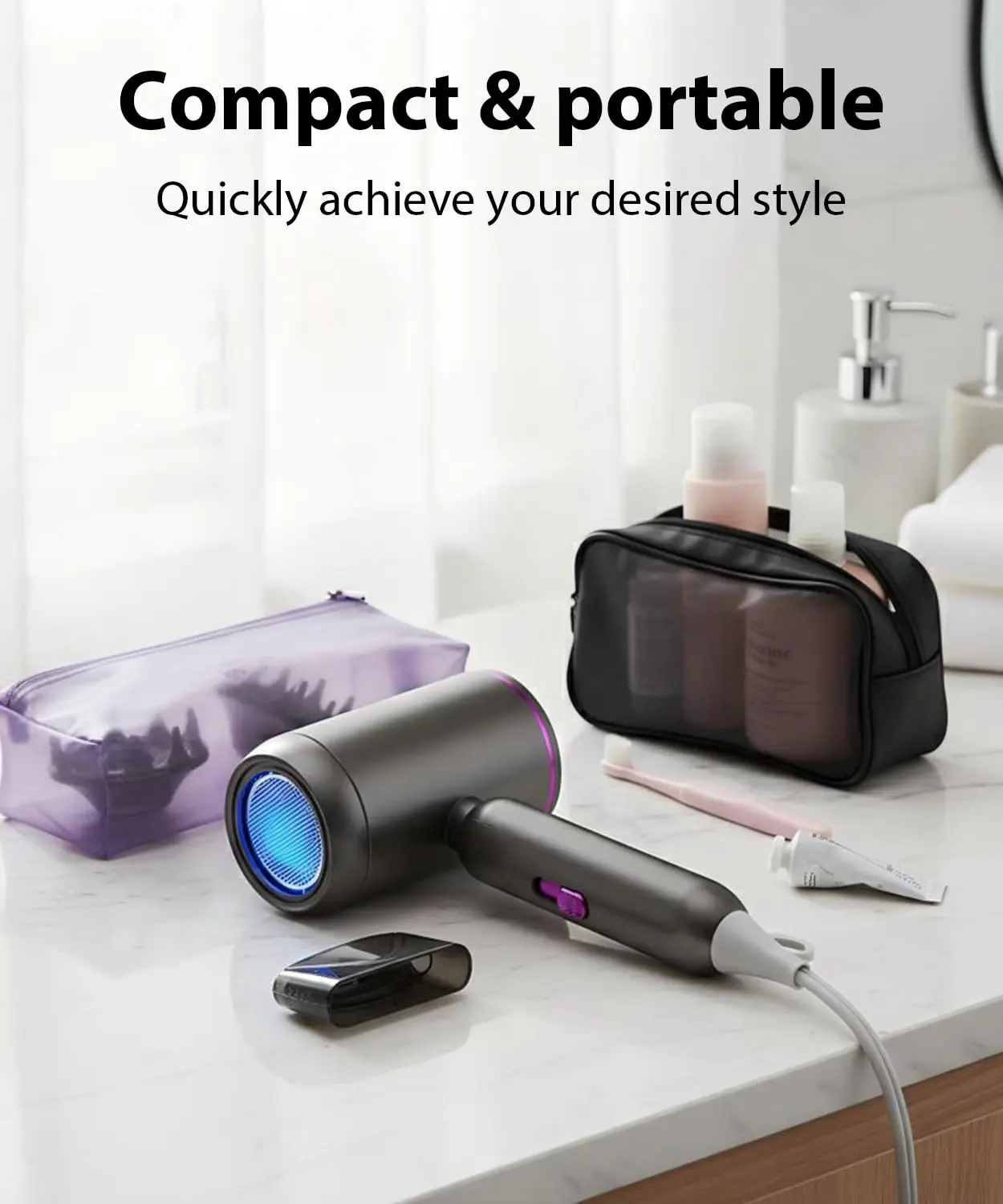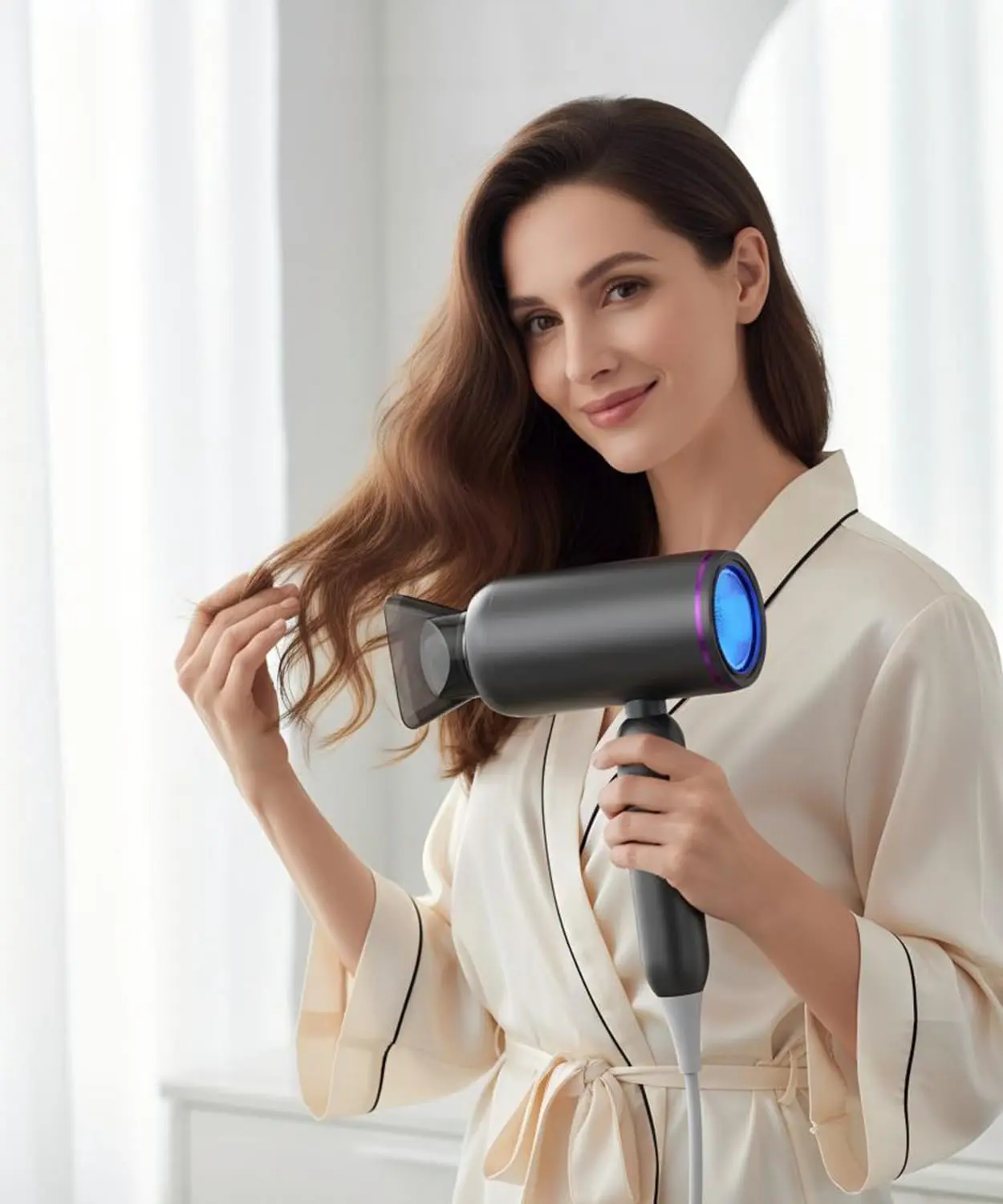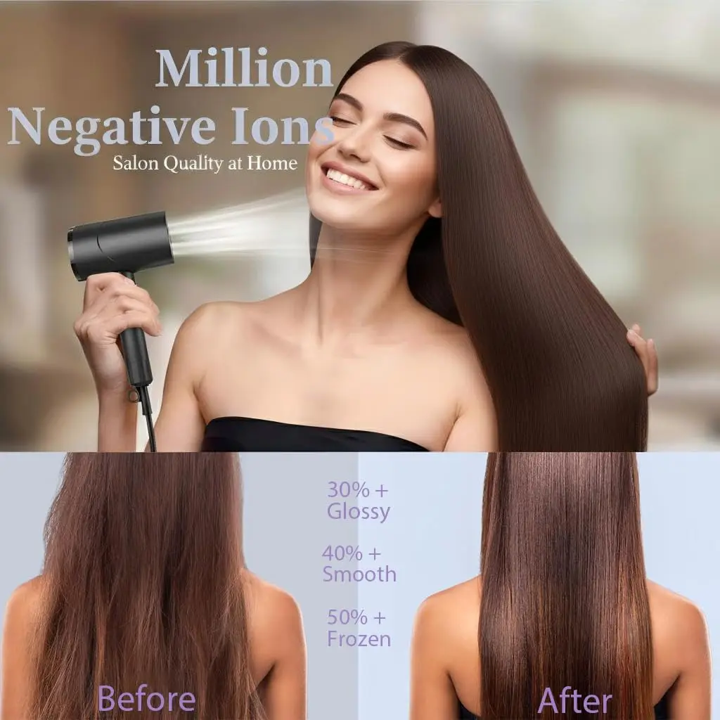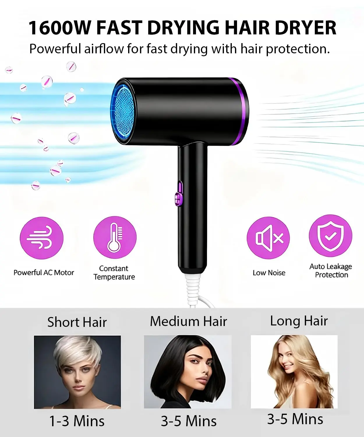 Achieve salon-quality results at home with our powerful and efficient hair dryer. Equipped with a 1600W motor and an advanced aerodynamic design, this blow dryer delivers high-speed airflow that drastically reduces drying time by up to half, minimizing heat exposure and promoting healthier, more vibrant hair. Harness the power of ionic technology, which releases millions of negative ions to neutralize static, seal hair cuticles, and lock in essential moisture. Say goodbye to frizz and hello to lasting shine.