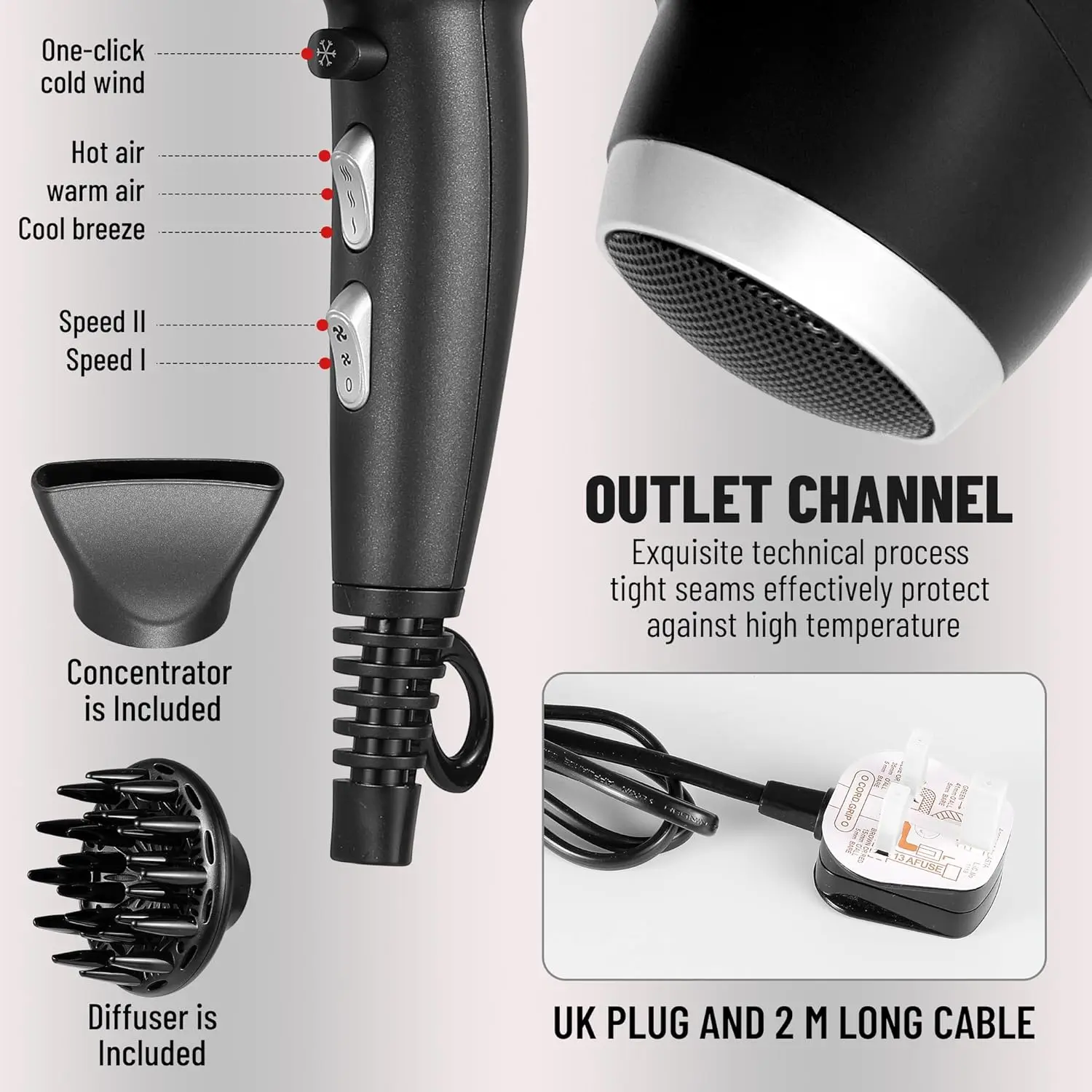 Our complete styling kit includes a diffuser attachment, perfect for enhancing natural curls and waves, and a concentrator nozzle for achieving sleek, straight styles with precision. The cool shot button provides a burst of cool air to set your style and prevent heat damage. Designed with user comfort in mind, this hair dryer features a lightweight ergonomic handle, a low-noise design, and a generous 2-meter cable for effortless maneuverability. The removable filter makes cleaning quick and easy, ensuring optimal performance for years to come. Whether you’re at home or on the go, this versatile hair dryer is your perfect styling companion. Get ready to experience the difference!