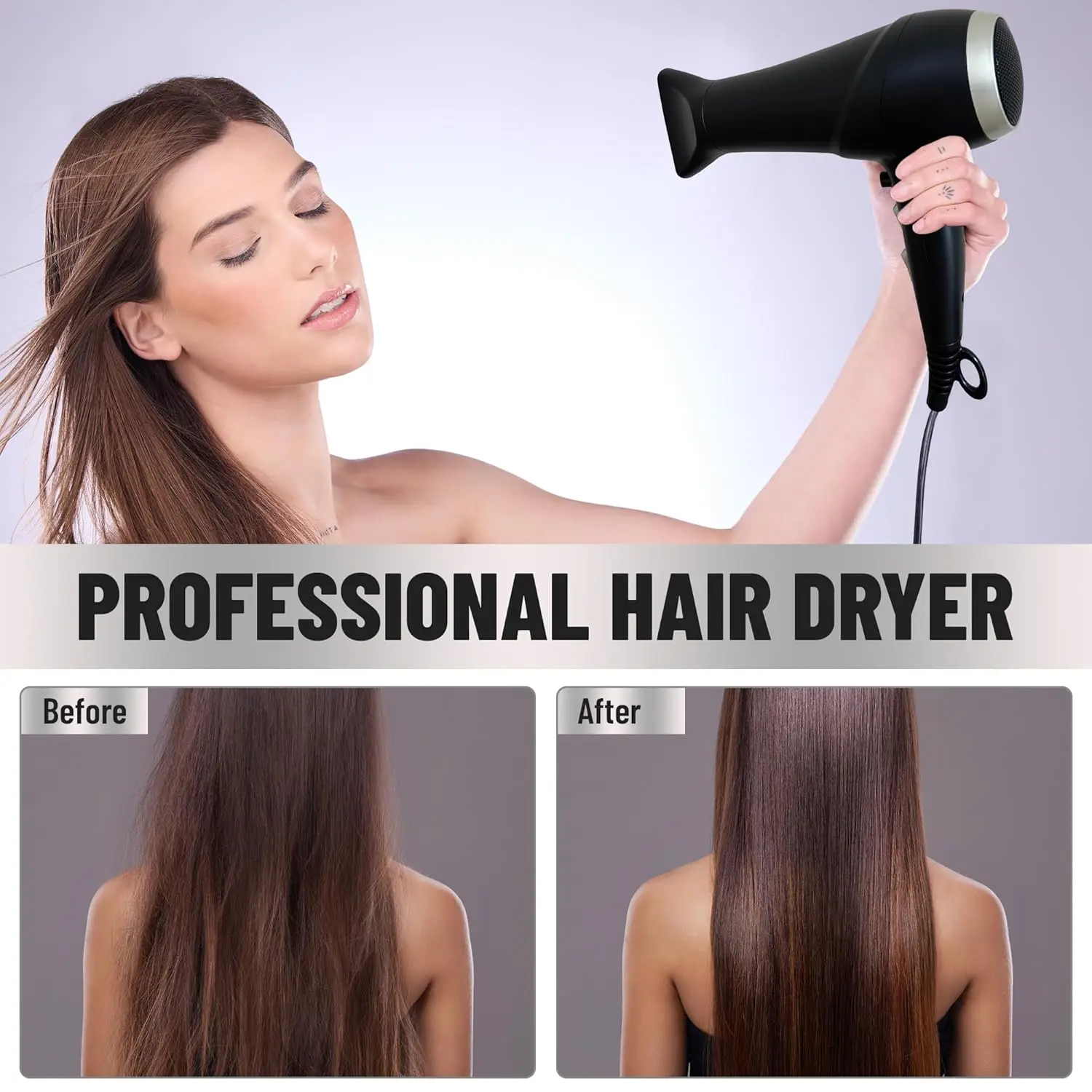 Achieve salon-worthy hairstyles from the comfort of your home with our professional-grade hair dryer. Equipped with a powerful 2200W AC motor, this dryer delivers 3X faster drying compared to conventional models, significantly reducing styling time. Whether you have thick, curly hair that takes forever to dry or fine, delicate strands, our dryer provides customized heat and speed settings to meet your unique needs. The advanced ionic technology releases millions of negative ions, effectively neutralizing static and frizz, sealing the hair cuticle for enhanced shine, and locking in essential moisture. Say goodbye to dry, damaged hair and hello to smooth, healthy-looking locks!