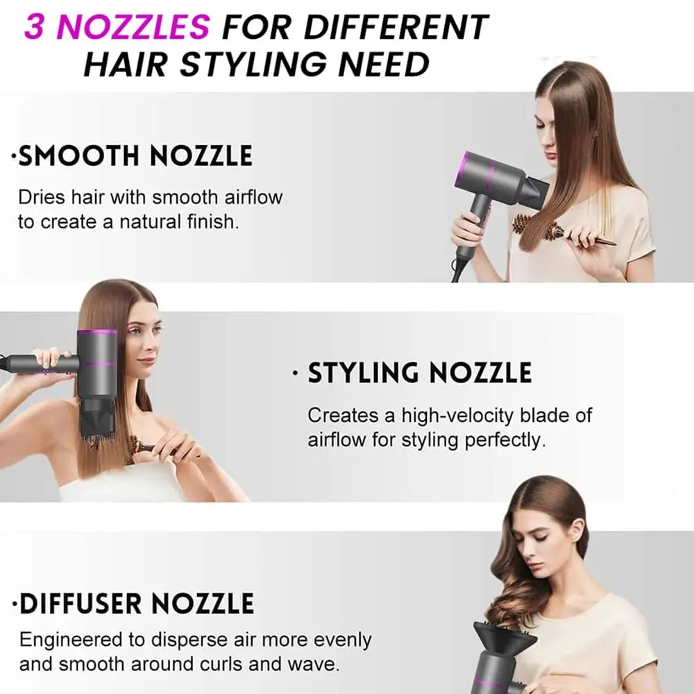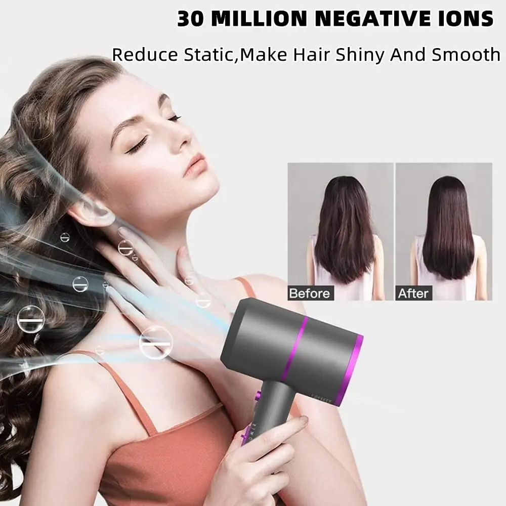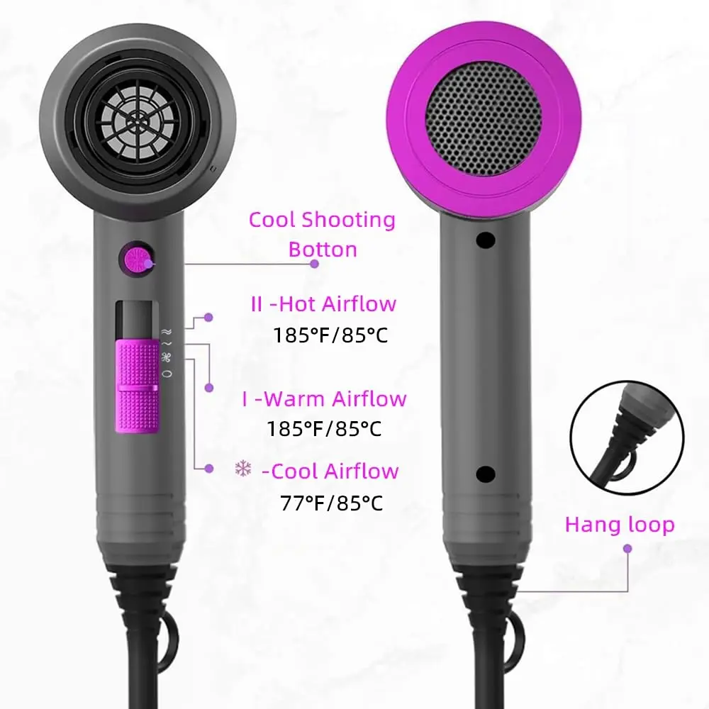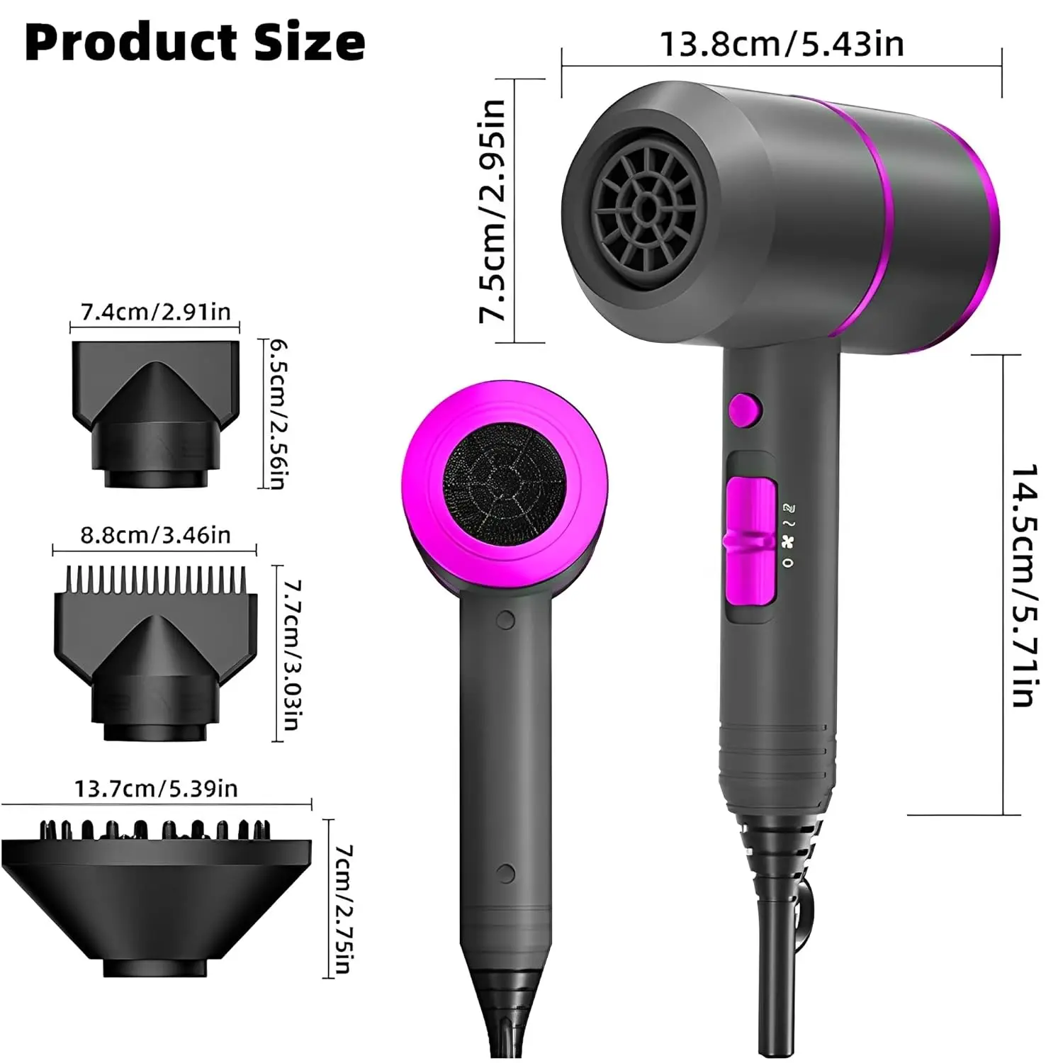 Experience salon-quality hair drying at home with our advanced hair dryer, designed for speed, safety, and versatility. This dryer boasts a powerful, high-speed motor that reaches up to 20,000 rpm, significantly reducing drying time, even for thick, wavy, or curly hair. Its lightweight and portable design makes it an ideal travel companion, ensuring you can maintain your style on the go. Prioritizing hair health, the integrated diffuser technology distributes heat evenly, minimizing damage caused by concentrated hot air. The dryer also features electromagnetic low radiation, offering a safer and healthier styling experience compared to conventional dryers. Customize your styling with ease using the intuitive speed control knob and three distinct heat settings. Whether you’re aiming for sleek straight styles or bouncy curls, this dryer provides the control you need. Included attachments cater to diverse styling needs. The concentrator nozzle delivers focused airflow for creating smooth, straight looks, while the diffuser is specifically designed to enhance natural curls and waves, making it an essential tool for curly hair enthusiasts. Safety is paramount, and this hair dryer is equipped with a safety plug to protect you and your family from short circuits caused by electrical leakage. Use it with confidence and enjoy the perfect styling experience. This hair dryer makes an excellent gift for birthdays, Mother’s Day, Christmas, or any special occasion. We stand behind our product with a 12-month free return and exchange policy. If you have any questions or concerns, our dedicated customer support team is ready to assist you. Achieve faster drying, healthier hair, and customizable styles with our powerful and versatile hair dryer.