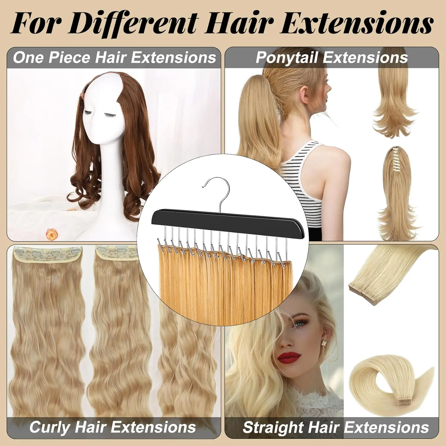 Tired of tangled, messy hair extensions cluttering your space? The RESOVO Hair Extension Holder is the ultimate solution for keeping your extensions organized, protected, and easily accessible. This innovative hanger features 15 rotating metal hooks, designed to accommodate a variety of hair extension styles and lengths. The wide rack design is perfect for hanging wide wefts or managing multiple smaller pieces, maximizing space and ensuring your extensions stay in pristine condition.