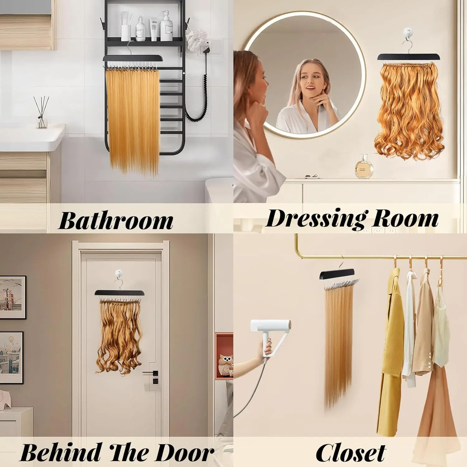 This versatile storage solution can be easily integrated into various spaces, including closets, laundry rooms, bathrooms, dressing rooms, or even behind doors, providing a stylish and efficient way to organize your hair extensions. Constructed with a durable painted wooden frame, this hair extension organizing rack is built to last, ensuring your extensions are safely stored and readily available whenever you need them. It’s the perfect tool for maximizing space in your home or salon, keeping your extensions neatly organized and accessible for all your styling needs. Say goodbye to clutter and hello to organized beauty with the RESOVO Hair Extension Holder!