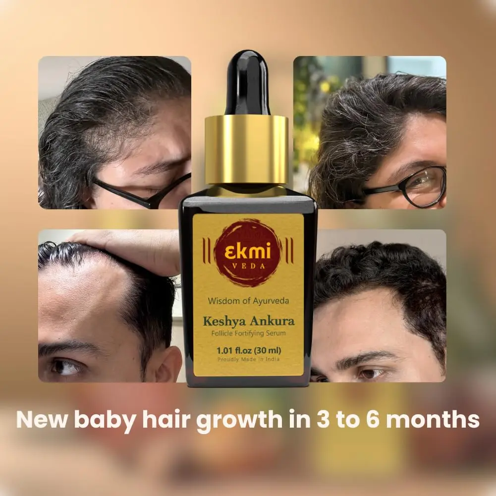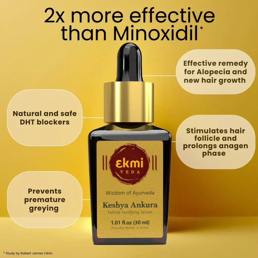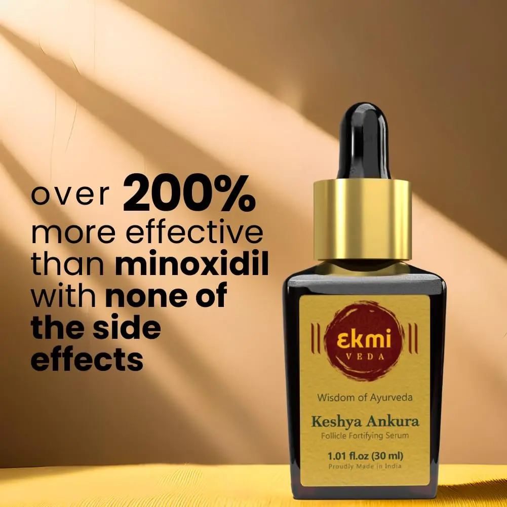 Unlock your hair’s full potential with our Hair Growth Serum DHT Blocker, a powerful blend of ancient Ayurvedic wisdom and modern science. This potent serum combines the time-tested benefits of Brahmi, Bhringraj, and Amla with cutting-edge ingredients like Redensyl and Capilia Longa to target the root causes of hair loss and promote healthy, vibrant hair growth. Experience the revitalizing power of nature as our herbal extracts deeply penetrate the scalp, nourishing and stimulating hair follicles for increased thickness and density. Our overnight serum is designed for maximum absorption, allowing the potent blend of natural ingredients to work while you sleep. Enriched with Rosemary and Licorice Root, our formula acts as a natural DHT blocker, preventing the shrinking of hair follicles and combating hair loss. We’re committed to providing a safe and effective solution, which is why our serum is vegan, cruelty-free, paraben-free, sulfate-free, dermatologically tested for sensitive skin, and silicone-free. Backed by scientific research, our serum utilizes Redensyl to boost hair density and thickness, while Capilia Longa inhibits DHT production, preventing hair follicle miniaturization. Clinically proven ingredients work to prolong the anagen (growth) phase of hair follicles, resulting in visibly thicker, fuller hair over time. For optimal results, incorporate our serum into your regular hair care routine by using it in conjunction with Ekmiveda’s Hair Growth Oil and Hair Nourishing Shampoo for 3-6 months. Experience the difference and rediscover the confidence that comes with healthy, luscious hair. Say goodbye to thinning hair and hello to a revitalized scalp with our carefully crafted Ayurvedic blend, designed to restore your hair’s natural beauty and vitality. Embrace the power of tradition and innovation for a healthier, fuller head of hair.